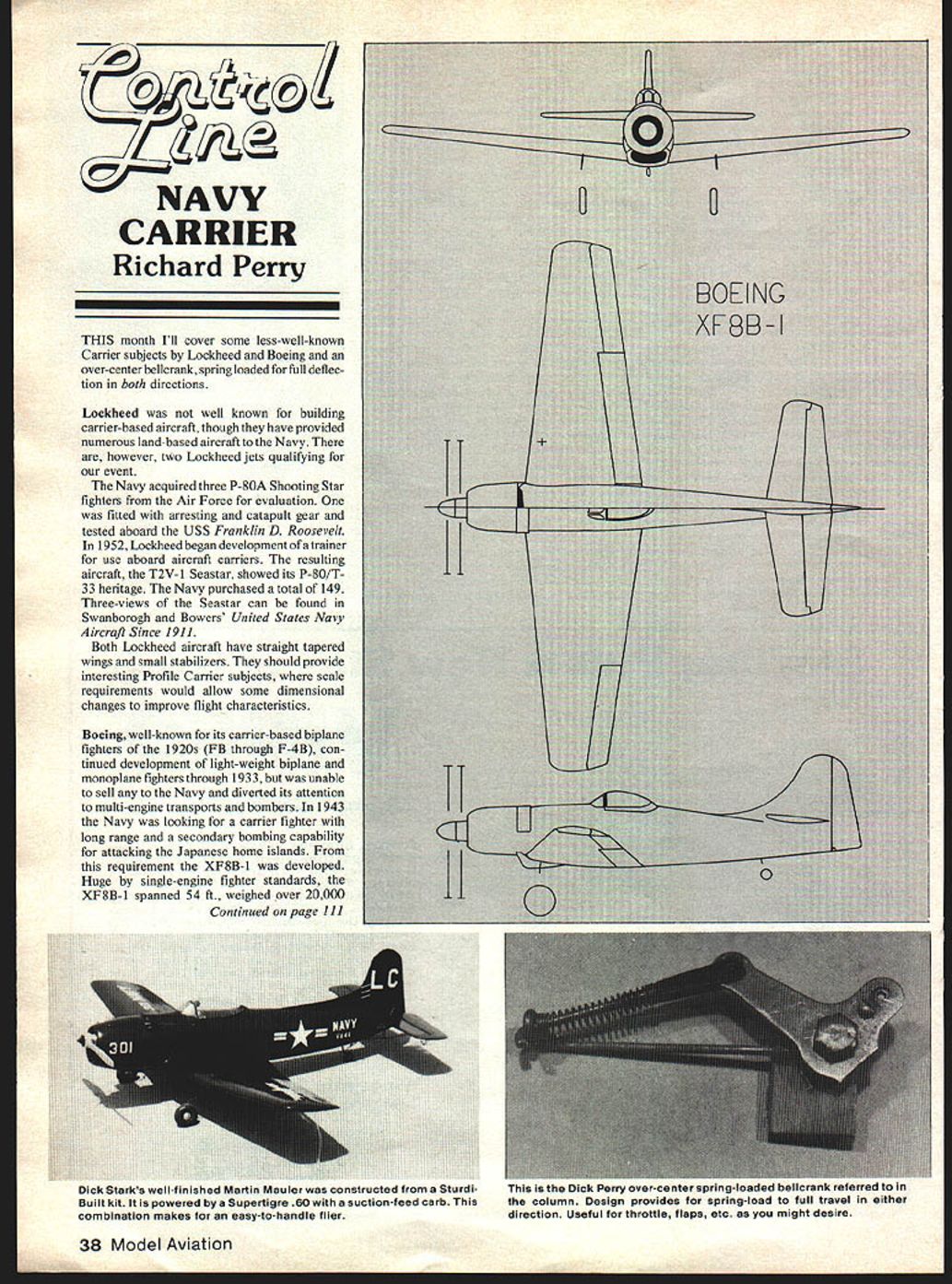 C NAVY CARRIER Richard Perry THIS month Ill cover some less-well-known Carrier subjects Lockheed Boeing over-center bellcrank spring loaded full deflec don both directions Lockheed well known building carrier-based aircraft though have provided numerous land-based aircraft Navy however two Lockheed jets qualifying event Navy acquired three P-80A Shooting Star fighters Air Force evaluation fitted arresting catapult gear tested aboard USS Franklin D Roosevelt 1952 Lockheed began development trainer use aboard aircraft carriers resulting aircraft T2V-1 Seastar showed its P-80/T33 heritage Navy purchased total 149 Three-views Seastar can found Swanborogh Bowers United States Navy Aircraft Since 1911 Both Lockheed aircraft have straight tapered wings small stabilizers should provide interesting Profile Carrier subjects scale requirements would allow some dimensional changes improve flight characteristics Boeing well-known its carrier-based biplane fighters 1920s FB through F-4B con tinued development light-weight biplane monoplane fighters through 1933 unable sell Navy diverted its attention multi-engine transports bombers 1943 Navy looking carrier fighter long range secondary bombing capability attacking Japanese home islands requirement XF8B-l developed Huge single-engine fighter standards XF8B-l spanned 54 ft weighed over 20000 Continued page 111 38 Model Aviation TI 11 II cuQ 11 Starks well-finished Martin Mauler constructed Sturdi Built kit powered Supertigre 60 suction-feed carb combination makes easy-to-handle flier Dick Perry over-center spring-loaded belicrank referred column Design provides spring-load full travel either direction Useful throttle flaps etc might desire MODEL CONTEST CATEGORIES AIRCRAFT BOATS CARS ROCKETS FREE FLIGHT SOUTWII EST Manufacturers Demonstrations Static Model Contest U-CONTROL TRAINS OVER 100 MANUFACTURERS NEW KITS NEW PRODUCTS COMMERCIAL EXHIBITS LIVE DEMONSTRATIONS SIX SPECIAL AWARDS AMA RAFFLE FREE PUBLIC PARKING PLASTICS DISCOUNT TICKETS 0 oct9 Sri j U 1 t hi E i LW o Sri Jiww W -0 000 ;o0 pipe does come pipe too rich Shut off engine putting finger over end pipe Dont worry wont burn finger Close needle valve refuel again repeat procedure until engine does come pipe nose up falls back slightly rich placed back level position may have repeat procedure number times until achieve desired setting take time desired needle setting now ready first test flight Fuel prime engine start engine holding nose down launch quickly possible allow engine go lean burn out prime model still dolly model must roll lift out dolly irst lap model stays dolly longer Make necessary adjustment correct problem very important get model out dolly fast possible glow plug will blow element model still dolly first flight needle setting flight will rich Use -turn needle valve increments between test flights until achieve right setting use -turn increments important single thing pilot will need master capability fine tune engine flight very simple model flying level approximately 3 4 feet altitude engine running slight rich maneuver model up about 15 feet will cause engine lean out After about 1 2 laps bring model back level flight engine tends go rich again level flight turn needle valve shut turn before next flight Repeat proce dure until engine holds constant setting level flight During 1978 season usingthis setup Dave Layman placed first US Championships 19347 mph first Dallas Southwestern 19650 second 1978 Nats 19450 Houston Speed Bash 19800 1979 Nats Dave placed tirst 9643 mph Now have good poop shoot 200 mph flight good feeling whether official flight just testing knowing can just getting together have questions write Dave Layman 5600 North Freeway * 102 Houston TX 77076 Good Luck Good Flying Gene Hempel 301 N Yale Dr Garland TX 75042 CL Navy Carrier/Perry Continued page 38 lbs loaded used 3000 horsepower spin its contra-rotating props XF8B-ls large flaps tail surfaces simple dihedral make well-suited event fuselage essentially flat-bottomed aft wing like Mauler Skyraider making easy building round cowling can formed lathe electric drill airplane has excellent potential Carrier event February column mentioned simple effective speed control system using Kavan pressure carburetor exhaust slide used over-center spring-loaded bellcrank see photo hold carb either open closed position cable attached screw pulled throttle open closed first time exhaust slide closed After first actuation OLD TIMER KITS Full Partial Kits P & W Semi-Kits--All Parts Machine Cut 1940 Ranger 46 span Plan mci $1300 1938 clipper MK 1 72 span Plan Extra $1070 1930 Trenton Terror 72 span Plan Extra $1200 PlaneClipper $450 Trenton Terror $350 Midway Model Co--Pull Kits-- 10 15 RIC 1038 Powerhouse Taibi Span $3596 1941 Air Trails Sportater 50 span $3596 Coming aoon Midway--OSO Replica kits former ly Micro ModelaiS designs-See Future Ads & R Models-Full Kits- 020 Repllco P/P 1940 So Long 32 span $1295 1941 Playboy Sr pan $1295 Tyro Models--Putt Kit-- 20 40 Engines 1941 Playboy Sr pan F/F R/C$4498 4Ks Models--Pull Kilo--Coo Rubber 1941 Climber 44 Span Rubber 41 Nets $1395 1940 Baby Buzzard 36 Span 020 Replica $1295 Micro Models-Pull Kit- 10 20 Engines 1938 Mercury Scientific 45 Span $2695 FREE FLIGHT KITS Gas Rubber CD2 velie Monocoupe Flyline 22 Rubber/CD2 $896 Flash x18 lasco 10 Span Rubber $229 Miss America II Scientific 20 Rubber$395 Satellite 450 4Rs Models 56 15 30 Gas $2460 Baby Roomer R/N Models 32 020 Gsa$716 FUELS ETC Products Aero Dyne fliesel Fuel Standard Blend $2Ot/pt $400/qI Diesel Fuel Break Blend $2OO/pt $450/qo Ignition Fuel High Octsne$420/qt $1209/gal Ignition Fuel Low Octane $375/qt $1840/gal IA High Nitro Fuel 65% Nitro $SOO/pt $1040/qI Nitrate Dope $26S/pt $420/qo $850/gal Nitrate Thinner$2t0/pt $300/qI $650/gal Spark Plug--NOK CM-6 Rethread 3/8-24 $250 ELECTRIC SYSTEMS AND KITS HyTork 102 Electric Propulsion System VL $2995 HyTork 48 Motor Gear Drive Prop $1295 Astro 020 R/C Sys Wired $3205[SPEC