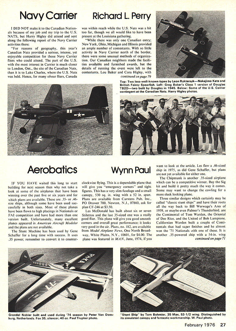 Navy Carrier DID NOT make Canadian Nation als because job trip US NATS Harry Higley did attend sent along following report Navy Carrier activities reasons geography years Canadian Nats provided serious intense yet enjoyable competition Navy Carrier fliers could attend part US interest Carrier much closer London Ont site Canadian Nats Lake Charles US Nats held Hence of-our fliers Canada Richard L Perry within reach U S Nats bit too far though would like have present Louisiana gathering Canadian entry New York Ohio Michigan Illinois provided ample number contestants little activity Navy Carrier north border some unusual methods organiza tion Canadian neighbors made facili ties available furnished awards details running event left contestants Lou Baker Cora Higley continued page 79 Top Two less-well-known types Leon NyktarsykNakajima Kate British Fairey Spearfish Left Greg Bakers Class 1 version Douglas TB2Dtwo built Douglas 1945 Below Some US Carrier contingent Canadian Nats Harry Higley photos IF YOU HAVE waited long start building next season take look some airplanes have winning over past five six years plans available 35- 46size ships although some have used suc cessfully both sizes Most planes have flown high placings Nationals FAI competition have version built Unfortunately excellent planes appeared American Aircraft Modeler plans available Stunt Machine has used Gene Schaffer long time success uses 35 power remember convert counterclockwise flying dependable plane will give emergency corners tight figures has very slim fuselage small canopy 530 sq wing 52 span Plans available Carstens Pub Inc P0 Drawer 700 Newton NJ 07860 ask plan CF-246 $350 Les McDonald has built about six seven Stilettos last 35-sized really good flier plane will give good smooth corners overall great performance looks very good air Plans no 182 available Model Airplane News North Broad way White Plains NY 10601 $400 plane featured MAN June 1974 want look article Les flew 46-sized ship 1975 did Gene Schaffer plans yet available either Chipmunk another 35-sized airplane can competitive winner Buy Sig kit build pretty much way comes Some may want change cowling sleek looking plane Three similar designs certainly may called classic stunt ships have roots way back Bill Werwages Ares 1959 maybe Palmers Thunderbird Continental Tom Warden Oriental Dee Rice United Bob Lampione Californian Warden built couple Conti nentals super finishes almost won 71 Nationals another 35-powered ship 54-in wing continued page 71 February 1976 27 Aerobatics Wynn Paul Grondal Nobler built used during 74 season Peter Van Doesburg Netherlands Fox 35 silencer 40 oz Paul Trupker photo Stunt Ship Tom Bohmier 35 Max 53-1/2 wing Distinguished its simulated canopy fantastic workmanship W Paul photo THE ULTIMATE 3-LINE CONTROL SYSTEM. ALL NEW G-S HANDLE//SUPER STRONG & SMOOTH BELLCRANK ONE HAND OPERATESUPRAN LONOSPANUPROOT SHOD SPANNULO ED ONS SPANNOERIED SOON SPAN FULL THROTTLE RANGE LANDING FLAPS CARRIER HOOK WHEEL BRAKES RETRACT GEAR DROP BOMBS ETC ALL NEW G-S HANDLE 5995 GS HANDLE & BELLCRANKS PROVIDE ONE-THIRD MORE POWER THROTTLE CONTROL RANGE G-S HANDLE ONLY MATCHES THIS INCREASED ACTION G-S 3-LINE CRANKS$ 495 GS BELLCRANKS WONT DIND OR TILT FROM ALL THE STRESS AVERAGE MAN CAN HOLD WITH ONE ARM TNE C-S HANDLE ONLY CAN HANDLE THAT STRESS AND H THE ACTION THIS VARIETY OF BELLCRANKS WILL BE UTILIZED TO GREAT ADVANTAGE IN NEW G-S EXCLUSIVE ASSEMBLY MODELS SUPER HEAVYDUTY C-S SUPER TWO-LINE CRANKS FOR STUNT COMBAT NON-THROTTLE FLYING$100 2-LINE BELLCRANKS 0 LONG SPANSNORT SPAN _________________________ THE MODELER IS IN FOR REAL TREAT FILE- NAVY CARRIER eUNLIMITED RACERS HIGH PERFORMANCE SEMI-SCALE SPORT MODELS NEW ASSEMBLY MODELS BY THE DESIGNER WHO QUALITY. .VALUE. THESE ASSEMBLY MODELS INCLUDE NEW G-S 3-LINE BELLCRANK WITH LEAD-OUT CABLES AT TA C H ED L FINISHED FOR YOU CORSAIR F4U-5 WINGSPAN4052495 SCALE-LOOK WING DIHEDRAL MADE NAVY CARRIER COME ALIVE THESE ASSEMBLY MODELS BUILD SO FAST AND EASY ITS SHEER PLEASURE WITH ALL THOSE FINISHED PARTS OUR CLASS OF NEW PRODUCTS WILL STIMULATE MORE FLYING G UCTS CORP INTL ACTION WHILE PROVIDING GREATER SAFETY SUCCESS AND FUN BOX 488 LA GRANDE OREGON 97850 USA ORDER DIRECTIF NOT AVAILABLE AT YOUR DEALERS p CL Aerobatics/Paul continued page 27 span Plans available MAN no 66 $450 Oriental has around long time has used number people Texas also Kenny Stevens Lexington Ky got third 72 Nationals Junior good simple 35-size airplane straight leading edge 55-in wing about 550 sq Order plan no 46 MAN $225 United Bob Lampione Nationals winner 1969 very similar Continental Ares Cobra Steve Wooley Although Bob built version did fly competitively relatively uncomplicated ship build Plans available makes better Order Carstens no CF-259 $350 another 35-size plane very clean lines classic fuselage styling Still another competitive plane along lines Jim Lynchs Volunteer 40-size 53-in span plane good flier Order Carstens no 302 $350 best 46-sized planes recently competition Scorpio Bill Simons designed foam wing could constructed built-up wing has 60-in span about 700 sq has faired-in canopy just behind nose Large flaps elevators 16 rear moment help make sharp turner Plans available Carstens CF 363 $350 Unfortunately 46 size Genesis Bob Hunt maga zines yet great flyer has Flying Models 35 size available order ing Carstens plans no CF 322 $350 See last months Model viation picture airplane Another 46-size classic style stunter Jack Sheeks Bishop built did fly well foam 54 span wing Order Car stens no CF 344 $250 Jim Silhavy flew 46 powered Gypsy several years good plane has 650 sq 55 wing span fuselage has turtle deck behind canopy Roger Bar rett Nationals qualifier has plans ship Contact him 10821 Westonhill Dr San Diego Cal 92 126 Two soon released plan sets World Champion Gieseke Nobler Bart Klapinskis Tempest Most stunt flier familiar Bobs plane its about time plans available Barts plane fastest turning 35 ships around