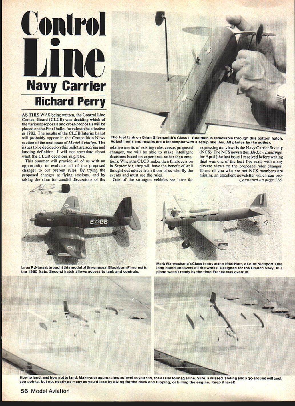 Control BC Navy Carrier Richard Perry AS THIS WAS being written Control Line Contest Board CLCB deciding various proposals cross-proposals will placed Final ballot rules effective 1982 results CLCB Interim ballot will probably appear Competition News section next issue ModelAviation issues decided ballot scoring landing definition will speculate about what CLCB decisions might summer will provide us opportunity evaluate proposed changes present rules trying proposed changes flying sessions taking time candid discussions relative merits existing rules versus proposed changes will able make intelligent decisions based experience rather emo tions CLCB makes final decision September will have benefit well thought out advice us fly events must use rules strongest vehicles have Mark WarwashanasClass entryatthe 1980 Nats Loire-Nieupors long hatch uncovers works Designed French Navy plane wasnt ready time France overrun ,w notto land Make approaches level can easiermo snag line sure missed landing go-around will cost points nearly youd lose diving deck flipping killing engine Keep levell 56 Model Aviation fuel tank Brian Silversmiths Class II Guardian removable through bottom hatch Adjustments repairs lot simpler setup like photos author expressing views Navy Carrier Society NCS NCS newsletter Hi-Low Landings April last issue received before writing best Ive read diverse views proposed rules changes NCS members missing excellent newsletter can pro Continued page 126 Leon Ryktarsyk broughtthis r.jel unusual Blackburn Firecrestto 1980 Nats Second hatch allows access tank controls Spirit St Louis love sky. 314I Seal ~I~. foe 020 nina . Pal. I/C 34-8/0 WIngopon lay Afrosaft enially *5. Deal.. rlbvtr# Wiakoniod Telephgerm fBl 52h38 Seed SOS far oar Flylirre Catalog Flyline Models Inc *8*0 Do, Av. 13-1 1 Pairiax Virginia 22031 decals Give Mossie try Woflrt sorry youre ever Indianapolis look us up Sheeksr Hobby Shop stop may have some thing else spread out can join us kibitzing session CL Aerobatics/Paul Continued page 54 favorite cure-all everything over sensitive planes stress cracks fuselage adding nose weight friends prone tell However nose weight can desensitize tail-heavy plane can help grooving plane can help make round figures smooth out instead appearing jerky Now have enough variables give least 50 flights nothing will teach lot about airplane get know some its characteristics Besides 50 flights good number practice flights probably half competitors Nationals have under belts last month before meet havent cut plane yet adjust flap horns flaps Neither have changed tank yet nor shimmed engine up front back help turning way another nor have changed engine offset youre still having line tension problems really helps have flying buddy experimenting trimming observing airplane judges position underneath maneuvers taking place flying buddy can give valuable information what plane seems doing Also dont mind someone else flying plane try letting buddy fly see what feels like him what looks like different perspective could valuable tool helping evaluate difficulties lie plane information Stunt orPAMPA contact Wynn Paul J640MaywickDr Lexington KY 40504 CL Carrier/Perry Continued page 56 vide current information Competition Newsletter section MA major advantage ofNCS membership however common voice have relationship CLCB Navy Carrier Rules Advi sory Committee Membership $600 12 months can join contacting LeRoy Cordes 1412 West Hood Avenue Chicago IL 60660 Its well worth price Fuel tanks revisited Ive couple questions regarding fuel tank drawing April MA central theme letters seems doesnt fuel run out entire vent tube below level fuel tank would appear problem isnt two openings tank fuel cannot flow out either line unless air flows tank through other line As long inside end vent tube above fuel pickup point below carburetor will no leakage either through vent line through carb tank mounted behind engine conventional gear model conditions met Note uniflow tank will tend pass fuel through vent line engine primed choking because intake timing can cause air pumped tank through fuel line Make easy yourself often have found need change fuel tank because leak because changed throttle systems perhaps throttle linkage control mech anism needed modified built models like us myself included either live what cut open airplane make changes months models well being interesting prototypes show some handy solutions problem Brian Silversmith used hatch bottom Fine Quality Flying Models 98 RUBBER POWER KITS plus Gliders C/L RIC Accessories Books Catalog $150 * MAJESTIC MODELS 3273 West 129th Street Cleveland Ohio 44111 126 Model Aviation q Possibly historically recognized aircraft world presented Flylise as occarate flying replica Charles Liod bergs f927 NY Paris wisser appealing krt inctades Witirams Bros cytioders decals & floe qoatity materials CORRECTION phone num ber HORN ER SALES incor rectly listed June issue ad correct number 312 946-2515 AE ROTRENDS LATEST NEW CREAM Tuned Pipe Coupler high-nitro appli cations Tested proven over 60% nitro closed canopy applications Super heat resistant MUST FOR RC BOATERS SIZES 1/2 ID x 5/32 waIl 5/8 ID x 5/32 waIl 3/4 ID x 3/16 wall 7/8 ID x 1/4 wall 1/2 ID x 5/32 waIl 5/8 ID x 5/32 wall 3/4 ID x 3/16 wall 7/8 ID x 1/4 waIl LENGTH 3 3 3 3 12 12 12 12 ULTRA BLUE Tuned Pipe Coupler Still best value general applica tions 5% nitro Available 1/2 5/8 & 3/4 ID 4 & 12 lengths LIST PRICE $199 229 329 499 795 895 1295 1895 Tuned Pipe COUPLER CLAMPSI Best method connecting tuned pipe couplers Will conduct heat like metal clamps ULTRA BLUE Tuned Pipe Coupler M IN /MAX 7/16 1/2 5/8 23/32 47/64 53/64 55/64 15/16 63/64 1-1/8 11/8 1-7/32 AMT 2/pkg 2/pkg 2/pkg 2/pkg 2/pkg 2/pkg FOR Exhaust Exhau St Most 20s Most 40s Most 60s Most 80s LIST PRICE $159 159 159 159 159 159 Send self-addressed Stamped envelope FREE catalog DEALER INQUIRY INVITED 7/El 0/REND PRODUCTS 44 West Prospect Street New Haven CT