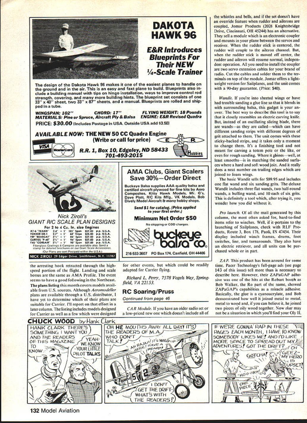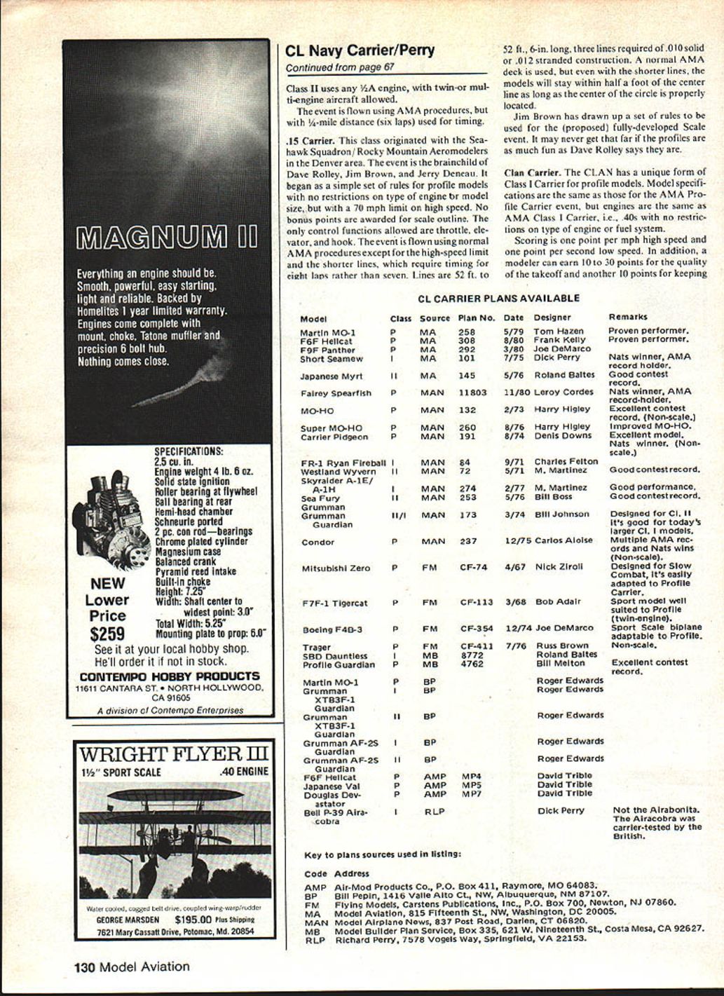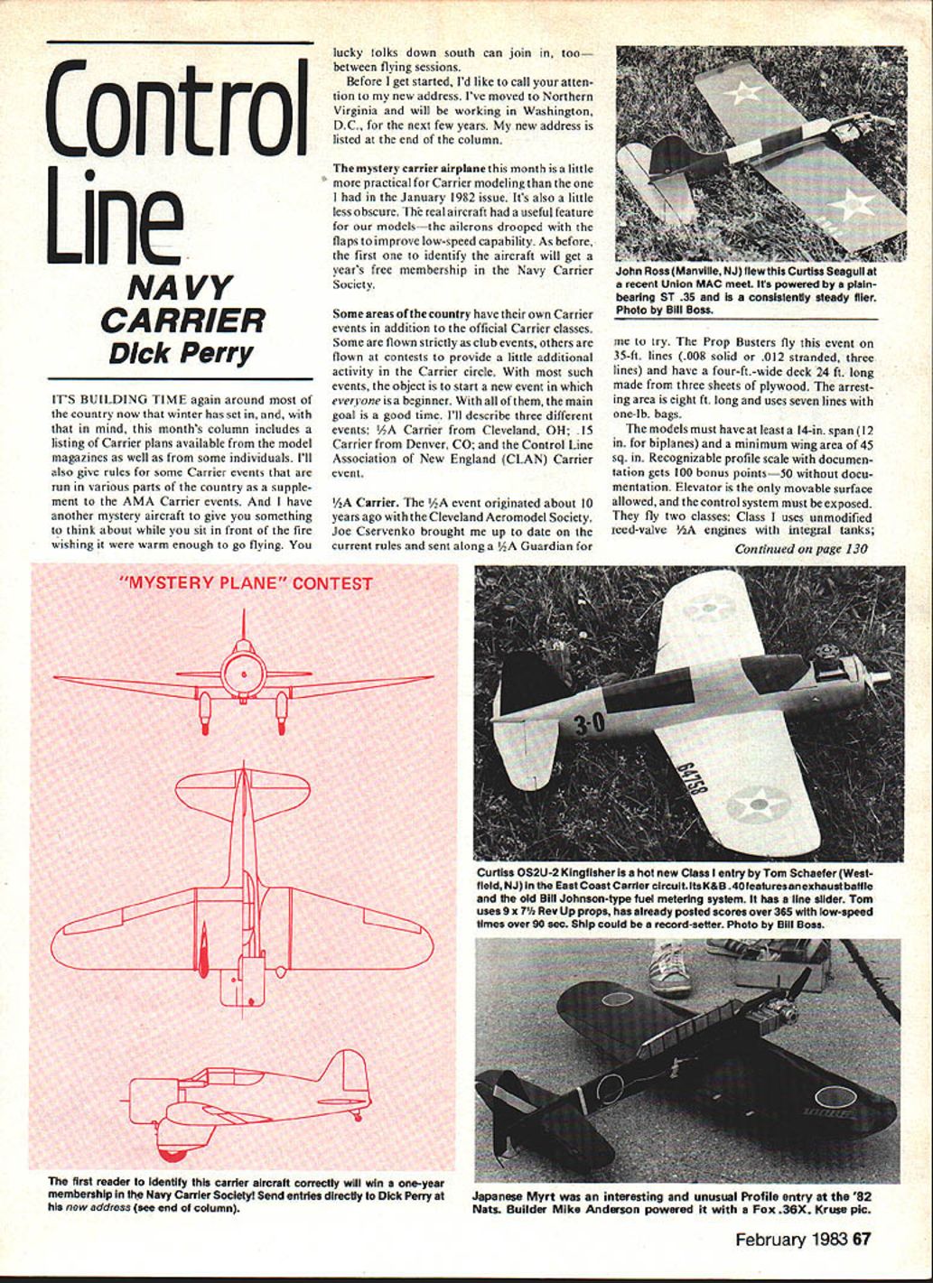 Control Line NAVY CARRIER Dick Perry ITS BUILDING TIME again around country now winter has set mind months column includes listing Carrier plans available model magazines well some individuals Ill also give rules some Carrier events run various parts country supple ment AMA Carrier events have another mystery aircraft give something think about sit front fire wishing warm enough go flying lucky folks down south can join too between flying sessions Before get started Id like call atten tion new address Ive moved Northern Virginia will working Washington DC next few years new address listed end column mystery carrier airplane month little practical Carrier modeling the January 1982 issue Its also little less obscure real aircraft useful feature modelsthe ailerons drooped flaps improve low-speed capability As before first identify aircraft will get years free membership Navy Carrier Society Some areas country have own Carrier events addition official Carrier classes Some flown strictly club events others flown contests provide little additional activity Carrier circle such events object start new event everyone beginner main goal good time Ill describe three different events AA Carrier Cleveland OH 15 Carrier Denver CO Control Line Association New England CLAN Carrier event hA Carrier /A event originated about 10 years ago Cleveland Aeromodel Society Joe Cservenko brought up date current rules sent along hA Guardian try Prop Busters fly event 35-ft lines 008 solid 012 stranded three lines have four-ft-wide deck 24 ft long made three sheets plywood arrest ing area eight ft long uses seven lines one-lb bags models must have least 14-in span 12 biplanes minimum wing area 45 sq Recognizable profile scale documen tation gets 100 bonus pointsSO docu mentation Elevator movable surface allowed control system must exposed fly two classes Class uses unmodified reed-valve engines integral tanks Continued page 130 MYSTERY PLANE CONTEST e first reader identify carder aircraft correctly will win one-year membership Navy Carrier Societyl Send entrIes directly Dick Perry new address see end column February 198367 zonn floss IManville rj siew mis uuniss eaguii am recent Union MAC meet its powered pialn bearing ST 35 consistently steady flier Photo Bill Boss Curtiss 052U-2 Kingfisher hot new Class entry Tom Schaefer West field NJ East Coast Carrier circuit ltsK&B 40teaturesanexhaustbaffle old Bill Johnson-type fuel metering system has line slider Tom uses 9 7/z Rev Up props has aiready posted scores over 365 wIth low-speed times over 90 sec Ship could record-setter Photo Bill Boss Japanese Myrt interesting unusual Profile entry 82 Nets Builder Mike Anderson powered Fox 36X Kruse plc Iu III dniflB weight 4 lb 6 oz Solid state ignition Roller bearing flywheel Ball bearing rear Hemi-head chamber Schneurle ported 2 Pc con rodbearings Chrome plated cylinder Magnesium case Balanced crank Pyramid reed intake NEW Built-in choke Hei ht 725 LowerWidth Shalt center Pricewidest point 30 Total Width 525 $259 Mounting plate prop 60 See local hobby shop Hell order stock CONTEMPO HOBBY PRODUCTS 11611 CANTARA ST H HOLLYWOOD CA 91605 division Contempo Enterorises WRIGHT FLYER fli 1 SPORT SCALE40 ENGINE Water cooled cogged belt drive coupled wing-warp/rudder IGEORGE MARSOEN$19500 Plus Shippingj 7621 Mary Cassatt Drive Potomac Md 20854 CL Navy Carrier/Perry Continued page 67 Class II uses /2A engine twin-or mul ti-engine aircraft allowed event nown using AMA procedures hut i/4.mile distance six laps used timing 15 Carrier class originated Seahawk Squadron Rocky Mountain Aeromodelers Denver area event brainchild Dave Rolley Jim Brown Jerry Dcneau began simple set rules profile models no restrictions type engine br model size 70 mph limit high speed No bonus points awarded scale outline control functions allowed throttle ele vator hook event llown using normal AMA procedures except high-speed limit shorter lines require timing eieht laps rather seven Lines 52 ft Model Martin MO-i F6F Hellcat F9F Panther Short Seamew 52 ft 6-in long three lines required 010 solid 012 stranded construction normal AMA deck used shorter lines models will stay within half foot center line long center circle properly located Jim Brown has drawn up set rules used proposed fully-developed Scale event may never get far profiles much fun Dave Roiley says Clan Carrier CLAN has unique form Class Carrier profile models Model specifi cations same AMA Pro file Carrier event engines same AMA Class Carrier ie 40s no restric tions type engine fuel system Scoring point per mph high speed point per second low speed addition modeler can earn 10 30 points quality takeoff another 10 points keeping CL CARRIER PLANS AVAILABLE Class Source PMA PMA PMA IMA Japanese MyrtIIMA PMAN MO-HOPMAN PMAN PMAN Fairey Spearfish Super MO-HO Carrier Pidgeon FR-i Ryan Fireball Westland Wyvern Skyraider A-lEI A-i H Sea Fury Grumman Grumman Guardian Condor Mitsubishi Zero F7F-i Tigercat IMAN II MAN I MAN II MAN li/I MAN Plan No 258 308 292 101 145 11803 132 260 i9i 84 72 274 253 i 73 Date Designer 5/79 Tom Hazen 8/80 Frank Kelly 3/80 Joe DeMarco 7/75 Dick Perry 5/76 Roland Baltes 11/80 Leroy Cordes 2/73 Harry Higley 8/76 Harry Higley 8/74 DenIs Downs Remarks Proven performer Proven performer Nate winner AMA record holder Good contest record Nats winner AMA record-holder Excellent contest record Non-scale Improved MO-HO Excellent model Nats winner Non scale 9/71 Charles Felton 5/71 M Martinez Good contest record 2/77 M Martinez 5/76 Bill Boss 3/74 BIll Johnson PMAN 23712/75 Carlos Alolse PFMCF-744/67 NIck ZIrail pFMCF-ha 3/68 Bob Adair Boeing F4B-3PFM TragerPFM SBD DauntlessIMB Profile GuardianPMB PBP IBP Martin MO-i Grumman XTB3F-i Guardian Grumman XTB3F-i Guardian Grumman AF-2S Guardian Grumman AF-25 Guardian F6F Hellcat Japanese Val Douglas Dev astator Bell P-39 Aira cobra ii BP ii P P P BP BP AMP AMP AMP RLP C F-3 54 C F-4 ii 8772 4762 12/74 Joe DeMarco 7/76 Russ Brown Roland Baltes Bill