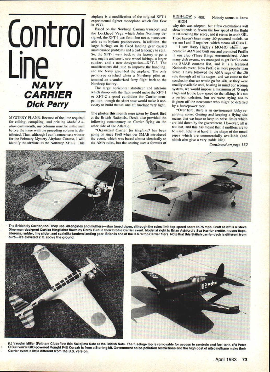 Control Line NAVY CARRIER Dick Perry MYSTERY PLANE Because time required editing compiling printing Model Avi ation month columns must mail before issue preceding column dis tributed Thus although cant announce winner February Mystery Airplane Contest will identify airplane Northrop XFT-2 airplane modification original XFT- IHIGH-LOW x 400Nobody seems know experimental fighter monoplane first flew 1933why adoptedbut few calculations will show tends favour low speed flight influencing score seems work OK havent 60-powered models run II together means Class I saw Harry Higleys MO-HO ap peared MAN built promoted Profile club Three Kings Aeromodelers After club events managed get Profile Onto SMAE contest list featured Nationals event Now Profile popular Scale have followed AMA saga 36 rule through its stages came conclusion would go 40s readily available bearing mind scoring system would impose maximum 75 mph High let Low speed talking Its perfect solution trying frighten off newcomer might deterred horsepower race Over environment lobby re garding noise Getting keeping flying site means have keep noise limits laid down government However lost has meant mufflers used help hand shape tuned pipes commercially available also give very stable idle Continued page 152 Based Northrop Gamma transport Lockheed Vega John Northrop de signed XFT-l fastbut maneuver able its biplane predecessors addition large fairings its fixed landing gear caused maintenance problems bad tendency spin So XFT-l went back factory get new engine cowl new wheel fairings larger rudder new designationXFT-2 modifications did little improve handling Navy grounded airplane prototype crashed Northrop pilot tempted unauthorized ferry flight back Northrop factory large horizontal stabilizer ailerons droop flaps would make XFT- XFT-2 good candidate Carrier com petition though short nose would make nec essary build tail aft fuselage very light photos month taken Derek Bird British Nationals Derek also provided following commentary Carrier flying other side Atlantic Organized Carrier [in England] has going since 1968 SMAE introduced event based almost identically AMA rules scoring uses formula April 1983 73 British fly Carrier too use 40 engines mufflersalso tuned pipes although rules limit top-speed score 75 mph Craft left Steve Dinerman-designed Curtiss Kingfisher flown Derek Bird Profile Carrier event Model right Brian Ashfords Sea Harrier profile uses flaps ailerons rudder line slider scalelike tandem landing gear Brian UKs top Carrier fliers Note British carrier deck different oursits elevated 2 ft above ground L Vaughn Miller Feltham Club flew Nakajima Kate British Nats fuselage top removable access controls fuel tank Peter OSullivans K&B-powered Vought F4U Corsair Sterling kit Government noise-pollution restrictions high cost nitromethane make Carrier event little different US version TAKE IT OFF WITH SPEED STIX DISPOSABLE SANDING TOOLSIA 53 USE WET OR DRY 3 SANDING GRADES 100 120 1803 REGULAR SPEED STIXII $4859 STIX 1/4 3/8 1/2 diameter $295 MINI SPEED STIX 8 STIX 1/8 3/16 1/4 diameter RECISION SANDING TOOLS 2930 SKYVIEW AVENUE PUEBLO CO 81008 Eve Phone linat 42-6200 time spare tire packed top temperature inside trunk 1400 certain sequence Id go through trying sort Out new model First dont try tune engine trim plane same time Dont overlook very basics like balance correct thrust line can usually eyeball thrust line have model darts up down engine shuts off might lot opposite control cranked keep model flying level Minor adjustments can made either loosening mounting bolts tweaking engine correct way enlarging holes crankcase slightly After basics fire up fly level Note outboard wing high low level Black tape outboard wing helps see it very small amount no problem small droop turn model over see wing hangs wing hangs opposite way level flight have warp Either use trim adjustment warp minor straighten wing use heat plastic coverings boiling water steam doped finishes model hangs down both upright verted likely cause too much inboard wing way too much outboard weight outboard wing slightly high both directions tends pickup during maneu vers probably need outboard weight Clean off surface wingtip FasCal quarter-oz 25-cent coin will refly Assymmetry between inboard out board wings should run /2-1 inch tip weight should around ots compromises designed best competitive models happens line rake exit position ORDER TODAY WE PAY THE POSTAGE DEALER. lines inboard wing has lot way model tracks order have model stay Out lines during upwind maneuvers necessary have little line rake needed during downwind portion Thats story toys string Compromises sure fun fly theyre trimmed properly Charlie Johnson 3716 Ingraham St San Diego CA 92109 CL Carrier/Perry Continued oaae 73 Most people use pipe pressure tank nitro fairly expensive dont usually need about 20% get high speed previously mentioned CG has adjusted pipes headers weigh about 4-5 oz no real problem Pipe-length data available motors can set up quite easily Obviously very different meth ods its better bear minor incon venience able fly Ive flying Steve Dinerman Kingfisher season powered HGK 40 AAC piston/liner plus OPS pipe 9 x 6 Taipan prop Typical high 80 plus year lows around 16 mph dont have 60-degree flight attitude rule yet just ex periencing delights prop hanging Scale Ive got MO-I Yes theyre too K&B 40S ED pipe plus 9 x 7 Top Flite pylon prop placed second Nats flight 85/24/100 487 points beaten Guardian 75/19/100 498 points [AMA scoring would have produced scores 320 314 re spectively RLPJ Dumas Crusader well-regarded first-time model favour published American plans [in Profile] Scale wide variety [of models] have tried no type outstanding used favor Seamew think has lot offer am thinking Fulmer 1983 further difference between British Carrier US version deck used two decks used England built Royal Navy patterned after real angle-deck earners has four arresting lines landing area