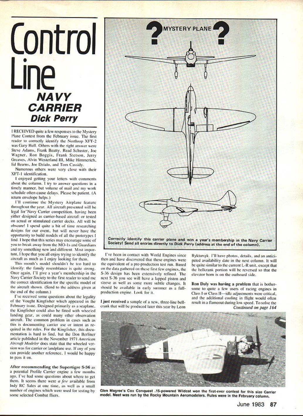 Control Line NAVY CARRIER Dick Perry RECEIVED quite few responses Mystery Plane Contest February issue first reader correctly identify Northrop XFT-2 Gary Hull Others right answer Steve Adams Frank Beatty Read Schuster Joe Wagner Ron Boggis Frank Stetson Jerry Greaves Alvin Westerland Ill Mike Himmerich Ed Beams Joe Dzialo Tom Cassidy Numerous others very close XFT- identification enjoyed getting letters comments about column try answer questions timely manner volume mail work schedule often cause delays Please patient retum envelope helps Ill continue Mystery Airplane feature throughout year aircraft presented will legal forNavy Carrier competition having either designed carrier-based aircraft tested actual stimulated carrier decks will obscure spend quite hit time researching designs event will never have opportunity build models prototypes find hope series may encourage some break away MO-Is Guardians try something new different Most impor tant hope enjoy trying identify aircraft much enjoy looking months model shouldnt too hard identify family resemblance quite strong Once again Ill give years membership Navy Carrier Society first reader send correct identification specific model aircraft shown Send address given end column Ive received some questions about legality Vought Kingfisher appeared February issue Designed primarily seaplane Kingfisher could also fitted wheeled landing gear could other observation aircraft common problem cases such documenting carrier use intent re quired rules Kingfisher docu mentation hard find Don Berliner article published November 1971 American Aircraft Modeler does state wheeled ver sion carrier Iandplane use can provide another reference would happy pass After recommending Supertigre 5-36 potential Profile Carrier engine few months ago Ive some questions about get seems few available Indy RC Sales time well small number engines used testing some selected Combat fliers Ron Duly having problem bother some quite few users racing engines Class Class lIidle adjustments critical additional cooling flight would often just received sample new three-line bell-result flameout during low speed solve crank will produced later year LeonContinued page 164 June 1983 87 carrier tries directly tocowi Ive contact World Engines since Ryktarsyk Ill have photos details antici have discovered engines pated availability date next column will equivalent pre-production test run Based quite similar current L-R unit except data gathered first few engines the bellcrank portion will reversed S-36 design has extensively refined elevator hom outboard side next S-36 see will have lapped piston sleeve well some subtle changes should available early summer fullproduction engine Look Glen Magrees Ccx Conquest 15-powered Wildcat won first-ever contest size Carrier model Meet run Rocky Mountain Aeromodelers Rules February column FULL*SIZE*PLANS 409 Fokker Spin III$825 FF Scale Early Fokker monoplane trainer 049 power 3 shts No 410Pober Pixie$1300 RC Multi-Scale 40 power 4-channels Can built sport flier Precision Scale depending detail added 2 shts No 411Humm Bug$175 CL 00-2-powered profile mite sport Stunt Gee Bee Model Y 40-powered RC stand-off scale great old-bree racers$500 Stiilelto CL Stool rrrodel McDonald winner 19761990 1902 PAl World Champs$375 Ole Reliable PC 70 oersinn 39 old-timer REM controls 19-25$425 Bloc Birds PC Ken Willards lorroation plane 4-ch 105375 crashmaster CL Crash-proof trainer 2 sizes15-30 35-40$125 Gee Bee RC Granger Williams magnificent Model Z br 40 engine$755 cap 29 40-powered scale PC French aerobatic plane Low wing tail-dragger 2 sheelo9750 Gee Bee Sr Sporlster PC t/vscale hp HaSke 91 power Prototypo span 3011 212 sheets$1175 Mini F-16 PC Sarpolas 049 dacted tan sport tIler tor 2-cE Balsa wings tail lose stroctare$275 Pegasus PC Watsons giant sopor sailplane tealores 1bps spoilers Ttail 164 wingspan9675 1930 Fleel Biplaee PC Sport Scale br 35-40 4-ch Wingspan 56 16 scale Two sheets$625 Drake II PC Ken Willards Ilping boat Icr 3-ch 15-power Pip trow land remosable gear$375 Taylor cob PC Don Stalls Schoolyard-Scale tot 049s 2-3 Ch Spans 50 in$350 Zephyr PC Small 2-cs glider hasd-laanch tow thermal slope soaring9299 Wasp VI PP Mike Stops Nato-winning Qaldoor HLG$190 Onestep PC Trainer has very forgining flying qoalities 3-ch. 10- 25 power$425 Merlyn PC Giant 155-is span Sailplane oses 3 PC channels$755 Maule Lanar Rocket PC 1/4-Scale spans 925 5-oh flaps 12 cv engine$1290 PIeces PP Indoor Easy B Robber-power contest-winner Op W Van Gorder$195 Sapercat PC Halt-A Pylon Racersport flier Aileron elenator control Poam wing$250 Seawaster PC Willards 40-size tlping hoar d-ch Strap-on gear tar landylanel 2 shts$1190 Space ShaBle II PC Larger improved version ot Has glider 3-oh$550 cAp-21 PC Giant-Scale Prench aerohatic craft spans 71/411 Qoadra power 2 sheets - 40091400 Stralo-Streak PC Old-Timer vemion Garamis tamoon 41 PP design tot power 2ch$500 Neighelon PC Low-wing tn-gear sportster power d-ch$500 Marlssa PP Robber-powered sportster Golden Age tradition$390 Snapshop Twin PC Workhorse atility/sport ship tot twin 30-40 4-h oh Poam wegs liOs t2lbs2shts$1198 Anrorna PC SportAerohatc flier tot 049-10 -power oses 2 or3 ch$350 Wiegnoaster CL Sport-Stanter Profile toselage sheet wings w hops$200 Mr Spook Ill PC Ply Sport Pylon Non/Sportsman Paoern sheet sport Uses d-ch. 20-40 pint$500 Mgpoboom CL t2A Combat ship large light saper performer$375 WilSIl ljawk 500 PP Hot Class AB Gas competition ship 111-23 power Nats-wrening design$375 Nosy FlIer PP Pobber-power sports flier captains Golden Age flavor Spans 26 in$300 caflisto 62 PC Ply sleek Pats-winning Sailplane AMA Mod Std Unlimited classes$795 Similar Alp PC Evans famous design retains 60-sz Pagern plane Petracts foam wing$550 Laser 200 PC Sport Scale replica championship Anrobatic tlinr Uses 40 power 4-h ch 2 shin$1075 czech Mate PP Cole low-wing spoester tot CO-2 powers spans 211 in$225 US Male PC Hoge gentle-flyi