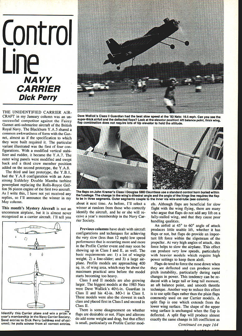 Control Line NAVY CARRIER Dick Perry THE UNIDENTIFIED CARRIER AIR CRAFT January column un successful competitor against Fairey Gannet anti-submarine aircraft British Royal Navy Blackburn YA5 shared common awkwardness form Gan net almost specification built required particular variant illustrated first four con figurations modified vertical stabi lizer rudder became YA7 outer wing panels modified swept back third crew member position added second prototype YA8 third last prototype YB 1 YA8 configuration Arm strong Siddeley Double Mamba turbine powerplant replacing Rolls-Royce Grif fon 56 piston engine first two aircraft As write have yet received replies Ill announce winner May column months Mystery Aircraft uncommon airplane almost never recognized carrier aircraft Ill tell Identify Carrier plane win prize years membership Navy Carrier Society Send entries Dick Perry address end col umn pulls winner correct entries flaps John Kramers Class Douglas SBD Dauntless use standard control horn buried within fuselage change wings dihedral angle angle hinge line requires lisp three segments Outer segments couple inner via wire-and-tube see column els Although flaps beneficial slow flight wing flying argue flaps add lift fully-stalled wing cause poor handling qualities An airfoil 450 600 angle attack produces little usable lift whether has flaps flaps provide impor tant lift force within slipstream propeller very high angles attack force helps slow airplane effect can produce very low speeds particularly heavier models require high power settings keep aloft Flaps tend force nose down deflected can produce some pitch instability particularly during rapid changes power tendency can re duced large tail long tail moment aft balance point smooth throttle technique Another way reduce effect use split flaps rather plain flaps commonly used Carrier models split flap extends lower wing surface shape upper wing surface unchanged flap deflected split flap will produce almost exactly same change lift coefficient Continued page 164 about next time As before Ill select winner random correctly identify aircraft will re ceive years membership Navy Car rier Society Previous columns have dealt aircraft configurations techniques achieving very slow less 12 mph low speed performance occurring more Profile Carrier event may soon showing up Class II well basic requirements 1 lot wingtip weight 2 line-slider 3 large air plane Profile models approaching 400 sq wing area may about maximum practical area before model starts becoming too heavy Class II models also growing larger biggest models 1983 Nats Dave Wallicks 40-in Guardian Class II 42-in MO-l Class models also slowest class placed first Class second Class II some disagreement whether flaps desirable Flaps ailerons add some weight drag effect small particularly Profile Carrier modDave Wallicks Class ii Guardian best slow speed 83 Nets 165 mph Can see super-thick airfoil deflected flaps Look elevator position Aft balance point thick wing flap combination does require lots Up elevator hold attitude C 4 line-connector model attachment fourth line both model control handle will leave construction installation items own ingenuity last thought before closing has comments need additional infor mation about project would too glad hear Good luck Send CL Scale items Bill Boss 77-06 269th Sr New Hyde Park NY 11040 CL Navy Carrier/Perry Continued page 67 plain hap nose-down pitching moment will about half pro duced plain flap 1 have run tests comparing full-stall low-speed performance flaps What have noticed however models consistently fly seven eight miles per hour light winds have flaps can make own conclusions own observations Putting flaps airplane rather straightforward task Probably common way operating flaps use standard horn arrangement push/pull rod connected arm tailhook Ive used wide variety hinges tube-andwire through full range commercial hinges hinges made iron-on Mylar covering oh convenient hinges Ive used last two models onepiece polypropylene hinge Full Com mand Systems 908 E Rosewood Spokane WA 99208 Because no hinge pins no sliding surfaces cant harm hinge inadvertently getting CyA glue epoxy paint hinge line light very stronga good characteristic flaps actuated tailhook Wings have straight hinge line must have divided flaps F4U Cor sair three flap segments per wing An easy way connect flap segments shown accompanying photo segment contains Vi6-in OD brass aluminum tube mounted near trailing edge other flap segment has 0025 wire tached extending across break tube wire can bend slide within tube allow movement tween segments Richard L Perry 7578 Vogels Way Springfield VA 22153 CL Racing/Ballard Continued oaoe 68 amount fuel engine receives prime tube works independently fuel shutoff fuel shutoff does have open engine receive prime think majority problems develop fuel shutoff open during filling process allowing large amount fuel injected carburetor and/or Fine Quality Flying Models Catalog Si 50 98 RUBBER POWER KITSI plus Gliders C/L R/C Accessories Books MAJESTIC MODELS 3273 West 129th Street Cleveland Ohio 44111 FREE 1984 Catalog tools Hobbyist Miniature lathes Milling/drilling machines Jig & circular saws Styrofoam cutter W1i hobby products co PO Box 07846 Columbus OH 4320 HOOOYHTDEAWAYHOBOYHIEAWAYHOOBYHIDEAWAYHOOBYHIOEAWAi FAMOUS BRITISH DIESELS AEROMODELLER PLANS SPARES FOR M/E PAW 0/C 3rd PRINTING CATALOG - DIESEL HANDBOOK $350 pp HOBBY HIDE WAY DELAVANIL 309 244-7389 61734 HOOOYIIIOEAWAYHOBOYHTDEAWAYIIOBOYHIDEAWAYFIOOOYHIDEAW 164 Model Aviation Tired Being Shot Down SUPER SERVO GARD Controls Throttle Cant * Constantly monitors receiver interference another trans mitter outside sources instantly reducing throttle idle until interference clears * Constantly monitors flight battery pack voltage instantly reduces throttle idle allowing time safely land * Responds instantly loss radio signal throttling back idle alerting flight problem * Affects throttle gi