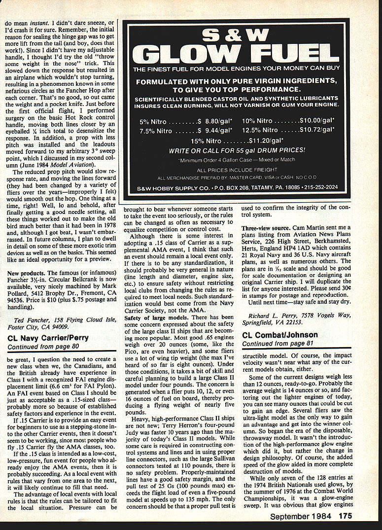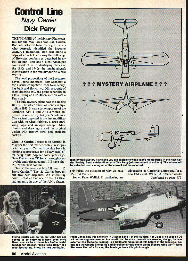 Contml Line Navy Carrier Dick Perry THE WINNER Mystery Plane con test May issue Bob Colton Bob selected eight readers correctly identified Brewster XSB2A-1 Buccaneer Bob sent along copy article covering full range Brewster bombers described last column Bob has slight advantage over us identifying planes 1930s 1940she taught aircraft identification military during World War II good proportions Buccaneer havent gone unnoticed Tom Schaefer top Carrier competitor New Jersey has built flown two accounts describe 350/365-point capability Class using HP 40 suction Perry carb July mystery plane Boeing XF7B- 1 example built 1933 contemporary Northrop XFT-l XFT-2 ap peared last years columns variant depicted last modifica tion no wheel fairings large cowl wing flaps open cockpit Most photos drawings original design narrow cowl enclosed cockpit Claus 15 CarrIer traveled Norfolk May first Carrier contest Virgin ia two years Carrier coming back Norfolk appropriate Navy base af ter being quite popular some years ago Gene Daniels CD thoroughly en joyable relaxed contest Ill have pho tos next column events Norfolk 15 Sport Carrier 15 Carrier brought out five new airplanes An interesting point 15 fliers entry AMA classes raises question have 15-sized Carrier Some Dave Wallick ift particular advocating 15 Carrier proposal new FAI event FAI Carriet would Condnued page 175 80 Model Aviation identify Mystey Plane eligible win years membership Navy Car rier Society Send entries directly Dick Perry address end column winner will selected among correct entries received Flying Carrier can fun John Kramer seems enjoying himseif ususi expisins Profile modei Shannon Cooper Miss Rebel Raiiy meet last spring Photo inez Lundquist Frank Jones flew Skyshark Classes ii 83 Nate Class ii uses OS 45 marIne engine converted aircraft use Because craft low-wing design uses external line leadouts leading crank mounted mid-height fuselage can see wingtip line guide line-slider arrangement inboard wing tipIt looks like some kind fin atop fuselage photo angle mean instant didnt dare sneeze Id crash sure Remember initial reason sealing hinge gap get lift tail boy does work Since didnt have adjustable handle thought Id try old throw some weight nose trick slowed down response resulted airplane wouldnt stop turning resulting phenomenon known some nefarious circles Fancher Hop after corner Thats no good out came weight pocket knife Just before first official flight performed surgery basic Hot Rock control handle moving both lines closer eyeballed / inch total desensitize response addition prop less pitch installed leadouts moved forward arbitrary 30 sweep point discussed second col umn June 1984 Model Aviation reduced prop pitch would slow re sponse rate moving lines forward changed variety fliers over yearsimproperly felt would smooth out hop thing time right Well lo behold after finally getting good needle setting things worked out make old bird much better 1978 although got beat wasnt embar rassed future columns plan dwell detail some exotic trim devices well basics seemed like ideal opportunity preview New products famous infamous Fancher 3 A-in Circular Bellcrank now available very nicely machined Mark Pollard 5412 Brophy Dr Fremont CA 94536 Price $10 plus $75 postage handling Ted Fancher 158 Flying Cloud Isle Foster City CA 94009 CL Navy CarrierlPerry Continued page 80 great question need create new class Canadians British already have experience Class recognized FAT engine dis placement limit 66 cm FAI Pylon An FAT event based Class should just acceptable 15-sized class probably because established safety factors experience event 15 Carrier provide easy event beginners use stepping-stone other Carrier events doesnt seem working since people fly 15 Carrier fly AMA classes too 15 class intended low-cost low-pressure fun event people al ready enjoy AMA events probably succeeding As local event rules vary area next will likely continue fill need advantage local events local rules rules can tailored fit local situation Pressure can brought bear whenever someone starts take event too seriously rules can changed often necessary equalize competition control cost Although some interest adopting 15 class Carrier sup plemental AMA event think such event should remain local event standardization should probably very general nature line length diameter engine size etc ensure safety restricting local clubs changing rules re quired meet local needs Such standard ization would best come Navy Carrier Society AMA Safety large models has some concern expressed about safety large class II ships becom ing popular Most good 65 engines weigh over 20 ounces some like Pico heavier some fliers use lot wing tip weight max Ive heard far eight ounces Under conditions takes bit skill careful planning build large Class II model under four pounds concern generated flier puts 10 12 16 ounces fuel board thereby pro ducing flying weight nearly five pounds Heavy high-performance Class II ships new Terry Herrons four-pound Judy faster 10 years ago ma jority todays Class IT models some care required constructing con trol systems lines using proper line connectors such large Sullivan connectors tested 110 pounds no safety problem Properly-maintained lines have good safety margin pull test 25 Gs 100 pounds max ex ceeds flight load five-pound model speeds up 135 mph concern should proper pull test Three-view source Cam Martin sent plans listing Aviation News Plans Service 226 High Street Berkhamsted Herts England HP4 lAD contains 21 Royal Navy 36 US Navy aircraft plans well numerous others plans /72 scale should good scale documentation designing original Carrier ship will duplicate list anyone interested Please send 30 stamps postage reproduction Until next timestay safe stay dry Richard L Perry 7578 Vogels Way Springfield VA 22153 CL CombatlJohnsofl Continued page 81 structible model course impact velocity wasnt near what cur rent models obtain either Some current d