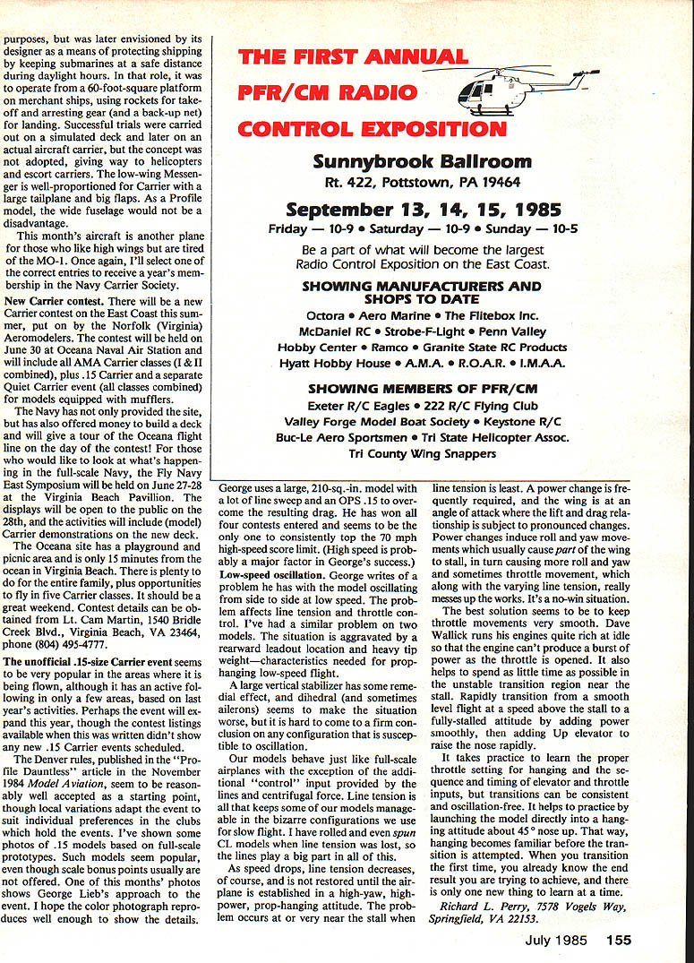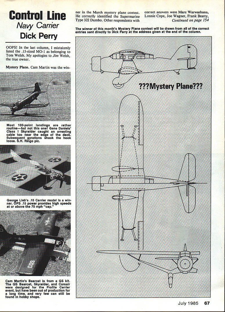 Control Line Naiy Carrier Dick Perry ner March mystery plane contest correctly identified Supermarine Type 322 Dumbo Other respondents correct answers Marc Warwashana Lonnie Cope Joe Wagner Frank Beatty Continued page 154 winner months Mystery Plane contest will drawn correct entries sent directly Dick Perry address given end column OOPS last column mistakenly listed 15-sized MO-i belonging Tom Welsh apologies Jim Welsh true owner Mystery Plane Cam Martin winMost 100-point landings rather routinebut onel Gene Daniels Class Skyralder caught arresting cable too near edge deck Subsequent gyrations shook hook loose SH Ringo plc George Liebs 15 CarrIer model win ner 0 PS 15 power provides high speeds above 70 mph cap Cam Martins Bearcat GS kit GS Bearcat Skyraider Corsair designed Profile Carrier event have out production long time very few can still found hobby shops July1985 67 ELECTEC EASEl & SAILPLANE SPECIALISTS 1981 World Soaring Champ DWIGHT HOLLEY IS PROUD TO ANNOUNCE NEW COMPANY TO HELP BOTH BEGINNER & EXPERT FLY INTO THE NEW ERA OF ELECTRIC AIRCRAFT WE ALSO OFFER SELECT FEW PURE SAILPLANES FREE DEMONSTRATION FLIGHTS CiECK OUT AND/OR TEST FLIGHTS OF yOUR NEW PLANES CALL OR WRITE FOR FREE DESCRIPTIVE FLYER UPS 000 FOR IMMEDIATE SHIPMENT ELECTRIC KITS IN STOCK AEROBATIC OLDTIMER SPORT SCALE ERS HOLLEYS SILENT FLIGHT 203 748-0083 151 CHESTNUT RIDGE ROAD BETHEL CT 06801 FEATURING ONLY STATE OF ThE ART ITEMS 0 r r U U S C 1 2 SI S C 2 slight disadvantage proposal would obsolete 36 far Competition use goes Availability lighter weight less power slowing down models usually cited reasons such change Any engine/model changes really affect less hundred national regional competitors no need worry local level can anything want long two can agree talked Jed Kusik other day before left new job working Henry Nelson Henrys engine busi ness has really turned big time Dont wait until week before Nation als Team Trials order engines though have orders hun dreds Chinese other people around world Henry wont sneer two-engine order will put line rest Jed said hes spent time doing work engines sent repair backlog should have cleared long before read Hes also sembling testing unit must meet very high standard before shipped theyre closely scrutinized find out theyre performing Jed said positioning liner case very critical tiny amount misalignment causes large drop power youre engine dis assembly opportunity should careful about liner positioning Head clearance also other major factor Most people run head down tighter until start popping plugs run up few thousandths Overcompressing seems major problems engines dont run up par Before complain about engine sure test-run very strong test bench see performs Loose mounts ones distort case tightened will kill performance engine regardless care taken manufacture can take several people World Championships saw engines pick up couple thou sand rpm run Henrys test bench Besides usual 140 mph models report other useful item Zinger 8A 6 prop think too small Fast Slow Com bat model works great turns full streamer thats really measure good prop props widely available cheaper lot other ones market Remem ber test props using full competi tion streamer both level flight through series maneuvers Heres what youve waiting MACA Top Twenty 1984 1 Larry Driskill Points 195 BOX 429SKTLANU N U NEWSPACESA FUEL CONTAINER RtInhwx 2x73IShIuhxq-l/8 Tough RIgId P*tbyhm IuchidesAITu1kg PI $1 stqe Fustners IwI 11kg though Cop North Products PO Box 18419 Cleveland Heights OH 44118 SOAR throUgh right own living room 2-hour psycho -sensual helicopter exploration Breathtaking music Critically acclaimed Details FREE VHSor BETA J5238 Beerger ProdutInn 3217 ArvilIe Las 2 Tom Fluker 3 Richard Stubblefield 4 Paul Smith 5 Chris Gay 6 Steve Kott 7 PeteAthans 8 Jerry Sabin 9 Don Cranfil 10 Bud Bodzioch 11 Al Jorgensen 12 Gary Bycrely Joe McKenzie 14 Phil Cartier 15 Bill Lajack 16 Ron Malcolm 17 Jeff Johnson 18 John Salvin III 19 Ed Brzys Don Holbrook 191 164 121 120 114 99 93 72 66 61 55 55 54 50 47 46 45 43 43 Charlie Johnson 3716 Ingraham San Diego CA 92109 St CL Navy Carrier/Perry Continued page 67 Bob Heywood Monty Greenly Ber nard Klien May mystery aircraft Miles M 38 Messenger An unlikely carrier air craft originally designed other 154 Model Aviation * SCALE DOCUMENTATION * SCALE DRAWINGSMODEL PLANS PHOTOS w BOOKS EPLA-TECH 1985 INTERNATIONAL AIRPLANE CATALOG oo MC KENZIE HWY $300VIDA OREGON 97488 OVALITY FREE FLIGHT KITS AND SUPPLIES FOR COMPETITION AND SPORT SINCE 1975 Dealer inquirleaCalalog 5O invited BLUE RIDGE MODELS. 28776 E U -a -a U -l 0 21 0 2 0 U S SUPER SALE Us 1W Id SiP y dy d y dd ffsd Th sat f hb hp R bh d hy pftsI Odush lAg .h-S k d 1 a.. AImy haIh d . douR SS h Sq. SiAN Jod II I3 h 4 a .ii hft y. ho ...d odoht Ad oogh. .fl R 0* S .gbhaSS9OS oy4hoINA adh 5p14s ETA VIII oho ddq CotIIhd dud. .oy .d * U COD VideoTech PO Box 1917-30086 Stone Mt. GA 30086 tmc GOLDEN GATE IsaE5 YS60$14816 YS 45$9685 ATLANTA$22275 OMEGA$20588 SIGMA$24550 ACRO STAR$16315 QUATRO4O$15061 EXCEED4O$15188 MK RETRACTS$4183 TETTRA WHEELS$513 DIGICON HORNS$105 IM SERVO MTS$164 PULL-PULL HDWR$346 PULL-PULL HORN$ 74 SEE OUR PRODUCTS AT ALAMEDA HOBBY 415 523-3980 SAN ANTONIO HOBBY 415 9411278 SEND $1 FOR CATALOG PO Box 4412 Burlingame CA 94010 TEL 415 467-3170 purposes later envisioned its designer means protecting shipping keeping submarines safe distance during daylight hours role operate 60-foot-square platform merchant ships using rockets take off arresting gear back-up net landing Successful trials carried out simulated deck later actual aircraft carrier concept adopted giving way helicopters escort carriers low-wing Messen ger well-proportioned Carrier large tailplane big flaps As Profile model wide fuselage would disadvantage months aircraft another plane like high wings tired MO-i Once again Ill select correct entries receive years mem bership Navy Carrier Society New Carrier contest will new Carrier contest 