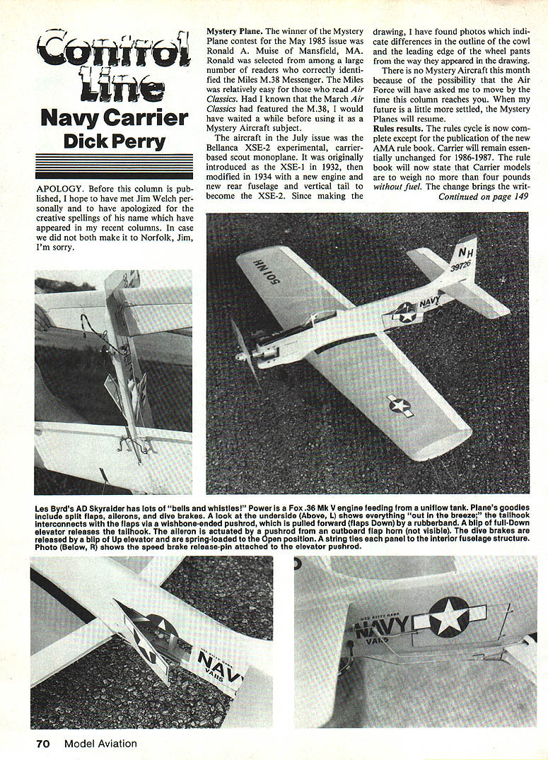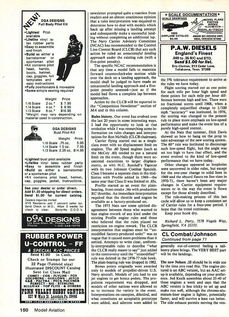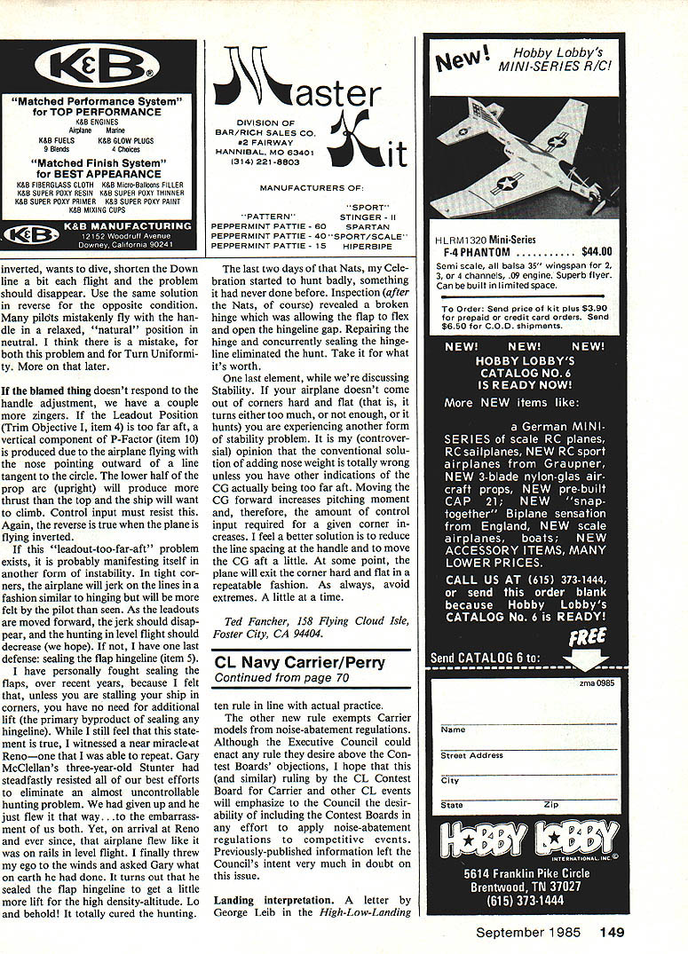 Navy Carrier Dick Perry APOLOGY Before column pub lished hope have met Jim Welch per sonally have apologized creative spellings name have appeared recent columns case did both make Norfolk Jim Im sorry Mystery Plane winner Mystery Plane contest May 1985 issue Ronald Muise Mansfield MA Ronald selected among large number readers correctly identi fied Miles M38 Messenger Miles relatively easy read Air Classics known March Air Classics featured M38 would have waited before using Mystery Aircraft subject aircraft July issue Bellanca XSE-2 experimental carrierbased scout monoplane originally introduced XSE-l 1932 modified 1934 new engine new rear fuselage vertical tail become XSE-2 Since making drawing have found photos indi cate differences outline cowl leading edge wheel pants way appeared drawing no Mystery Aircraft month because possibility Air Force will have asked move time column reaches future little settled Mystery Planes will resume Rules results rules cycle now com plete except publication new AMA rule book Carrier will remain essen tially unchanged 1986-1987 rule book will now state Carrier models weigh no four pounds fuel change brings writContinued page 149 70 Model Aviation Los Byrds AD Skyraider has lots bells whistlesl Power Fox 36 Mk V engine feeding unifiow tank Planes goodies Include split flaps ailerons dive brakes iook underside Above 1 shows everything out breeze talihook Interconnects fiaps via wishbone-ended pushrod pulled forward fiaps Down rubberband blip fuiiDown elevator reieases talihook aileron actuated pushrod outboard fia p horn visible dive brakes released blip Up elevator spring-loaded Open position string ties pancI Interior fuselage structure Photo Below R shows speed brake release-pin attached elevator pushrod Matched Performance System TOP PERFORMANCE K&B ENGINES AirplaneMarine K&B FUELSK&B GLOW PLUGS 9 Blends4 Choices Matched Finish System BEST APPEARANCE K&B FIBERGLASS CLOTH K&B Micrn-Balloons FILLER K&B SUPER POXY RESIN K&B SUPER POXY THINNER K&B SUPER POXY PRIMER K&B SUPER POXY PAINT K&B MIXING CUPS inverted wants dive shorten Down line bit flight problem should disappear Use same solution reverse opposite condition pildts mistakenly fly han dle relaxed natural position neutral think mistake both problem Turn Uniformi ty later blamed thing doesnt respond handle adjustment have couple zingers Leadout Position Trim Objective item 4 too far aft vertical component P-Factor item 10 produced due airplane flying nose pointing outward line tangent circle lower half prop arc upright will produce thrust top ship will want climb Control input must resist Again reverse true plane flying inverted leadout-too-far-aft problem exists probably manifesting itself another form instability tight cor ners airplane will jerk lines fashion similar hinging will felt pilot seen As leadouts moved forward jerk should disap pear hunting level flight should decrease hope have last defense sealing flap hingeilne item 5 have personally fought sealing flaps over recent years because felt unless stalling ship corners have no need additional lift primary byproduct sealing hingeline still feel state ment true witnessed near miracleat Renoone able repeat Gary McClellans three-year-old Stunter steadfastly resisted best efforts eliminate almost uncontrollable hunting problem given up just flew way. embarrass ment us both Yet arrival Reno ever since airplane flew like rails level flight finally threw ego winds asked Gary what earth done turns out sealed flap hingeline get little lift high density-altitude Lo behold totally cured hunting DIVISION OF BAR/RICH SALES CO #2 FAIRWAY HANNIBAL MO 63401 13141 221-8803 aster MANUFACTURERS OF SPORT PATTERN STINGER II PEPPERMINT PATTIE 60 TAN PEPPERMINT PATTIE 40SPORT/SCALE PEPPERMINT PATTIE 15 HIPERBIPE last two days Nats Cele bration started hunt badly something never done before Inspection after Nats course revealed broken hinge allowing flap flex open hingeline gap Repairing hinge concurrently sealing hingeline eliminated hunt Take what its worth last element discussing Stability airplane doesnt come out corners hard flat turns either too much enough hunts experiencing another form stability problem controver sial opinion conventional solu tion adding nose weight totally wrong unless have other indications CG actually being too far aft Moving CG forward increases pitching moment therefore amount control input required given corner creases feel better solution reduce line spacing handle move CG aft little some point plane will exit corner hard flat repeatable fashion As always avoid extremes little time Ted Fancher 1S8 Flying Cloud Isle Foster City CA 94404 CL Navy Carrier/Perry Continued page 70 ten rule line actual practice other new rule exempts Carrier models noise-abatement regulations Although Executive Council could enact rule desire above Con test Boards objections hope similar ruling CL Contest Board Carrier other CL events will emphasize Council desir ability including Contest Boards effort apply noise-abatement regulations competitive events Previously-published information left Councils intent very much doubt issue Hobby Lobbys MINI-SERIES R/CI HLRM1 320 Mini-Series F-4 PHANTOM$4400 Semi scale balsa 35 wingspan 2 3 4 channels 09 engine Superb flyer Can built limited space September 1985 149 Order Send price kit plus $390 prepaid credit cerd orders Send $650 000 shipments Landing interpretation letter George Leib High-Low-Landing DESIGNS Body Pilot Kit sLightest Pilot available eLifeilke vinyl la tex rubber parts Easy assemble finish eBuild either barnstormer sportsman pilot Kit contains pilot head hands boots helmet cap goggles full templates easy instructions Fuiiy positionable & moveable eSome simple sewing required WeightPrice 1/6Scale2oz$ 795 1/4Scale4oz*$ 995 lI3Scale6oz*$1695 *Weightmay vary depending material used construction DGA DESIGNS Bust Pilot Kit Weight 1/6Scale 7Soz 1/4Scale 1Soz lI3Scale 225 oz Price 595 795 $1495 Lighte