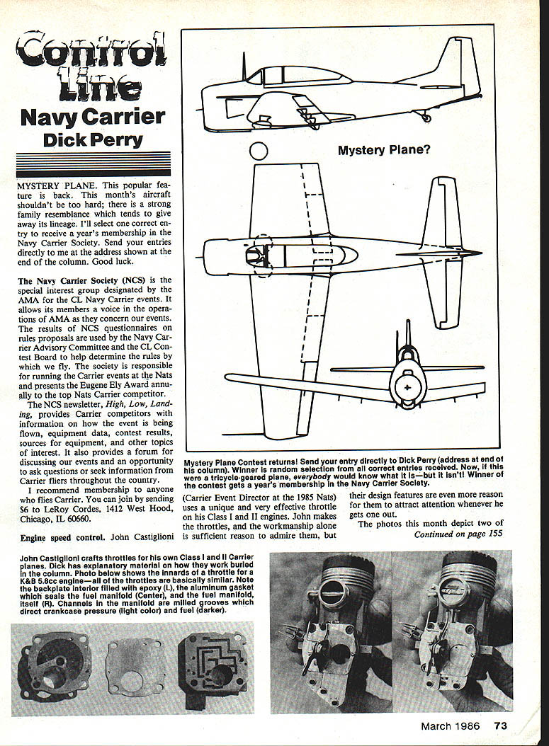 H 1it Navy Carrier Dick Perry MYSTERY PLANE popular fea ture back months aircraft shouldnt too hard strong family resemblance tends give away its lineage Ill select correct en try receive years membership Navy Carrier Society Send entries directly address shown end column Good luck Navy Carrier Society NCS special interest group designated AMA CL Navy Carrier events allows its members voice opera tions AMA concern events results NCS questionnaires rules proposals used Navy Car rier Advisory Committee CL Con test Board help determine rules fly society responsible running Carrier events Nats presents Eugene Ely Award annu ally top Nats Carrier competitor NCS newsletter High Low Land ing provides Carrier competitors information event being flown equipment data contest results sources equipment other topics interest also provides forum discussing events opportunity ask questions seek information Carrier fliers throughout country recommend membership anyone flies Carrier can join sending $6 LeRoy Cordes 1412 West Hood Chicago IL 60660 Eaglae speed coatrol John Castigliom 0 I' I--- I' Mystery Plane ___LL4-Q__ I Mystery Plane Contest returns Send entry directly Dick Perry address end column Winner random selection correct entries received Now trlcyclegeared plane everybody would know what isbut ISfltl Winner contest gets years membership Navy Carrier Society Carrier Event Director 1985 Nats uses unique very effective throttle Class II engines John makes throttles workmanship alone sufficient reason admire design features reason attract attention whenever gets out photos month depict two Continued page 155 John Castiglioni crafts throttles own Class II Carrier p lanes Dick has explanatory material work buried column Photo below shows innards throttle K&B 58cc engIneall throttles basically similar Note backplate interior filled epoxy L aluminum gasket seals fuel manifold Center fuel manifold itself R Channels manifold milled grooves direct crankcase pressure light color fuel darker March 1986 73 quick kill really much win real war situations enemy would have lurked over poor ground troops pit crews majority time Combat events based idea what would happen real battle arena staying ground mid-airing competition doesnt seem like much solution becoming star Tired being big wheel area being unknown National scene good Com bat fliers have gone unnoticed because didnt know promote selves dont win big meets national press coverage Ha-ha drop line nice photo plane some information what youve done Charlie Johnson 3716 graham St San Diego CA 92109 CL Navy Carrier/Perry Continued page 73 Johns works art different some detailthe result continuing evolution design have neither knowledge nor column space pro vide detailed fabrication specifications construction article instead will describe mechanics throttles anyone indina V Up til now needed thick CA make whatever could get Because extra-thick cyanoacrylate youve asking finally CG Slow Jet made professional standards formulation quality control right USA made sure just way wanted before sold drop Give Slow Jet try think youll agree extra care weve_____________________________ given reallyCARL GOLDBERG does makeabig MODELS INC difference tion imagination equipment can tempt own John does make throttles sale price would too high him enjoyable part sport labor love John started making throttles means both shortening length rear-intake engines providing largerdiameter intake improve performance side benefit significantlyimproved fuel economy results better control fuel mixture intermediate throttle settings slide valve controls air intake piece thin brass sheet loose fit between fuel manifold block /4-in aluminum rear cover plate throttle brass rod passes vertically through fuel manifold block performs variety functions operates slide valve means lever bottom throttle pro gressively closes off multiple fuel jets throttle closed thus providing effective fuel metering throughout range engine speeds also vents crankcase pressure line passes through fuel manifold block its way fuel tank throttle near closed position because crankcase pressure point speed envelope too low too variable consistent operation pressure fuel manifold block depicted sep arately contains milled channels direct fuel bore metering rod air intake particular manifold five-jet configuration 65 engine channels cut about 0004-in deep width depth channels controls amount fuel can pass through thus pro viding mixture control intermediate speeds primary needle valve fits threaded hole side manifold feeds fuel bore metering rod final idle fuel channel also cludes needle valve precise setting idle mixture Any fuel channels could contain needle valve builder desired feature other two parts photograph engine backplate plate separates backplate milled channels face fuel manifold block backplate has filled epoxy milled flat backplate mounting screws provide necessary pressure hold throttle together seal fuel passages Richard L Perry 7578 Vogels Way Springfield VA 22153 P-38/Arnold Continued page 78 slow gap-filling CyA After glue has set turn wing over check top sheeting fully glued spar rib assembly satis March 1986 155 1 mu Use CG X-Cel controlled accel eration Slow Jet Youll get rockhard crystal-clear applications Slow Jet available squeezable clogresistant half-ounce one-ounce twoounce bottles MADE IN USA C 1985 CARL GOLDBERG Introducing Slow Jet extra-thick CA glue Carl Goldberg 4735 WEST CHICAGO AVE. CHICAGO IL 60651
