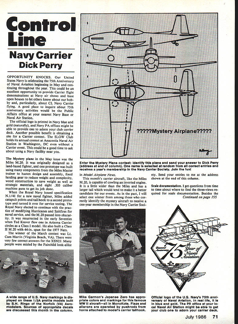 Control Line Navy Carrier Dick Perry OPPORTUNITY KNOCKS United States Navy celebrating 75th Anniversary Naval Aviation beginning May con tinuing throughout year could excellent opportunity provide Carrier flight demonstrations Navy air shows base open houses let others know about hob particularly about CL Navy Carrier flying good place inquire about 75th anniversary activities would Public Affairs office nearest Navy Base Naval Air Station official logo printed Navy blue gold naturally Navy PA offices might able provide adorn club carrier deck Another possible benefit obtaining site Carrier contest SLOW Club holds its annual contest Anacostia Naval Air Station Washington DC Carrier event could good time ask about using Navy facility near Mystery plane May issue Miles M20 originally designed land-based fighter prototype built using components Miles Master trainer hasten design assembly fixed landing gear reduce weight complexity wood construction save weight well strategic materials eight 303 caliber machine guns get its job done Royal Navy issued specification Nl/41 new naval fighter Miles added catapult points tail hook second proto type turned over service testing Royal Navy elected continue prac tice modifying Hurricanes Spitfires naval service M20 passed obscur ity resurrected early Seventies Ted Kraver flew Arizona Carrier circles Class model also built Class II M20 44-in span 1977 Nats winner March contest Lt Cam Martin Virginia Beach VA very few correct answers XSN2J people misled Fairchild look-alike Model Airplane News months carrier aircraft like Miles M20 capable cowling inverted engine little wider Miles has larger tail would tend make better candidate events As past will select winner among cor rectly identify mystery aircraft receive one-year membership Navy Carrier Soci Scale documentatIon get questions time time about find three-views re quired scale documentation Besides Continued page 155 Official logo US Navys 75th annI versary Naval Aviation real life i blue gold PR office lo cal Naval Air Station might able get club adorn carrier deck July1986 71 Enter Mystery Plane contest identify plane send answer Dick Perry address end column name selected random correct entries receives years membenhip Navy Carrier Society Join funl ety Send entries address shown end column wide range US Navy markings dis played 112A profile models built SH Ringo Norfolk VA Aero modelers Sources appropriate decals discusased month column Mike Garmons Japanee Zero has appro priate colors markings famous WW ii aircraftall MonoKote Flaps ailerons operated pushrods horns attached models carrier talihook altitude maintain what youve got Dont compound error chasing level flight Establish target. tree light pole etc pullout point Upon returning up wind foot pull up directly overhead same path first pass As pass over head turn body one-quarter turn left pick out aiming point nail upright pullout right five feet common Wingover errors miss ing wind t begin directly upwind significant breeze following same track both Wingovers couple hints strong breeze sometimes hard fly crisp entry directly up wind Try moving hand briskly toward body giving Up control effectively shortening lines seldom problem inverted pull up P-Factor help ing ive also wise windy day enter ever lightly before directly upwind mostly lure dont pull up too late too-late pull ip devastating error wind ne good manevuer becomes al nost impossible find yourself suddenly ballooning tour pullouts Wingover proba ly pulling out wind rather direct y downwind due either improper entry saving changed headings overhead Check efore tweaking anything Last item month round Loops /ell discuss Insides recognize utsides identical reversed After last months column should naking nice brisk entries round naneuvers thus half prob ems solved should have noticed oops becoming compact shapes nore clearly defined ideal air loops hould darn near perfect simply learn ng proper entry practicing wind blows move naps around wind discussed arlier will probably notice loops elon ating horizontally trying walk down vind Correct tendency using slightly ess control climbing penetrate vind slightly control coming downtill avoid being blown downwind Done cor ectly loops will stay round concentric nd speed will get out hand ruthlessly critical shape ound maneuvers Just because top 450 nd bottom five feet doesnt make ound Avoid flat spots obvious changes lie radius loops calm air critical area lowest oint ioop Step back couple steps U INSTOCKFORIMMEDIATESI4IPMENT NEW RA 508$19995 Now Quadra 35 CDI 13-bearIng$11496 Rag Quadra 36 $10496 wIth Briaghelle flywheel$12496 Rag Quadra 35 ower Aaaenbly Only$6450 QUADRA REPAIR$1000 plus penal Jim Measer ERCOUPEPLANS $2396 SEMI-KIT $9696 Jim Meaaer TOMAHAWK PLANS *2396 SEMI-KIT 69696 Jim Meaner 6-BALL TRPLANS $2396 SEMI-KIT 4969g Jim Meaner ACROBATPLANS 81996 SEMI-KIT 669J6 MALONEY 100 $14096ZENOAH 6-36 $11496 SACHS-DOLMAR31 rag $2450037 rag $36500 FLOATS 461/4 scale carca $2196 complete kit $4796 10 WWI WHEELS 63696 P/K Spring Starter$2400 PLANS SUPER STEARMAN 1/4 lGodfrayi$3696 1/3 TAYLORCRAFT 1L3 CUB NelItn$2996 Volkoplene 1/3/Chicken Charlie$2396 Colored Inatrumenta 161 Cadarhidge Scale /0-6296 /0-0396 SereosH-306 42 $1296 World S-lB fun large modem 03600 PROPSr sines Zinger Tup Flita Dynathruat 20% OFF US Quadra FUEL TANKS16 $69632 $700 FIBERGLASSARROWSHAFTSB/16s32long6/41396 24 Hoar Sendue $250 pestage Seed Bask Check Aeaey Order JIM MESSERS QUALITY MODEL PRODUCTS Vahy View Dr Box 43 ANgany NY 14706 immediately after passing point avoid wake turbulence next time around Stay tuned Ted Fancher 158 Flying Cloud Isle Foster City CA 94404 CL Scale/Boss Continued page 70 scale plans three-view drawings can also provide plan enlarging reduction services Three dollars SPPS 3209 Madison Greens boro NC 27403 will get 25-page catalog listing complete line scale documentation have available letter overseas copy letter Mr Zbigniew Luranc Poland 