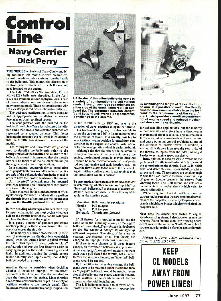 Control Line Navy Carrier Dick Perry THE SERIES basics Navy Carrier model ing continues month Aprils column dis cussed three-line control systems handle bellcrank month discussion control systems starts belicrank goes forward engine L-R Products 7787 Archdale Detroit MI 48228 bellcranks described April issue available four configurations Three configurations shown accom panying photograph bellcranks come elevator pushrod either inboard outboard outboard configuration compact appropriate installation narrow fuselages other confined spaces configuration pushrod inside circle offers less-cluttered installa tion since throttle elevator pushrods separated greater distance factor becomes important bellcrank installed throttle arm toward rear model upright inverted designations used describe bellcranks refer configuration ofthe throttle arm relative belicrank mount assumed throttle arm will forward beilcrank mount engine side applications standard counterclockwise installation upright beilcrank would mounted top side bellcrank platform model order have throttle arm toward engine An inverted bellcrank must mounted below bellcrank platform place throttle arm toward engine mounted standard maimer up right top inverted underneath pull throttle lever handle will produce pull throttle pushrod model Before deciding type bellcrankto buy particular model must decide whether pull throttle lever handle will open close throttle engine purely matter personal preference whether pulling throttle lever toward flier opens closes throttle majority Carrier modelers set up control systems throttle open high speed throttle lever pulled toward flier pull open push close configuration allows first finger assist carrying pull model during high-speed flight addition opening throttle comes rather naturally Up elevator should both needed hurry Another factor consider deciding whether install upright inverted bellcrank direction motion required open throttle engine Most throttles have control arms can put variety positions relative throttle barrel feature allows modeler change position throttle arm 1800 reverse direction travel required open throttle front-intake engines also possible rotate carburetor 1800 its mount reverse direction travel usually possible select throttle-arm position maximum con venience engine control installation Select configuration easiest build Although throttle arm bellcrank usually side bellcrank toward engine design model may such would convenientbecause pushrod routing engine tank location etcto have throttle arm rear bellcrank Again either configuration acceptable pick installation easiest summarize four factors consider determining whether use upright inverted bellcrank sake discussion assume standards listed following table apply starting point Mounting Handle Engine Bellcrank Bellcrank above platform Pull open Pull open Throttle arm forward factors particular model same summary above upright bellcrank required change factors list causes change type bellcrank required Therefore no changes two changes four factors changed upright bellcrank needed change three factors change inverted bellcrank appropriate As example ifthe engine characteristics such pull closed throttle other factors remained unchanged inverted bellcrank would needed addition engine change bellcrank mounted under mount upright bellcrank would needed though bellcrank placed under mount What matters combination factors making up total installation L-R bellcranks have total travel throttle arm 1 throw appropriate extending length carba throt tle arm possible match throttle pushrod movement available bellcrank requirements carb An exact match provides smooth accurate con trol engine speed reduces mechan Ical stress carb parts exhaust-slide applications majority commercial carburetors have throttle-arm movement about ismatch throws can put excessive loads carburetor cause potential control problems extremes throttle travel addition mismatch throws increases sensitivity throttle inputs pilot making harder set engine speed precisely opinion easiest way overcome problem throttle travel mismatch extend control arm throttle use /32-in-thlck brass attach extension 0-80 machine screws nuts screws small enough fit intheA6-in holes throttle arm drop glue Loctite prevents screws vibrating loose 0-80 screws nuts common item hobby shops cater model railroading using extended throttle arm carburetor sure new arm remains well clear propeller especially Taipan other brands have blades extend aft propeller hub Next time subject will switch engine speed-control systems also hope resume Mystery Plane feature soon drawing board didnt survive move South Dakota hope have repaired before next column due Richard L Perry 10035 Deadwood Ave Ellsworth AFB SD 57706 June1987 77 Products three-line belicranks come variety configurations suit various needs Elevator pushrods can originate either side crank inboard R out board L difference btween Upright Land Bottom inverted Top belicranks explained column KEEP CL MODELS AWAY FROM POWER LINES