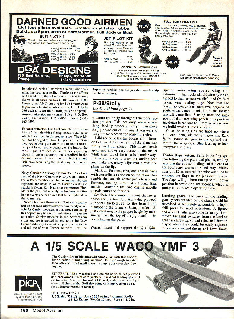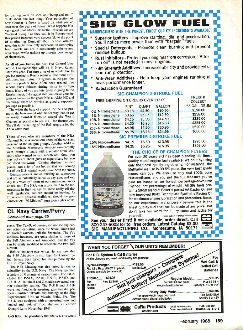 THE MYSTERY PLANE December issue Curtiss XSC-2A Seahawk Seahawk last Curtiss aircraft reach full production ending almost 40 years aircraft manufacturing Curtiss built over 30 different air craft designs Navy including examples almost type aircraft flown Navy except helicopters Seahawk also last shipboard floatplane used Navy last scout ob servation type well Rescue duties taken over helicopters aircraft carriers became capital ship choice providing attack air craft capable assuming observation re connaissance function scouts two basic versions Seahawk SC-i SC-2 Both variants de signed used primarily seaplanes launched catapult battleships cruisers SC-i saw action near end World War II received letter William Hainsworth first two pilots fly SC-i combat during invasion Borneo June 1945 Receiving letters such best part including Mystery Plane feature column also received letter Hal deBolt Hal addition being longtime modeler de signer considerable note also test pilot Seahawk test tasks included carrier suitability tests simulated carrier deck quite laudatory comments about fly ing qualities performance Seahawk well about its good looks experimental version Seahawk XSC-2A carried arresting hook therefore suitable prototype Carrier events particular alrcraft first prototype SC-2 variant new engine round cowling new fin shape new bubble canopy arresting hook re moved following testing suffix removed well William Hainsworth lucky winner se lected correctly identified XSC-2A As before will select name ran dom correctly identify Mys tery Carrier Aircraft column winner will receive one-year membership Navy Carrier Society Carrier-based Mustangs received letter fol lowing description new replicas Sterling P-51 Yak-9 profile kits ques tioned legality alrcraft Carrier Continued page 159 must Hellcat month Bob Bischoffs F6F Profile Carrier ship L scratch-built copy Sterlings old kit except uses foam wing Operating features include flaps aileron rudder line-slider Power K&B 58cc chicken-hopper tank Eric Tomchik photo right Chris Sorensen holds model Bob resets line slider prior flight Photo Gene Hempel February 1988 65 Conoi Line Navy Carrier Dick Perry 10034 Deadwood Ave Ellsworth AFI SD 57706 Mail correct identlllcation plane Dick Perry address given top column might win free years membership Navy Carrier Society John Castiglioni designed pair F6F-5 Heilcats drone control color scheme blue fuselage yellow flight surfaces red bands rudder makes really stand out Class II ship foreground spans 36 uses Rossi 65 power Class model spans 32 uses K&B 65cc engine causing such idea bump-and-run think about last thing perception Combat flown based what youve seen over years flying What happens very good pilot adopts tacticor shall say tactical flying call Europeand person becomes very successful point dominating Combat Most people whove tried tactic have succeeded destroying both models consistently gaining advantage racking up pretty poor image themselves As know next FAI Control Line World Championships will Kiev Russia later year Im sure lot us would like go getting Russia seems little diffi cult say flying England past team supporters have often treated like second-class citizens during visits foreign lands interested going Russian meet Id suggest make tentions known good folks AMA HQ encourage provide good supporter package possible wider base support FAI pro gram betterand what better way get Combat fliers attend World Champs possible see themselves Theyll selling FAI program AMA after members NRA National Rifle Association know constant pressure antigun groups Another AMA American Motorcycle Associationrecently went through battle senator Mis souri wanted ban superbikes Now may care about guns superbikes can insert words Combat airplane places lot hot air coming Out US capital would have same Combat models exciting superbikes potentially lethal gun day family sport may come under attack too NRA great help mo torcyclist fighting against some really off-thewall legislation should looking friends possible coalitions should gov ernment 60 Minutes turn sights us CL Navy Carrier/Perry Continued page 65 event Yak-9 course did see car rier action testing since Soviet Union no aircraft carriers until Seventies Yak outlines however quite similar Bell Airabonita Airacobra Yak can easily modified resemble two Bell aircraft Before someone else writes let state P-39 Airacobra also legal Carrier fly ing having tested purpose British Royal Navy P-51 Mustang also tested carrier suitability US Navy Navy operated variety Mustangs various times list cluded P-51A P-51B P-51C P-51D P-51H B C models saw actual car rier suitability testing P-51B P-51H fitted arresting gear did per form simulated takeoffs landings Ship Experimental Unit Mustin Field PA P-51D equipped arresting hook landed took off aircraft carrier Shangri-La November 1944 G-S Kits possibility G-S kits would p U U U U U U U I I U U U U U U U U U U U I I U U U U I U U U U U U SIG GLOW FUEL MANUFACTURED WITH THE PUREST FINEST QUALITY INGREDIENTS AVAILABLE * Superior Igniters Improve starting idle acceleration Youll notice power bargain fuels * Special Detergents Promote clean burning prevent residue buildup * Rust Inhibitors- Protect engines corrosion After run oil needed engines * Film Strength Additives Increase lubricity provide extra lean run protection * Anti-Wear Additives Help keep peak performance longer Satisfaction Guaranteed SIG CHAMPION 2-STROKE *FUELI FREIGHT FREE SHIPPING ON ORDERS OVER $1500COLLECT PINTQUARTGALLON55 GAL DRUM 0%Nitromethane$315$450$1050$19000 5%Nitromethane$365$525$1250$25800U 10%Nitromethane$415$550$1450$32500 15%Nitromethane$430$625$1650$38500I 25%Nitromethane$495$750$2095$52000 35%Nitromethane$575$875$2495$66000 SIGPREMIUM4-STROKE FUEL 10% Nitromethane $415$550$1395$29500 15% Nitromethane$425 $625 $1595 $35900 CHOICE OF CHAMPION FLYERS over 20 years SIG has blending finest quality model engine fuel available using finest quality i