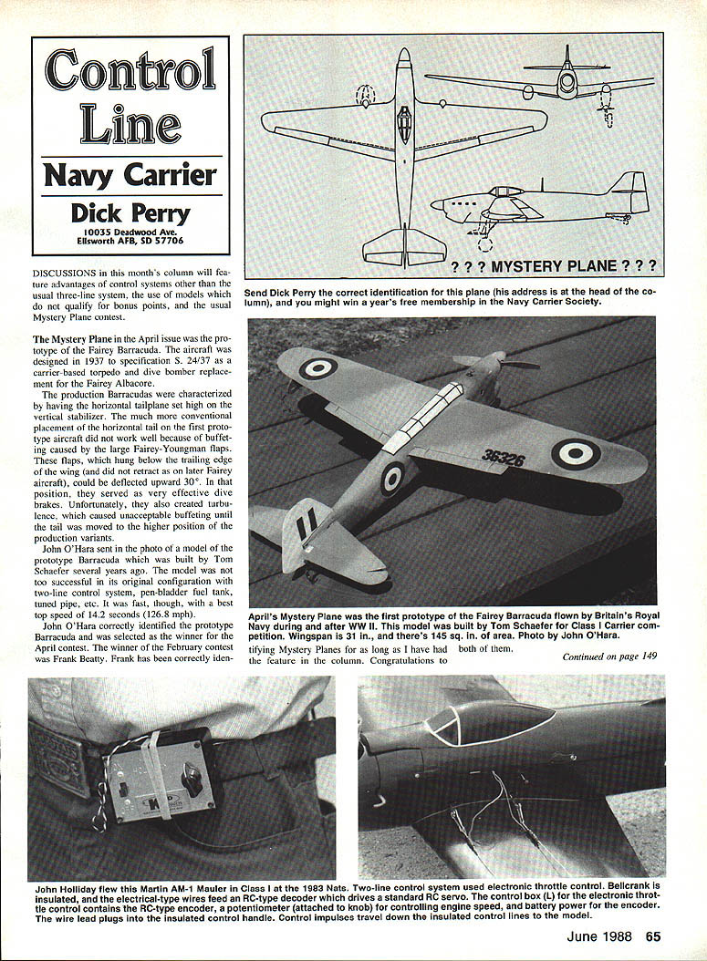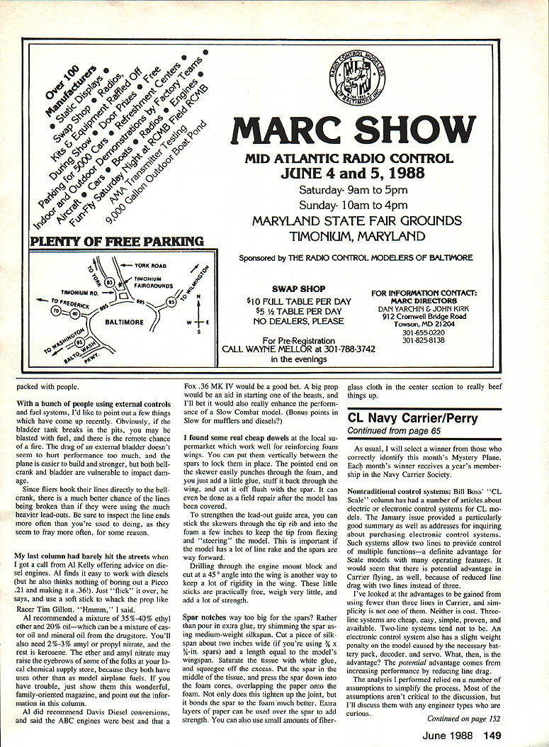 Send Dick Perry correct identification plane address head co lumn might win years free membership Navy Carrier Society DISCUSSIONS months column will fea ture advantages control systems other usual three-line system use models qualify bonus points usual Mystery Plane contest Mystery Plane April issue pro totype Fairey Barracuda aircraft designed 1937 specification 5 24/37 carrier-based torpedo dive bomber replace ment Fairey Albacore production Barracudas characterized having horizontal tailplane set high vertical stabilizer much conventional placement horizontal tail first proto type aircraft did work well because buffet ing caused large Fairey-Youngman flaps flaps hung below trailing edge wing did retract later Fairey aircraft could deflected upward 300 position served very effective dive brakes Unfortunately also created turbu lence caused unacceptable buffeting until tail moved higher position production variants John OHara sent photo model prototype Barracuda built Tom Schaefer several years ago model too successful its original configuration two-line control system pen-bladder fuel tank tuned pipe etc fast though best top speed 142 seconds 1268 mph John OHara correctly identified prototype Barracuda selected winner April contest winner February contest Frank Beatty Frank has correctly iden Ionn noiiioy siuw sni ivutriin AM-i Mauler Class 1983 Nats Two-line control system used electronic inrottie control wicrn 5 insulated electrical-type wires feed RC-type decoder drives standard RC servo control box L electronic throt tle control contains RC-type encoder potentiometer attached knob controlling engine speed battery power encoder wire lead plugs insulated control handle Control impulses travel down insulated control lines model June 1988 65 Cono Line Navy Carrier Dick Perry 10035 Deadwood AvL Ellsworth AFB SD 57706 Aprus mystery Plane first prototype Fairey Barracuda flown Britains Royal Navy during after WW II model built Tom Schaefer Class Carrier com petition Wingspan 31 theres 145 sq area Photo John OHara tifying Mystery Planes long have both feature column Congratulations to Continued page 149 0 cf b 0 000 PLENTY OF FREE PARKING Yc C // IA \3/ FAIIIOROUNDS NI * VIMONIUM NO40 N BALTIMORE ~S MARC SHOW MID ATLANTIC RADIO CONTROL JUNE 4 5 1988 Saturday- 9am 5pm Sunday- 10am 4pm MARYLAND STATE FAIR GROUNDS TIMONIUM MARYLAND Sponsored ThE RADK CONTROL MODELERS OF BALilMORE SWAP SHOP $10 FULL TABLE PER DAY $5 E PER DAY NO DEALERS PLEASE Pre-Registration CALL WAYNE MELLOR 301-788-3742 evenings FOR IrIFORMAflOlI COIflACF MARC DIRECTORS DAN YARCHIN & JOHN KIRK 912 Cromwell Bridge Road Towsori MD 21204 301655-0220 301825-8138 packed people bunch people using external controls fuel systems Id like point out few things have come up recently Obviously bladder tank breaks pits may blasted fuel remote chance fire drag external bladder doesnt seem hurt performance too much plane easier build stronger both bellcrank bladder vulnerable impact dam age Since fliers hook lines directly bellcrank much better chance lines being broken using much heavier lead-outs sure inspect line ends often youre used doing seem fray often some reason last column barely hit streets got call Al Kelly offering advice die sel engines Al finds easy work diesels also thinks nothing boring Out Picco 21 making 36 Just flick over says use soft stick whack prop like Racer Tim Gillott Hmmm said Al recommended mixture 35 %-40% ethyl ether 20% oilwhich can mixture cas tor oil mineral oil drugstore Youll also need 2%-3% amyl propyl nitrate rest kerosene ether amyl nitrate may raise eyebrows some folks lo cal chemical supply store because both have uses other model airplane fuels have trouble just show wonderful family-oriented magazine point out infor mation column Al did recommend Davis Diesel conversions sald ABC engines best Fox 36 MK IV would good bet big prop would aid starting beasts Ill bet would also really enhance perform ance Slow Combat model Bonus points Slow mufflers diesels found some real cheap dowels local su permarket work well reinforcing foam wings can put vertically between spars lock place pointed end skewer easily punches through foam just add little glue stuff back through wing cut off flush spar can done field repair after model has covered strengthen lead-out guide area can stick skewers through sip rib foam few inches keep tip flexing steering model important model has lot line rake spars way forward Drilling through engine mount block out 45 0 angle wing another way keep lot rigidity wing little sticks practically free weigh very little add lot strength Spar notches way too big spars Rather pour extra glue try shimming spar us ing medium-weight silkspan Cut piece silkspan about two inches wide youre using % x A-in spars length equal models wingspan Saturate tissue white glue squeegee off excess Put spar middle tissue press spar down foam cores overlapping paper onto foam does tighten up joint bonds spar foam much better Extra layers paper can used over spar add strength can also use small amounts fiberglass cloth things up center section really beef CL Navy Carrier/Perry Continued page 65 As usual will select winner correctly identify months Mystery Plane months winner receives years member ship Navy Carrier Society Nontraditional control systems Bill Boss CL Scale column has number articles about electric electronic control systems CL mo dels January issue provided particularly good summary well addresses inquiring about purchasing electronic control systems Such systems allow two lines provide control multiple functionsa definite advantage Scale models operating features would seem potential advantage Carrier flying well because reduced line drag two lines instead three Ive looked advantages gained using fewer three lines Carrier sim plicity Neither cost Threeline systems cheap easy simple proven available Two-line systems tend An electronic control system also has slight weight penalty model caused ne