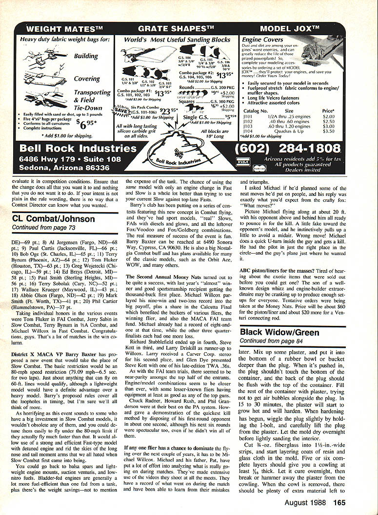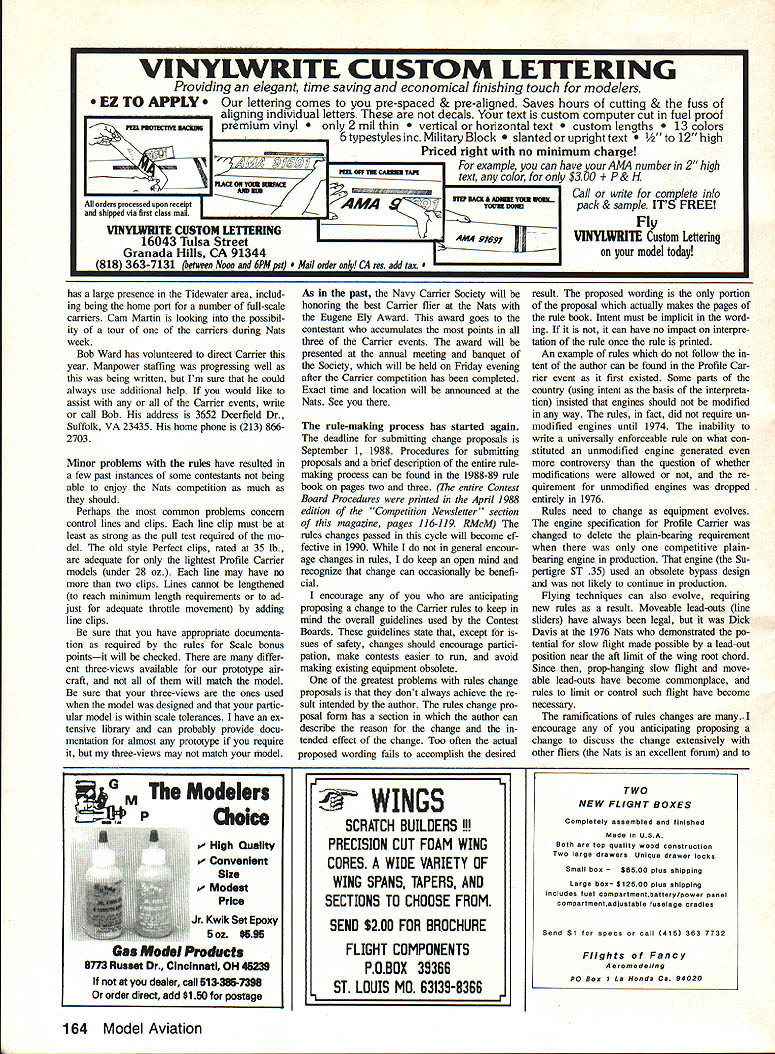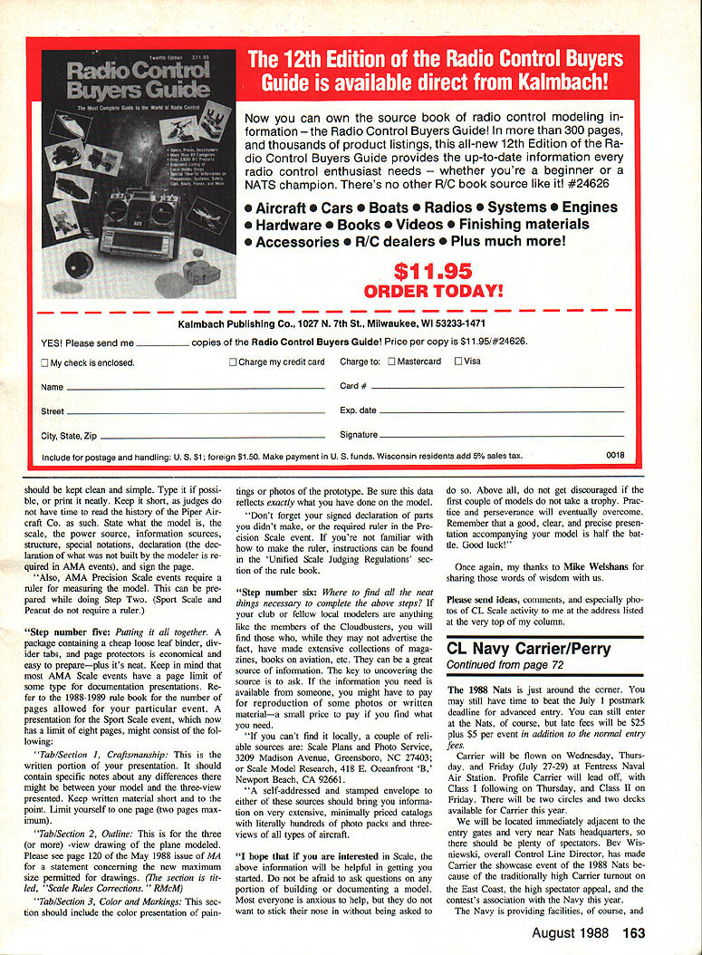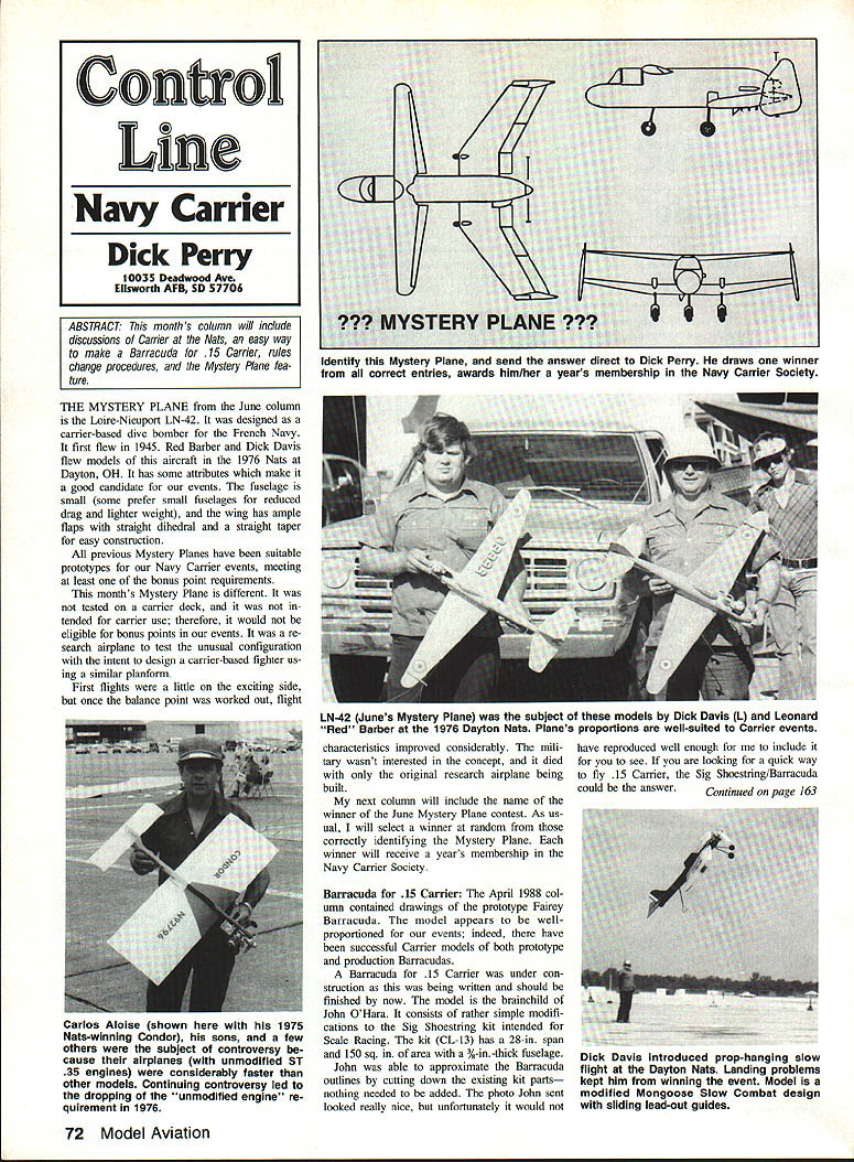 THE MYSTERY PLANE June column Loire-Nieuport LN-42 designed carrier-based dive bomber French Navy first flew 1945 Red Barber Dick Davis flew models aircraft 1976 Nats Dayton OH has some attributes make good candidate events fuselage small some prefer small fuselages reduced drag lighter weighs wing has ample flaps straight dihedral stralght taper easy construction previous Mystery Planes have suitable prototypes Navy Carrier events meetsng least bonus point requirements months Mystery Plane different tested carrier deck tended carrier use therefore would eligible bonus points events re search airplane test unusual configuration intent design carrier-based fighter us ing similar planform First flights little exciting side once balance point worked out flight characteristics improved considerably mili tary wasnt interested concept died original research airplane being built next column will include name winner June Mystery Plane contest As us ual will select winner random correctly identifying Mystery Plane winner will receive years membership Navy Carrier Society Barracuda 15 Carrier April 1988 col unm contained drawings prototype Fairey Barracuda model appears wellproportioned events indeed have successful Carrier models both prototype production Barracudas Barracuda 15 Carrier under con struction being written should finished now model brainchild John OHara consists rather simple modifi cations Sig Shoestring kit intended Scale Racing kit CL-13 has 28-in span 150 sq area %-in-thick fuselage John able approximate Barracuda outlines cutting down existing kit pans nothing needed added photo John sent looked really nice unfortunately would zF have reproduced well enough include see looking quick way fly 15 Carrier Sig Shoestring/Barracuda could answer Continued page 163 72 Model Aviation Confrol Line Navy Carrier Dick Perry 10035 Deadwood Ave Ellsworth AFB SD 57706 ABSTRACT This months column will include discussions Carrier Nats easy way make Barracuda arrier rules change procedures Mystery Plane fea ture ? MYSi Identify Mystery Plane send answer direct Dick Perry draws winner correct entries awards him/her years membership Navy Carrier Society LN-42 Junes Mystery Plane subject models Dick Davis 1 Leonard Red Barber 1976 Dayton Nats Planes proportions well-suited Carrier events Carlos Aloise shown 1975 Nats-winning Condor sons few others subject controversy cause airplanes unmodified ST 35 engines considerably faster other models Continuing controversy led dropping unmodified engine re quirement 1976 --Dick Davis Introduced prop-hanging slow flight Dayton Nats Landing problems kept him winning event Model modified Mongoose Slow Combat design sliding lead-out guides Now can own source book radio control modeling formation o Control Buyers Guide 300 pages thousands product listings all-new 12th Edition Ra dio Control Buyers Guide provides up-to-date information radio control enthusiast needs her youre beginner NATS champion Theres no other R/G book source like #24626 Aircraft Cars Boats 0 Radios e Systems nes Hardware Books e Videos e Finishing materials Accessories S R/C dealers Plus much morel $1195 ORDER TODAY YES Please send me copies Radio Control Buyers Guide Price per copy $11 95/#24626 D check enclosed Name D Charge credit cardCharge E Mastercard LI Visa Card # Exp date City State ZipSignature Include postage handling U S $1 foreign $150 Make payment U S funds Wisconsin residents add 5% sales tax should kept clean simple Type possi ble print neatly Keep short judges have time read history Piper Air craft Co such State what model scale power source information sources structure special notations declaration dec laration what built modeler re quired AMA events sign page Also AMA Precision Scale events require ruler measuring model can pre pared doing Step Two Sport Scale Peanut require ruler Step number five Putting together package containing cheap loose leaf binder div ider tabs page protectors economical easy prepareplus its neat Keep mind AMA Scale events have page limit some type documentation presentations Re fer 1988-1989 rule book number pages allowed particular event presentation Sport Scale event now has limit eight pages might consist fol lowing Tab/Section 1 Craftsmanship written portion presentation should contain specific notes about differences might between model three-view presented Keep written material short point Limit yourself page two pages max imum Tab/Section 2 Outline three -view drawing plane modeled Please see page 120 May 1988 issue MA statement concerning new maximum size permitted drawings section tit led Scale Rules Corrections RMcM Tab/Section 3 Color Markings sec tion should include color presentation paintings photos prototype sure data reflects exactly what have done model Dont forget signed declaration parts didnt make required ruler Pre cision Scale event youre familiar make ruler instructions can found Unified Scale Judging Regulations sec tion rule book Step number six find neat things necessary complete above steps club fellow local modelers anything like members Cloudbusters will find may advertise fact have made extensive collections maga zines books aviation etc can great source information key uncovering source ask information need available someone might have pay reproduction some photos written materiala small price pay find what need cant find locally couple reli able sources Scale Plans Photo Service 3209 Madison Avenue Greensboro NC 27403 Scale Model Research 418 E Oceanfront B Newport Beach CA 92661 self-addressed stamped envelope either sources should bring informa tion very extensive minimally priced catalogs literally hundreds photo packs threeviews types aircraft hope interested Scale above information will helpful getting started afraid ask questions portion building documenting model Most everyone anxious help want stick nose being asked Above get discouraged first couple models take trophy Prac tice perseverance will eventually o