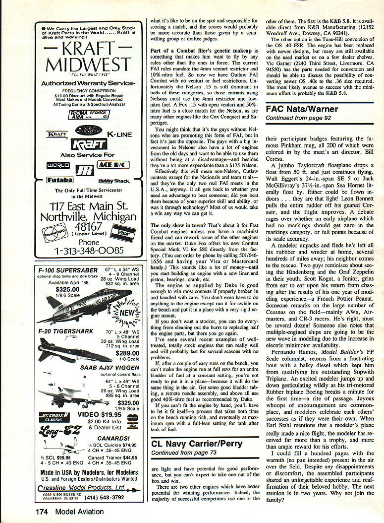 THE WINNER Mystery Plane contest June issue Leonard Red Barber surprisingly few correct answers plane Loire-Nieuport LN-42 probably because French aircraft designed carrier operations beginning World War II produced very small numbers saw little action role tended aircraft August issue Miles M35 Libellula name derived sci entific name dragonfly based tandem-wing layout shared aircraft insect easier-to-remember common name already used deHavilland DH 90 50 Libellula ended up name almost obscure aircraft itself Difficulties Ministry Aircraft Pro duction brought fact Libellula built Ministrys knowledge ap proval combined George Miles criticism Admiralty tended severely limit official enthusiasm concept operational fighter based configuration walt 30 years Burt Rutan make configuration successful civil applications Jerry Martins name selected among correctly identified Libellula Red Barber have awarded years membership Navy Carrier Society correct answers Mystery Plane month first car rier aircraft design include retractable tricycle landing gear gear design became stan dard carrier aircraft airplane didnt fare well think youve seen air plane around Carrier circles perhaps remem ber Douglas Skypirate appeared Model Airplane News 1966 photo Class Skypirate 1976 Nats Sorry Mystery Plane Skypirate can identify aircraft send name address head column Ill select winner correctly iden tify Mystery Plane Rules proposals time published 1990-91 rules cycle will very near end period allowed submitting proposed changes rules proposals must submitted AMA HQ postmarked before September 1 1988 As write have seen Car rier proposal Since will three months before see column again Nats coverage will appear next month will usual onemonth skip will have opportunity dis cuss proposals column timely manner Change proposals will printed Compe tition Newsletter section magazine ? MYSI concerned about future event please make point review proposals published write Control Line Contest Board member district address Competition Directory listing Competition Newsletter section have chance influence outcome rules change process oniy participate Profile-class engines proposed change have seen would change Profile Carrier engines maximum displacement 3600 cu 4028 Similar proposals have sub mitted past have defeated parallel proposal change engines Slow Rat same way intent proposal allow Pro file Carrier engines can obtained read ily true relatively large number RC 40s market Some good purposes others availability engines going make easier competitive event Being top competitor still going require work Changing lOs will allow people find largest allowable engine dealers shelves mail order catalogs modeler out knowledge event would stand better chance buying engine good competi tion potential because larger propor tion good RC engines 40 size 36 range better engines tend expensive few bargains competition engines Picking winner will require knowledge engines event Trial-and-error will also expen sive possible obtain good engine Pro file Carrier nowwithout going lOs trial-and-error doing anything reading column and/or High-low Land ing newsletter Navy Carrier Society Fox engines have competitive Combat years local Combat flier may have good used engine getting hard start its hot Parts available Fox Man ufacturing Co 5305 Towson Ave Fort Smith AR 72901 carb available fits square intake Combat Special engines Continued page 174 October 1988 73 Control Line Navy Carrier Dick Perry 10035 Deadwood Ave Ellswortb AFI SD 57706 E Send identification plane Dick Perry address given top col umn correct entries will win years membership Navy Carrier Society Greg Bakers Douglas Skypirate Class has K&B 40S power features movable flaps rud der Its similarities months Mystery Plane obviousbut theyre similarities F-100 SUPERSABER 67 L x 54 WS tanks dive brake4 9 Channel optional drop28 oz Wing Load Available AprIl 88832 sq area $32500 1/86 Scale F-20 TIGERSHARK70 L x 48 WS 5 Channel z Wing Load 712 sq area $28900 1/8 Scale SAAB AJ37 VIGGEN optional Canard tiaps 64 Lx 45 WS 5 6 Channel z Wing Load 895 sq area $32900 1/95 Scale VIDEO $1995 $200 Kit Info ____ & Dealer List CANARDSI SOL Quickie $7495 4 OH 5 ENG SCL $9995Canard Trainer $4495 4-5CHS4OENG4CH 35-45ENG Made USA Modelers Modelers US Foreign Dealers/Oistributors Wanted Cressline Model Products Ltd. W23a Nieso 8USSC RD WAUKESHA WI 53188 414 548-3792 what its like spot responsible scoring match scores would probably accurate given semiwilling group draftee judges Part Combat fliers genetic makeup something makes him want fly rules other ones force current FM rules mandate 4mm venturi restrictor 10%-nitro fuel So now have Outlaw FM Combat no venturi fuel restrictions Un fortunately Nelson 15 still dominant both categories entrants using Nelsons must use 4mm restrictor low nitro fuel Fox 15 open venturi 50%nitro fuel close match Nelson other engines like Cox Conquest Su pertigre might think its guys Nd sons promoting form FM fact its just opposite guys big vestment Nelsons also have lot engines old days want able use being disadvantageand besides theyre lot expendable $175 Nelson Effectively will mean non-Nelson Outlaw contests except Nationals team trials theyre two real FM meets USA anyway gets back whether need advantage beat someone did beat because superior skill ability through technology Most us would take wm way can get show town Thats about Fast Combat engines unless have machinist friend can rework some other engines market Duke Fox offers new Combat Special Mark VI fur $80 directly fac tory can order phone calling 501/6461656 having Visa Mastercard handy sounds like lot moneyuntil start building engine new liner piston bearings crank etc engine supplied Duke good enough win contests properly broken handied care dont have anything engine except run awhile bench put plane very rigid en gine mount dont want stocker can thing cleaning out burrs replacing half engine parts go again Ive