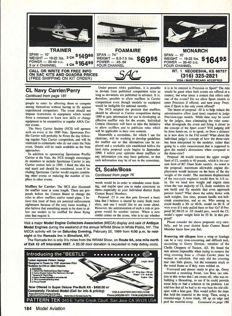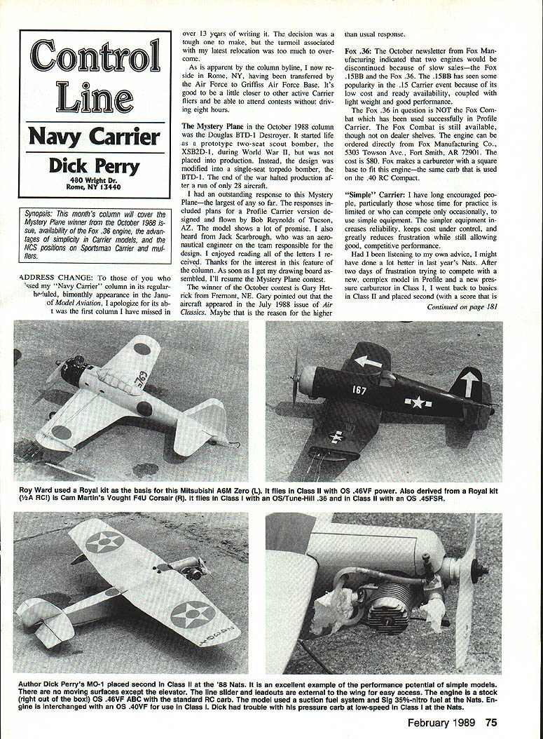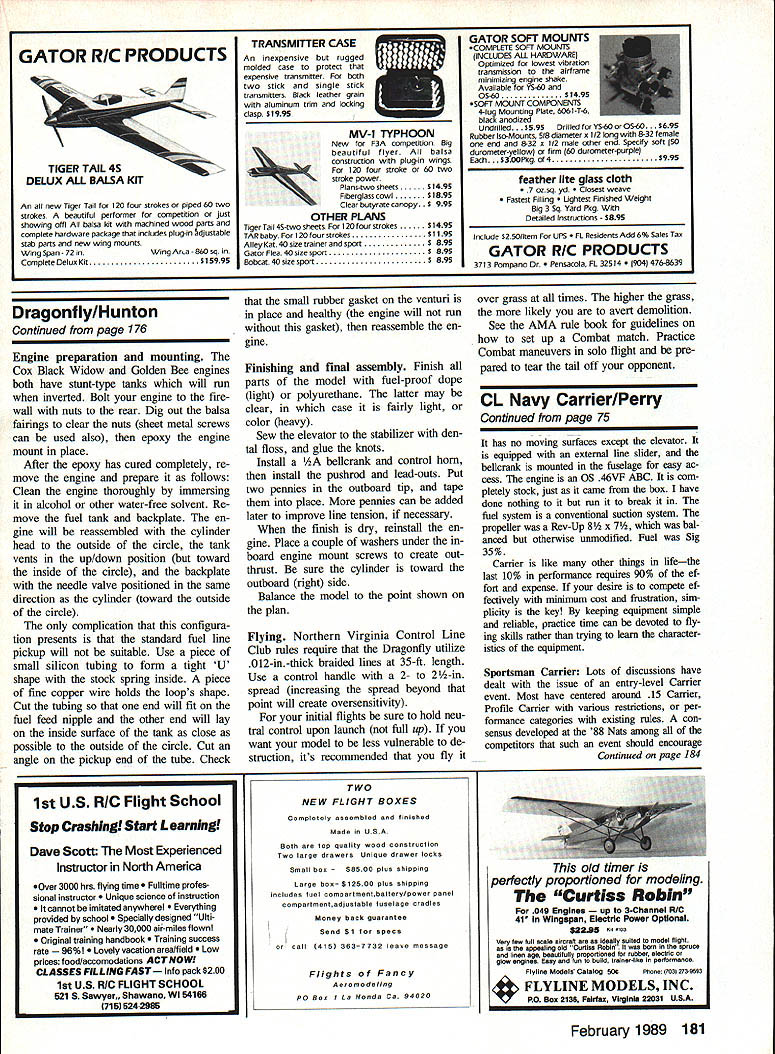 4DDRESS CHANGE ssed Navy Carrier column its regular h&uled bimonthly appearance Janu Model Aviation apologize its ab first column have missed over 13 yrs writing decision tough make turmoil associated latest relocation too much over come As apparent column byline now re side Rome NY having transferred Air Force Griffiss Air Force Base Its good little closer other active Carrier fliers able attend contests driv ing eight hours Mystery Plane October 1988 column Douglas BTD-l Destroyer started life prototype two-seat scout bomber XSB2D-l during World War H placed production Instead design modified single-seat torpedo bomber BTD-1 end war halted production af ter run 28 aircraft outstanding response Mystery Planethe largest far responses cluded plans Profile Carrier version de signed flown Bob Reynolds Tucson AZ model shows lot promise also heard Jack Scarbrough aero nautical engineer team responsible design enjoyed reading letters re ceived Thanks interest feature column As soon get drawing board sembled Ill resume Mystery Plane contest winner October contest Gary Het rick Fremont NE Gary pointed Out aircraft appeared July 1988 issue Air Classics Maybe reason higher usual response Fox 36 October newsletter Fox Man ufacturing indicated two engines would discontinued because slow salesthe Fox 15BB Fox 36 l5BB has seen some popularity 15 Carrier event because its low cost ready availability coupled light weight good performance Fox 36 question NOT Fox Com bat has used successfully Profile Carrier Fox Combat still available though dealer shelves engine can ordered directly Fox Manufacturing Co 5303 Towson Ave Fort Smith AR 72901 cost $80 Fox makes carburetor square base fit enginethe same carb used 40 RC Compact Simple Carrier have long encouraged peo ple particularly time practice limited can compete occasionally use simple equipment simpler equipment creases reliability keeps cost under control greatly reduces frustration still allowing good competitive performance listenlng own advice might have done lot better last years Nats After two days frustration trying compete new complex model Profile new pres sure carburetor Class I went back basics Class II placed second score Continued page 181 Roy Ward used Royal kit basis Mitsubishi A6M Zero L flies Class II OS 46VF power Also derived Royal kit lhA Rd Cam Martins Vought F4U Corsair R flies Class OSlTune-l1lll 36 Class II OS 45FSR Author Dick Perrys MO-i placed second Class II 88 Nab excellent example performance potential simple models no moving surfaces except elevator line slider leadouts external wing easy access engine stock right out box OS 46VF ABC standard RC carb model used suction fuel system Sig 35%-nitro fuel Nats En gine Interchanged OS 4OVF use Class Dick trouble pressure carl low-speed Class Nats February 1989 75 Control Line Navy Carrier Dick Perry 480 WrIght Dr Rome NY 13440 Synopsis This months column will cover Mystery Plane winner October 1988 sue availability Fox 36 engine advan tages simplicity Carrier models NCS positions Sportsman Carrier muf flers GATOR RIC PRODUCTS TIGER TAIL 4S DELUX ALL BALSA KIT An new Tiger Tail 120 four strokes piped 60 two strokes beautiful performer competition just showing offi balsa kit machined wood parts complete hardware package includes plug-in adjustable stab parts new wing mounts Wing Span -72 inWing Arra 860 sq Complete Delux KitSi 5995 TRANSMITTER CASE An inexpensive rugged molded case protect expensive transmitter both two stick single stick transmitters Black leather grain aluminum trim locking clasp S 1995 MV-i TYPHOON New F3A competition Big beautiful flyer balsa construction plug-in wings 120 four stroke 60 two stroke power Plans-two sheetsS 1495 Fiberglass cowl51895 Clear butyrate canopy. S 995 OTHER PLANS Tiger Tail 4S-two sheets 120 four strokesS 1495 TAR baby 120 four strokesS 1195 Alley Kat 40 size trainer sport5 895 Gator Flea 40 size sport5 895 Bobcat 40 size sport5 895 feather Ilte glass cloth 7 ozsq yd est weave Fastest Filling est Finished Weight Big 3 Sq Yard Pkg Detailed Instructions 5895 Include $2 SOiltem UPS esidents Add 6% Sales Tax GATOR RIC PRODUCTS 3713 Pompano Dr acola FL 32514 476-8639 Dragonfly/HuntOn Continued page 176 Engine preparation mounting Cox Black Widow Golden Bee engines both have stunt-type tanks will run inverted Bolt engine fire wall nuts rear Dig out balsa fairings clear nuts sheet metal screws can used also epoxy engine mount place After epoxy has cured completely re move engine prepare follows Clean engine thoroughly immersing alcohol other water-free solvent Re move fuel tank backplate en gine will reassembled cylinder head outside circle tank vents up/down position toward inside circle backplate needle valve positioned same direction cylinder toward outside circle complication configura tion presents standard fuel line pickup will suitable Use piece small silicon tubing form tight U shape stock spring inside piece fine copper wire holds loops shape Cut tubing end will fit fuel feed nipple other end will lay inside surface tank close possible outside circle Cut angle pickup end tube Check small rubber gasket venturi place healthy engine will run gasket reassemble en gine Finishing final assembly Finish parts model fuel-proof dope light polyurethane latter may clear case fairly light color heavy Sew elevator stabilizer den tal floss glue kuots Install bellcrank control horn install pushrod lead-outs Put two pennies outboard tip tape place pennies can added later improve line tension necessary finish dry reinstall en gine Place couple washers under board engine mount screws create outthrust sure cylinder toward outboard right side Balance model point shown plan Flying Northern Virginia Control Line Club rules require Dragonfly utilize 012-in-thick braided lines 35-ft length Use control handle 2- 2-in spread increasing spread beyond point will create oversensitivity initial flights sure hold neu tral control upon launch full up want model less v