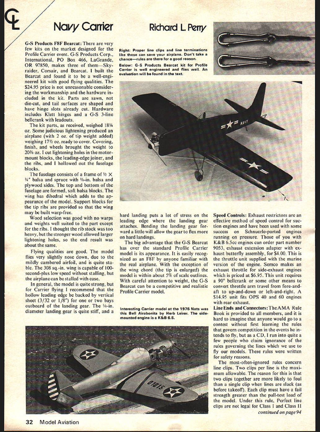 Navy Carner G-S Products F8F Bearcat very few kits market designed Profile Carrier event G-S Products Corp International P0 Box 466 LaGrande OR 97850 makes three themSkyraider Corsair Bearcat built Bearcat found well-engi neered kit good flying qualities $2495 price unreasonable consider ing workmanship hardware cluded kit Parts sawn die-cut tail surfaces shaped have hinge slots already cut Hardware includes Klett hinges G-S 3-line bellcrank leadouts kit parts received weighed 18Y4 oz Some judicious lightening produced airplane 2 oz tip weight added weighing 17 oz ready cover Covering finish wheels brought weight oz I cut lightening holes motormount blocks leading-edge joiner ribs hollowed out fuselage blocks fuselage consists frame lsa spruce -in balsa plywood sides top bottom fuselage formed soft balsa blocks wing has dihedral adds ap pearance model Support blocks tip ribs provided wing may built warp-free Wood selection good no warps weights well suited part except ribs thought rib stock too heavy stronger wood allowed larger lightening holes end result about same Flying qualities good model flies very slightly nose down due mildly cambered airfoil quite sta ble 308 sq-in wing capable 100second-plus low speed stalling airplane can stalled ease general model quite strong Carrier flying recommend hollow leading edge backed vertical sheet 3/32 1/8 two bays outboard landing gear /8-in diameter landing gear quite stiff Richard L Peny Right Proper line clips line terminations like can save airplane Dont take chancerules good reason Below G-S Products Bearcat kit Profile Carrier well engineered flies well An evaluation will found text hard landing puts lot stress leading edge landing gear attaches Bending landing gear ward little will allow gear flex hard landings big advantage G-S Bearcat has over standard Profile Carrier model its appearance easily recog nized F8F anyone familiar real airplane exception wing chord tip enlarged model within about 5% scale outlines careful attention weight G-S Bearcat can competitive realistic Profile Carrier model Speed Controls Exhaust restrictors effective method speed control suc tion engines have used some success Schnuerle-ported engines running pressure K&B 65cc engines can order part number 9053 exhaust extension adapter ex haust butterfly assembly $400 throttle unit supplied marine version engine Semco makes exhaust throttle side-exhaust engines priced $695 unit requires 900 bellcrank some other means convert throttle arm travel fore-andaft up-and-down left-and-right $1495 unit fits OPS 40 60 engines rear exhaust Line Ends ConnectorsTheAMA Rule Book provided members hard imagine anyone would go contest first learning rules govern competition events tends fly CD run quite few people claim ignorance rules governing lines use fly models rules written safety reasons most-often-ignored rules concern line clips Two clips per line maxi mum allowable reason two clips together likely foul single clip lines slack before takeoff clip must have fail strength greater pull-test load model Under rule Perfect line clips legal Class Class II continued page 94 32 Model Aviation Interesting Carrier model 1976 Nets Bell Airabonita Herb Leirer sidemounted engine K&B 65 CL Navy Carrier/Perry continued page 32 some Profile Carrier models illegal also un safe Nats year large Perfect clip failed during pull-test sub jected 25-lb load well-known Carrier modeler name will mention lost Class II model year Perfect clip up line failed flight Ive seen similar accidents other events photograph accompanying column depicts Pylon brand line connec tors Sullivan clips come two sizes rated 80 lb 110 lb other type clip will use have made myself photo also shows wrapped line terminations thimbles recom mended rule book two-line con struction Wrapped lines stronger crimped terminations easier inspect possible damage also easy make set can made watching favorite TV show thimbles available Perfect sleeves crimped line ends Sullivan serving wire included Larger thimbles included free small package modeling hardware buy local hobby shop Dont take chance losing air plane engine possibly injuring spectator fellow modeler right first time dont have again Soapbox Department numerous proposals before CLCB require reward realistic Profile Carrier models would like very much see realistic models event have talked Carrier modelers agree problems however almost proposals principal concern existing models made obsolete rule change mandatory require ment scale outlines close re semblance would make existing models illegal Scale bonus points can used effectively points awarded few enough non-scale existing models automatically eliminated competition requirement 5% scale tolerance however would eliminate kit airplaneseven G-S Bearcat think good idea Review proposals thinking about would like solve problems Get ready cross proposals would like add realism Profile event Write CLCB represen tative tell him support opposition various proposals way better event through participation rules-making process No has right complain about rules has never taken time let CLCB representative know opinions Richard L Perry 5016 Angelita Ave. Dayton OH 45424 Tutor ide Vries continued page 45 trailing edges Triangular stock added aft fuselage serve widened stabilizer platform fin pro vide reinforced fin/stabilizer gluing joint prototype model bit wood inlet lower edge rudder commercial tailwheel assembly chosen would fit 3/16thick surface long 3/32 music wire tailwheel strut will work other tailwheel bracketsand hold eter tailwheel Extra rudder hinges four recommended assure good rudder action reliable tailwheel steering Nothing much left covering radio installation always-onerous details finishing model Add windshield front dowel glassed areas use 030 clear buytrate plastic windshield windows Epoxy wing hole-down dowels place Bolt engine landing gear place use 2 diame ter main wheels Most radios lostin cavernous fuselage Tu