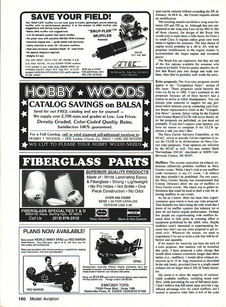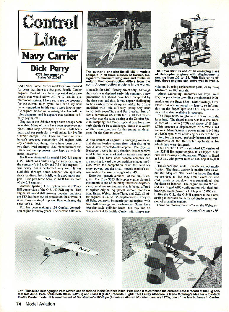 ENGINES Some Carrier modelers have moaned years few good Profile Carrier engines Most have supported rules pro posals would allow 40- 21-cu-in dis placement engines have yet see proposals current rules cycle cant say suggestions years stack involve pro file engines So far weve managed fend off rules changers appears patience fi nally paying off Engines 36 size range have always available have sport-type en gines often loop scavenged minus ball bear ings particularly well suited Profile Carrier competition Foreign manufacturers havent produced competition 36 engines consistency though have two short-lived attempts US manufacturers small-shop entrepreneurs have kept up de mand however K&B manufactured its model 8600 58 engine 35 built using same casting companys 65 40 75 46 engines heavy performed very well available through some competition specialty shops direct K&B good parts sup port use past tense because K&B has no 58 engines Another partial US option TuneHill conversion 05 40 FSR engine engine wasand still isvery popular since FSR has Out production no longer simple option Bear news isnt bad Fox has making 36 Combat competi tion engine years current ABC ver sion sells $100 factory-direct Although stock depleted early summer new production run should have completed time read may appear challenging fit carburetor its square intake have modified little difficulty using hand tools both SuperTigre Perry carbs Fox fers carburetor #23950 its 40 Deluxe en gine uses same casting Combat Spe cial Adapting Combat Special case Fox carb shouldnt challenge wealth aftermarket products engine devel oped Combat crowd new source engines emerging overseas motivation comes what few us would have expectedHelicopters 30-size Helicopters initially simpler less expensive models marketed trainers sport models have since become complex moving toward competition-minded mod eler competition came need power small models couldnt ac commodate size weight 40 Enter growth versions 28- 30 en gines Enya SS3S Helicopter engine pictured month increased-displace ment smaller-case engines being offered replace original equipment modifica tion Enya Webra SuperTigre OS fer engines 32 35 displacements Theyre light compact Schnuerle-ported engines twin ball bearings carburetors Some have heat-sink-style cylinder heads can easily adapted Profile Carrier simple machining using replacement parts using hardware RC aircraft Altech Marketing importers Enya very cooperative providing photo infor mation Enya 5535 Unfortunately Great Planes has answered letters informa tion SuperTigre OS engines re stricted data available catalogs Enya SS3S weighs 85 oz large head ringed piston runs steel liner bore 195mm 768 stroke 187mm 736 produce displacement 559cc 341 cu Manufacturers power rating 09 bhp 16000 rpm Most engines seem op timized speed probably because re quirements Helicopter applications designed OS 32F ABC standard RC version 32F-H Helicopter engine lapped ABC dual ball bearing configuration Weight listed 83 oz power rated 102 bhp 16000 rpm SuperTigre G-34H usable modi fication thrust washer smaller usual still adequate head has larger fins used arent excessive could easily cut down conventional size inclined engine weighs 95 oz ringed ABC configuration dual ball bearings Rated power 11 bhp 16000 rpm Unlike OS G-34H appears new casting rather increased displacement ver sion smaller engine have no information offer Webra enContinued page 179 74 Model Aviation Control LLne Navy Carrier Dick Perry 6739 Stonecutter Dr Burke VA 22015 authors one-size-fIts-all MO-i models nya SS35 emerging ciass compete three classes Carrier De- Helicopter engines displacements signed maximum wing area minimum ranging 32 35 WIth little no ef weight construction differs fort engines can serve well Profile norm construction article works Left MO-i belonging Pete Mazur described October issue Pete used establish current Class II record Sig con test last June Pete holds both Class 14282 Class 114561 records Right Fairey Albacore Merle Mohrlngs idea low-tech Profile Carrier model reminiscent Don Gerbers MO-Ripe American Aircraft Modeler January 1973 few biplanes Carrier done things problem still showed up during final coats Strangely problem didnt appear time showed up different spots airplane several ships popped up elevators began search Id used elevators test weather see getting blush before laying clear Coat over whole plane Sometimes Id used re tarder thinner following coat shortly after first coat Nothing unusual did re member occasion ink lines faded af ter coats felt sure secret hidden fo cused what different situation ginning basics looked spray setup using 25 psi regulated gun carrying pressure regulator compressorthis account drop twelve foot hose suddenly light bulb flashed As played setup noticed regulating 25 psi after first surge high pressure air blasting surface 50 psi made repeated short passes loading thick coat certain pieces Unknow ingly creating worst possible condi tion high pressure air thick wet layer clear undercoats softened air dislodged unstable surface Simple right under nose test Out theory refinished new ship After got color stabilized set regulator compressor just above 25 psi left gun regulator set 25 psi Everything worked very well nice finish no fading no craters good gloss New Products us sheet foam parts know difficult get good joints wing skins Ive tried sorts techniques worked OK never com pletely satisfied consistency time took watching Pro Stunt building tapes saw Windy Urtnowsky using fixture just ticket fixture composed two -in x 23A -in x 40 sheets Conan aligned end steel pins edges milled straight square use sandwich set skins tween sheets edges overlapping milled surfaces run long sanding block over sheeting edges until flush true fixture surfaces automatically gives straight edges surfaces perpendicu lar sheet surface Super joints beautiful skins cheap item around $100 does intended job superbly Contact Windy P