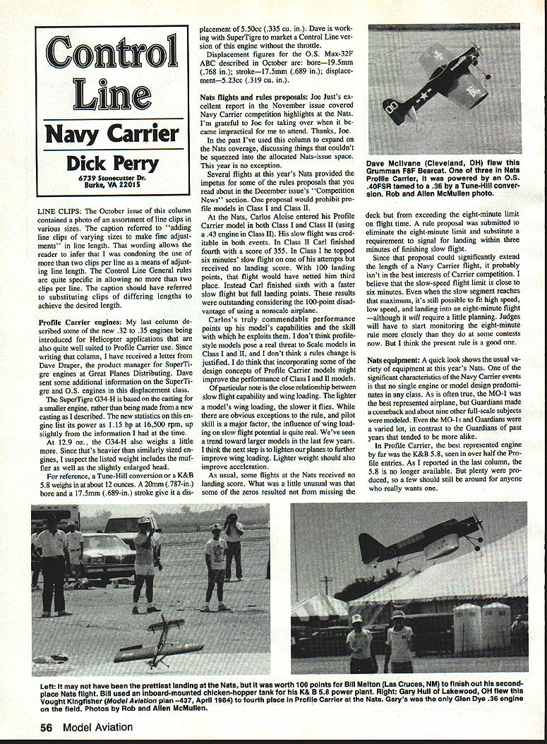 LINE CLIPS October issue column contained photo assortment line clips various sizes caption referred adding line clips varying sizes make fine adjust ments line length wording allows reader infer condoning use two clips per line means adjust ing line length Control Line General rules quite specific allowing no two clips per line caption should have referred substituting clips differing lengths achieve desired length Profile Carrier engines last column de scribed some new 32 35 engines being introduced Helicopter applications also quite well suited Profile Carrier use Since writing column have received letter Dave Draper product manager SuperTi gre engines Great Planes Distributing Dave sent some additional information SuperTi gre OS engines displacement class SuperTigre G34-H based casting smaller engine rather being made new casting described new statistics en gine list its power 115 hp 16500 rpm up slightly information time 129 oz G34-H also weighs little Since thats heavier similarly sized en gines suspect listed weight includes muf fler well slightly enlarged head reference Tune-Hill conversion K&B 58 weighs about 12 ounces 20mm 787-in bore 175mm 689-in stroke give dis placement 550cc 335 cu Dave work ing SuperTigre market Control Line ver sion engine throttle Displacement figures OS Max-32F ABC described October bore19Smm 768 stroke175mm 689 displace ment523cc 319 cu Nats flights rules proposals Joe Justs ex cellent report November issue covered Navy Carrier competition highlights Nats Im grateful Joe taking over came impractical attend Thanks Joe past Ive used column expand Nats coverage discussing things couldnt squeezed allocated Nats-issue space year no exception Several flights years Nats provided impetus some rules proposals read about December issues Competition News section proposal would prohibit pro file models Class Class II Nats Carlos Aloise entered Profile Carrier model both Class Class II using 43 engine Class II slow flight cred itable both events Class II Carl finished fourth score 355 Class topped six minutes slow flight attempts received no landing score 100 landing points flight would have netted him third place Instead Carl finished sixth faster slow flight full landing points results outstanding considering 100-point disad vantage using nonscale alrplane Carloss truly commendable performance points up models capabilities skill exploits dont think profilestyle models pose real threat Scale models Class II dont think rules change justified think incorporating some design concepts Profile Carrier models might improve performance Class land II models particular note close relationship between slow flight capability wing loading lighter models wing loading slower flies obvious exceptions rule pilot skill major factor influence wing load ing slow flight potential quite real Weve seen trend toward larger models last few years think next step lighten planes further improve wing loading Lighter weight should also improve acceleration As usual some flights Nats received no landing score What little unusual some zeros resulted missing deck exceeding eight-minute limit flight time rule proposal submitted eliminate eight-minute limit substitute requirement signal landing within three minutes finishing slow flight Since proposal could significantly extend length Navy Carrier flight probably isnt best interests Carrier competition believe slow-speed flight limit close six minutes slow segment reaches maximum its still possible fit high speed low speed landing eight-minute flight although will require little planning Judges will have start monitoring eight-minute rule closely some contests now think present rule good Nats equipment quick look shows usual va riety equipment years Nats significant characteristics Navy Carrier events no single engine model design predomi nates class As often true MO-l best represented airplane Guardians made comeback about nine other full-scale subjects modeled MO-ls Guardians varied lot contrast Guardians past years tended alike Profile Carrier best represented engine far K&B 58 seen over half Pro file entries As reported last column 58 no longer available plenty pro duced few should still around anyone really wants Left may have prettiest landing Nets worth 100 points Bill Meiton Las Cruces NM finish out secondplace Nets flight Bill used inboard-mounted chicken-hopper tank K& B 56 power plant Right Gary Hull Lakewood OH flew Vought Kingfisher Model Aviation plan 437 April1984 fourth place Prof ie Carrier Nate Garys Glen Dye 36 engine field Photos Rob Alien McMullen 56 Model Aviation Conoi Line Navy Carrier Dick Perry 6739 Stonecutter Dr Durke VA 22015 Dave Mcllvane Cleveland OH flew Grumman F8F Bearcat three Nets Profile Carrier powered 09 4OFSR tamed 36 Tune-Hill conver sion Rob Allen McMullen photo Impact EngineeringEEJI 2100 Stonehill Court Arlington Texas 76012 817 261-8130 FAX 817 275-8825 PNEUMATIC BRAKES S 2-Stage Clamp User Setable Drag Low Proffle NEW UNI-FRAME CONSTRUCTION CLAMP BLOCK STRUT MOUNTING UP & DOWN Y-BLOCK LOCK SPRING DOWN AIR DRIVEN BOTH DIRECTIONS BRASS BEARINGS NO PLASTICS OR CASTINGS LOW PROFILE BACKLASH ADJUSTMENT CONTACT YOUR LOCAL DEALER OR WRITE IMPACT FOR MORE INFORMAnON RT9O UF FULL SCALE OdLJ 4 zz7 RETRACT SYSTEMS C LJJ Its interesting present high speeds well below levels 15 years ago Though larger size todays models has increased drag other drag factors have remained constant still using same props avail able decade ago Speed events other hand have elim inated advantage tuned pipe D Speed yet still recorded gains introduction Schnuerle engines Maybe theres potential creasing Carrier high-speed performance well factor has remained fairly constant responding advertisers mention read about Model Aviation Class II competition prop Speed en gines fit Class II Carrier engine limit 65-cu-in displacement timed high en gine speeds may little out place traditional Rev-Up 10-8W propeller newer 61-cu-in Schnuerle engines d