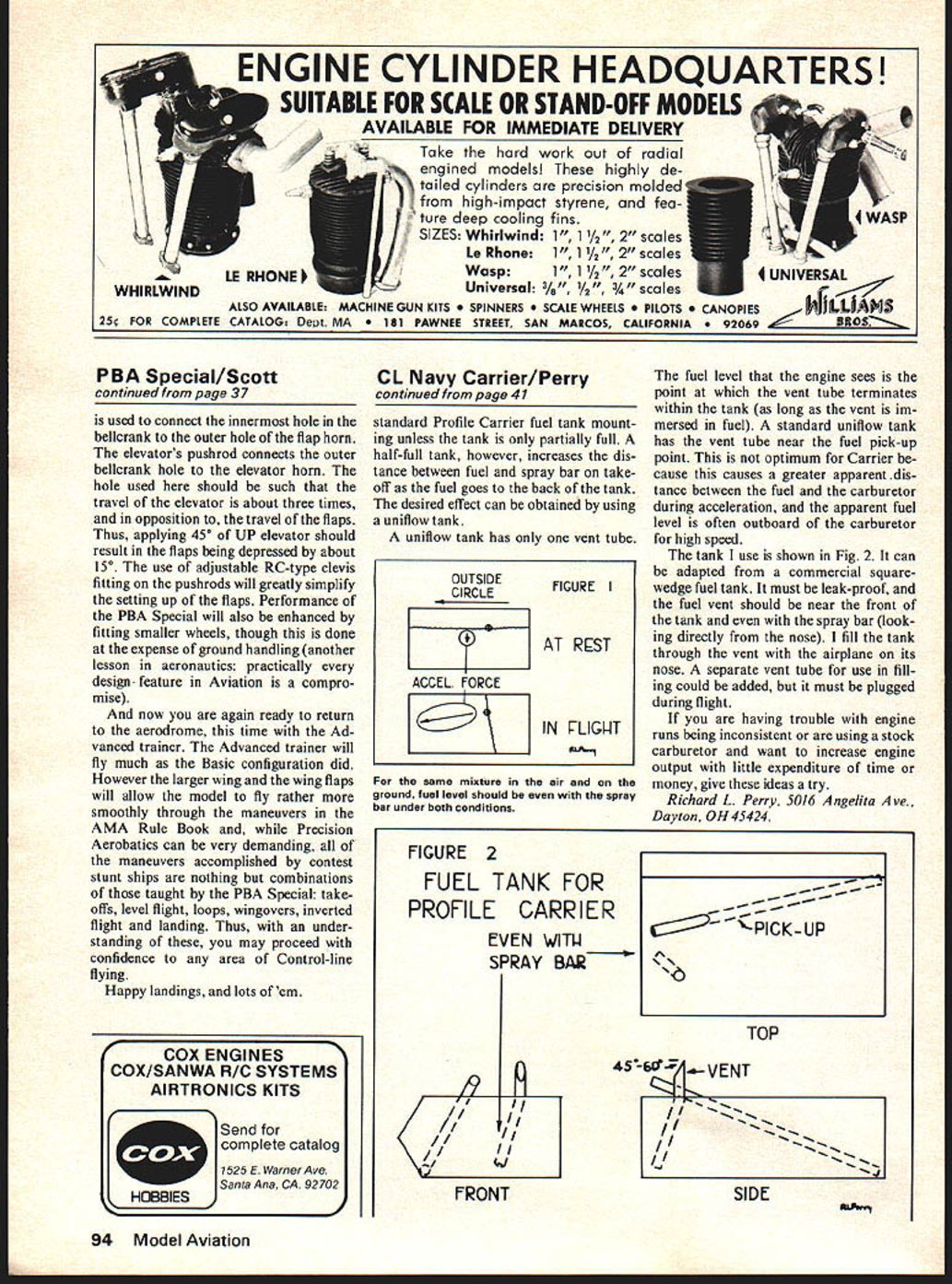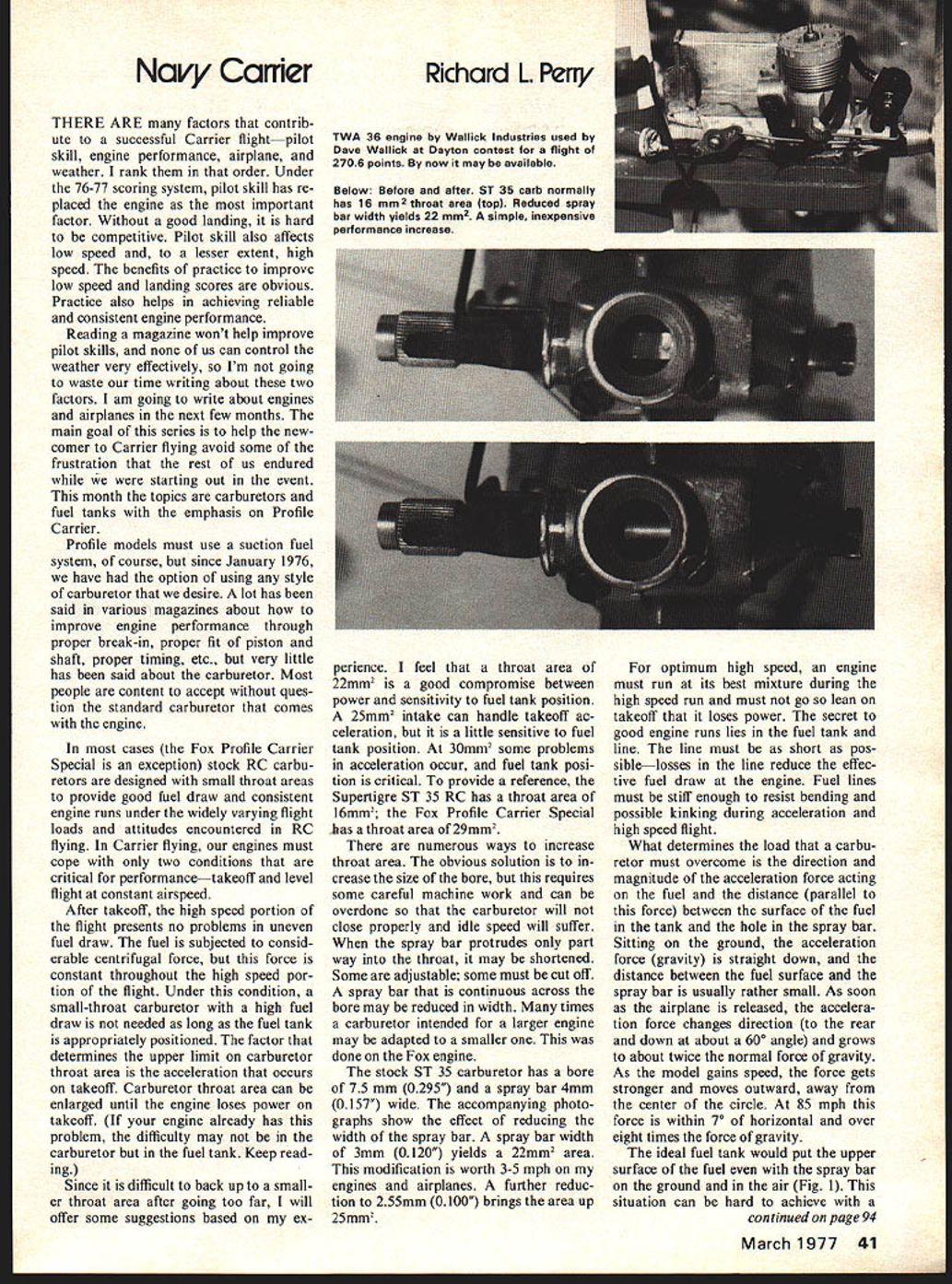 Navy Carrier THERE ARE factors contrib ute successful Carrier flightpilot skill engine performance airplane weather rank order Under 76-77 scoring system pilot skill has re placed engine important factor Without good landing hard competitive Pilot skill also affects low speed lesser extent high speed benefits practice improve low speed landing scores obvious Practice also helps achieving reliable consistent engine performance Reading magazine wont help improve pilot skills us can control weather very effectively Im going waste time writing about two factors am going write about engines airplanes next few months main goal series help new comer Carrier flying avoid some frustration rest us endured starting out event month topics carburetors fuel tanks emphasis Profile Carrier Profile models must use suction fuel system course since January 1976 have option using style carburetor desire lot has said various magazines about improve engine performance through proper break-in proper fit piston shaft proper timing etc very little has said about carburetor Most people content accept ques tion standard carburetor comes engine cases Fox Profile Carrier Special exception stock RC carbu retors designed small throat areas provide good fuel draw consistent engine runs under widely varying flight loads attitudes encountered RC flying Carrier flying engines must cope two conditions critical performancetakeoff level flight constant airspeed After takeoff high speed portion flight presents no problems uneven fuel draw fuel subjected consid erable centrifugal force force constant throughout high speed por tion flight Under condition small-throat carburetor high fuel draw needed long fuel tank appropriately positioned factor determines upper limit carburetor throat area acceleration occurs takeoff Carburetor throat area can enlarged until engine loses power takeoff engine already has problem difficulty may carburetor fuel tank Keep read ing Since difficult back up small er throat area after going too far will offer some suggestions based ex Richard 1 Peny TWA 36 engine Wallick Industries used Dave Wallick Dayton contest flight 2706 points now may available Below Before after ST 35 carb normally has 16 mm2 throat area top Reduced spray bar width yields 22 mm2 simple inexpensive performance increase perience feel throat area 22mm2 good compromise between power sensitivity fuel tank position 25mm2 intake can handle takeoff ac celeration little sensitive fuel tank position 30mm2 some problems acceleration occur fuel tank posi tion critical provide reference Supertigre ST 35 RC has throat area 16mm2 Fox Profile Carrier Special has throat area 29mm2 numerous ways increase throat area obvious solution crease size bore requires some careful machine work can overdone carburetor will close properly idle speed will suffer spray bar protrudes part way throat may shortened Some adjustable some must cut off spray bar continuous across bore may reduced width times carburetor intended larger engine may adapted smaller done Fox engine stock ST 35 carburetor has bore 75 mm 0295 spray bar 4mm 0157 wide accompanying photo graphs show effect reducing width spray bar spray bar width 3mm 0120 yields 22mm2 area modification worth 3-5 mph engines airplanes further reduc tion 255mm 0100 brings area up 25mm2 optimum high speed engine must run its best mixture during high speed run must go lean takeoff loses power secret good engine runs lies fuel tank line line must short pos siblelosses line reduce effec tive fuel draw engine Fuel lines must stiff enough resist bending possible kinking during acceleration high speed flight What determines load carbu retor must overcome direction magnitude acceleration force acting fuel distance parallel force between surface fuel tank hole spray bar Sitting ground acceleration force gravity straight down distance between fuel surface spray bar usually rather small As soon airplane released accelera tion force changes direction rear down about 600 angle grows about twice normal force gravity As model gains speed force gets stronger moves outward away center circle 85 mph force within 70 horizontal over eight times force gravity ideal fuel tank would put upper surface fuel spray bar ground air Fig 1 situation can hard achieve continued page 94 March 1977 41 ENGINE CYLINDER HEADQUARTERS SUITABLE FOR SCALE OR STAND-OFF MODELS AVAILABLE FOR IMMEDIATE DELIVERY Take hard work out radial engined models highly de f tailed cylinders precision molded high-impact styrene fea ture deep cooling fins SIZES Whirlwind 1 1 1/2PP 2 scales Le Rhone 1 1 1/2/P 2 scales Wasp 1 1 1/2P 2 scales LE RHONE Universal ales ALSO AVAILABLE MACHINE GUN KITS NERS E WHEELS TS 0 CANOPIES 181 PAWNEE STREET SAN MARCOS CALIFORNIA 9 PBA Special/Scott continued page 37 used connect innermost hole bellcrank outer hole flap horn elevators pushrod connects outer bellcrank hole elevator horn hole used should such travel elevator about three times opposition travel flaps Thus applying 450 UP elevator should result flaps being depressed about 150 use adjustable RC-type clevis fitting pushrods will greatly simplify setting up flaps Performance PBA Special will also enhanced fitting smaller wheels though done expense ground handling another lesson aeronautics practically design feature Aviation compro mise now again ready return aerodrome time Ad vanced trainer Advanced trainer will fly much Basic configuration did However larger wing wing flaps will allow model fly rather smoothly through maneuvers AMA Rule Book Precision Aerobatics can very demanding maneuvers accomplished contest stunt ships nothing combinations taught PBA Special take offs level flight loops wingovers inverted flight landing Thus under standing may proceed confidence area Control-line flying Happy landings lots ofem CL Navy Carrier/Perry continued page 47 standard Profile Carrier fuel tank mount ing unless tank partially full half-full tank however increases dis tance between 