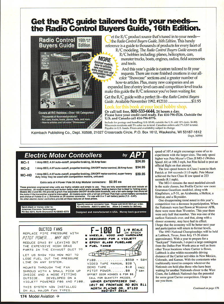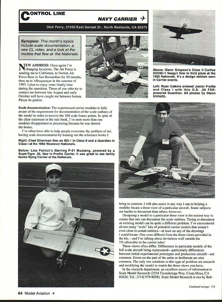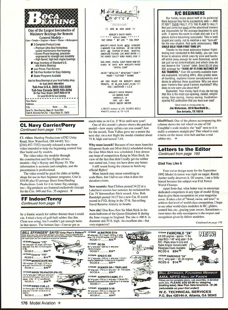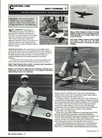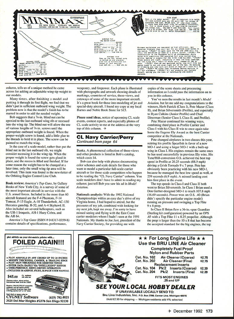 Scale documentation experienced carrier modeler fully aware requirement documentation scale outlines model order receive 100 scale bonus points spite clear statement rule book Ive seen modeler disappointed processing because denied bonus Ive often able help people overcome problem having scale documentation loaning out reference books Right Chad Dinerman flew MO-i Class II Guardian Class 1992 Westover Nationals bring contests will also assist way can helping modeler locate three-view particular aircraft Some subjects harder document others however Designing model particular three-view easiest way ensure can document scale outlines Trying document existing model can quite different problem Ive encountered too scale kits potential carrier models werent close actual outlinesat least drawings could locate differed three-views provided kitand Im talking about deviations well outside 5% allowable carrier rules Three-views often differ Differences particular models full-scale aircraft being representedparticularly differences between initial experimental prototypes production aircraftare common Errors part artist draftsman also common two solutions type problem research modifying model match three-views have research department excellent source information Scale Model Research 2334 Ticonderoga Way Costa Mesa CA 02626 Tel [714] 979-8058 Scale Model Research run Bob Continued page 173 64 Model Aviation N TROL LINE N EWADDRESS Once again Im changing locations Air Force sending California Norton Air Force Base San Bernardino 10 months Albuquerque summer 1993 plan enjoy some family time during transition try contact between late August early October will have caught between homes Please patient NAVY CARRIER e Glenn Simpsons Class II Curtiss XSO3C-1 Seagull flew third place 1992 Nationals Its design seldom seen Carrier events Left Ryan Calkins entered Junior Profile Class 0S 28 FSR powered Guardian photos Glenn Umholtz Below Lisa Patricks Sterling P-51 Mustang powered SuperTigre 35 flew Profile Carrier great see family teams flying Carrier Nationals A * A 1I1iNAA 799 1-90 AtlAS CLASS Airt9ifbi094 Wing Span9A Lengit429 91999 ready 99fin1999 Wing tiae 9OgL9eAii993A90eqit LigA $049999 $9999 SCee 50 AS 709 0990 099 p909r9iisetieeIiced 999 SiN IAfAX 1999A blAZE MiITAA-AVA PIOCt 9159 Airt9 AIUOS Ui9g Span.19 LecqAt 19 oeigtt rr tony.29 Wing Ar.1999 eq 9 Wing ioOding9A 99 e5 ft LiSt $129999110 59999 Nest Ate codel erket 190 99 resIstant 5716 99100 3 9195 stretch gets V99 195 29111 500 tot 9rnOs 99 raelettnt yO$AeetAYLpAcOrdiOlonoeteelst9ke V r99n995a99r9n steel ring torautoaticteconneo 911 951 1 99999 tr999d9 1V eaeyolsdUi hot orongs reel 9099091 tONI 9I0 000 9111 ie9nOt 90 59 0 Ag 9119r 190 hIgh List $8900. 500 *9A90 lOlA 90 3091 19 190 IA 99100 997LACDWOt $7290 909190 eeiiplaflee daegn9 Sigh 11999 fly 09909 cOld bird 99ri0 IPLUSV soat 91-s 709 at9 1000 9111 f1y 99911 hte batteries og 909 9na5190i5 19999 iPLUSV zocetruOtiOn etanderd 99119 lip profeeeicflai style 9e1509thSi90iiOityCtO deelOfled 991 eioercliedblue prints eAsOiflO sisAl f9ret hi. builder iPLJSP Theeecoeisore IOtA reOlting9nnaryioCcicbiood9flOe Yet AlAs onga con' begin brsaiAuntli loaded 185 sore 1tlUgpditeoossoyachited Wart. 1-090121 findour gorteraadrto picondol9eridhhott9fthebdo NosaoOicO triosilngocO theyoill oil stand 9fl eWOe sea coanvilloc o desk iPLUOP 0 offer lost telephone becOop eerciAe ow ccetoeere IPEPOP Oil products factory direct eonongiiou 999 oaretou5iflggfldtddle W Ww w wWW column tells us unique method came across adding adjustable wing-tip weight models times after finishing model putting through its first flight find didnt put sufficient outboard wing weight problem now models finish has marred order add needed weight Bob suggests 1A-in blind nut can epoxied last outboard wing rib recessed wing tip blind nut will allow use various lengths -in screws until appropriate outboard weight found proper-weight screw found add little glue threads hold place screw can painted match wing case scale model rather put blind nut last outboard rib might consider recessing wing tip proper weight found screw gets glued place recess filled finished some reason weight has changed later time small wing tip area will involved item found newsletter Orbiting Eagles Control Line Club Book review Americas Top Guns Gallery Books New York City survey some important aircraft service US armed forces Included 60 aircraft featured F-4 Phantom F- 14 Tomcat F-IS Eagle A-10 Thunderbolt AC-130 Hercules gunship B-52 A-4 Skyhawk II Also included several helicopters such UH- 1 Iroquois AH- 1 Huey Cobra theAH 64 Americas Top Guns ISBN #0-8317-0359-8 contains details specifications performance weaponry firepower plane illustrated photographs artwork showing details markings countries service three-views cutaways some important aircraft Its great book modeling jet special-duty aircraft found copy local Bames Noble Book Store $15 Please send ideas notice upcoming CL scale events contest reports especially photos CL scale activity address very top column avy Carrier/Perry Continued page 64 Banka phenomenal collection three-views other products listed Bobs cataiog costs $4 Bob can aiso help photos documenting color schemes scale details want model particular full-scale carrier aircraft scale competitors happen reading 11CL Navy Carrier column scale modelers dont have admit reading column just tell Bob saw ad Model Aviation Nationals analysis 1992 Nationai Championships within easy days drive Virginia home hoped attend pressures job combined looking next job kept away Im sorry have missed seeing flying East Coast carrier modelers hadnt seen 1991 Nationals thanks Joe Just president Navy Carrier Society providing copies score sheets processing information could pass information column Youve seen results last months Model Aviation let add congratulations winners Herb Patrick Class Pete Mazur Class II Brian Silversmith Profile especially Ryan Calkins Junior Profile Chad D