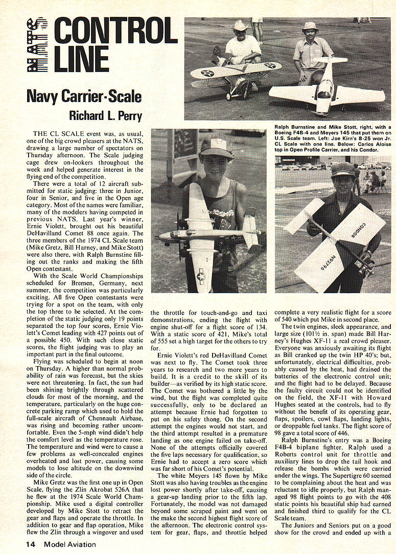 CONTROL LINE Navy Carrier Scale Richard L Perry THE CL SCALE event usual big crowd pleasers NATS drawing large number spectators Thursday afternoon Scale judging cage drew on-lookers throughout week helped generate interest flying end competition total 12 aircraft sub mitted static judging three Junior four Senior five Open age category Most names familiar modelers having competed previous NATS Last years winner Ernie Violett brought out beautiful DeHavilland Comet 88 once again three members 1974 CL Scale team Mike Gretz Bill Harney Mike Stott also Ralph Burnstine fill ing out ranks making fifth Open contestant Scale World Championships scheduled Bremen Germany next summer competition particularly exciting five Open contestants trying spot team top three selected com pletion static judging 19 points separated top four scores Ernie Vio letts Comet leading 427 points out possible 450 such close static scores flight judging play important part final outcome Flying scheduled begin noon Thursday higher normal prob ability rain forecast skies threatening fact sun shining brightly through scattered clouds morning temperature particularly huge con crete parking ramp used hold full-scale aircraft Chennault Airbase rising becoming rather uncom fortable 5-mph wind didnt help comfort level temperature rose temperature wind cause few problems well-concealed engines overheated lost power causing some models lose altitude downwind side circle Mike Gretz first up Open Scale flying Zlin Akrobat 526A flew 1974 Scale World Cham pionship Mike used digital controller developed Mike Stott retract gear flaps operate throttle addition gear flap operation Mike flew Zlin through wingover used throttle touch-and-go taxi demonstrations ending flight engine shut-off flight score 134 static score 421 Mikes total 555 set high target others try Ernie Violetts red DeHavilland Comet next fly Comet took three years research two years build credit skill its builderas verified its high static score Comet bothered little wind flight completed quite successfully declared attempt because Ernie forgotten put safety thong second attempt engines would start third attempt resulted premature landing engine failed take-off None attempts officially covered five laps necessary qualification Ernie accept zero score far short Comets potential white Meyers 145 flown Mike Stott also having troubles engine lost power shortly after take-off causing gear-up landing prior fifth lap Fortunately model damaged beyond some scraped paint went make second highest flight score afternoon electronic control sys tem gear flaps throttle helped complete very realistic flight score 540 put Mike second place twin engines sleek appearance large size 101 span made Bill Har neys Hughes XF-l 1 real crowd pleaser Everyone anxiously awaiting its flight Bill cranked up twin HP 40s unfortunately electrical difficulties prob ably caused heat drained batteries electronic control unit flight delayed Because faulty circuit could identified field XF-l1 Howard Hughes seated controls fly benefit its operating gear flaps spoilers cowl flaps landing lights droppable fuel tanks flight score 98 gave total score 446 Ralph Burnstines entry Boeing F4B-4 biplane fighter Ralph used Roberts control unit throttle auxiliary lines drop tail hook release bombs carried under wings Supertigre 60 seemed complaining about heat reluctant idle properly Ralph man aged 98 flight points go 408 static points beautiful ship earned finished third qualify CL Scale team Juniors Seniors put good show crowd ended up 14 Model Aviation Ralph Burnstine Mike Stott right Boeing F4B4 Meyers 145 put US Scale team Left Joe Kims B-25 won Jr CL Scale line Below Carlos Aloise top Open Profile Carrier Condor higher percentage completed flights Open flyers Senior Cathy Burnstine Ralphs daughter flew very well built Lloyd Liberty Sport first place OS Max 60-powered biplane took year build flew very well making writers opinion best touch-and-go afternoon Rich Dickinson flew Sterling kit ver sion Fokker Triplane second place Rich followed closely Bruce Mathews flying Volksplane won Junior Scale last year Ken Buck fourth P-40N built Top Flite kit Joe Kim surprised lot people Junior Scale came out fly B-25 bomber line put good flight putting Space Hopper powered model first place ten-point lead over Tom Fluker flew F8F Bearcat built Sig kit Louis Matustik finished third Thomas Morse Scout modified Guillows kit Forster 29 power Although entered competi tion Tom Dean attracted lot attention around contestant hangar scale model G-164 Grumman AgCat Still framework stage model has under construction 1 /2 years Jacobs engine beautiful piece work airframe structure matches factory drawings right down aileron bellcranks model will really something see finished number contestants large competition keen age categories Scale performances NATS summer left little doubt United States will well represented Bremen Germany next year Mike Gretz Mike Stott Ralph Burnstine Special congratulations go Mike Stott first person qualify Scale team three times wish best luck USS Smallfry steamed Lake Charles Sunday under threatening skies weathered day thunderstorms heavy seas Monday Fleet mete orologist predicted storms Tues day Wednesday rain did materialize seas calm condition aided rescue opera tions power failures unfavorable winds caused numerous planes end up drink pilots rescued safely aircraft damaged beyond repair atmosphere around Navy Car rier circles year quite relaxed easy-going number contestants down again probably due large distances separate Lake Charles centers Carrier activity scheduling such Profile Scale Carrier classes held separate days two factors combined good weather-moderate temperatures winds 5 7 mphallowed contestants fly whenever ready seldom two three minute wait open deck small number contestants did mean lack competition Less five points separated first second place Open Profile Class Class II final outcomes u