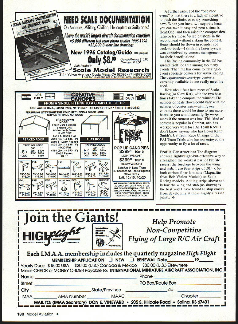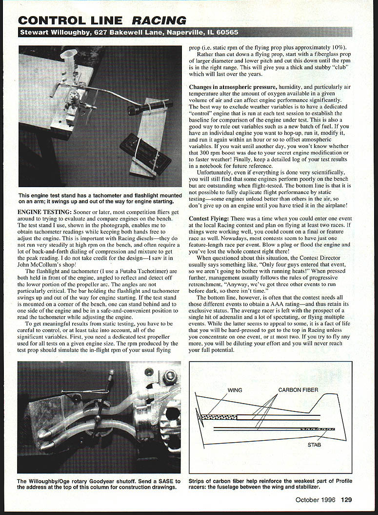CONTROL LINE RACING ENGINE TESTING Sooner later competition fliers get around trying evaluate compare engines bench test stand use shown photograph enables obtain tachometer readings keeping both hands free adjust engine important Racing dieselsthey run very steadily high rpm bench often require lot back-and-forth dialing compression mixture get peak reading take credit designI saw John McCollums shop flashlight tachometer use Futaba Tachotimer both held front engine angled reflect detect off lower portion propeller arc angles particularly critical bar holding flashlight tachometer swings up out way engine starting test stand mounted corner bench can stand behind side engine safe-and-convenient position read tachometer adjusting engine get meaningful results static testing have careful control least take account significant variables First need dedicated test propeller used tests given engine size rpm produced test prop should simulate in-flight rpm usual flying prop ie static rpm flying prop plus approximately 10% Rather cut down flying prop start fiberglass prop larger diameter lower pitch cut down until rpm right range will give thick stubby club will last over years Changes atmospheric pressure humidity particularly air temperature alter amount oxygen available given volume air can affect engine performance significantly best way exclude weather variables have dedicated control engine run test session establish baseline comparison engine under test also good way rule out variables such new batch fuel have individual engine want hop-up run modify run again within hour offset atmospheric variables wait until another day wont know whether 300 rpm boost due secret engine modification faster weather Finally keep detailed log test results notebook future reference Unfortunately everything done very scientifically will still find some engines perform poorly bench outstanding flight-tested bottom line possible fully duplicate flight performance static testingsome engines unload better others air dont give up engine until have tried airplane Contest Flying time could enter event local Racing contest plan flying least two races things working well could count final feature race well Nowadays contests seem have just feature-length race per event Blow plug flood engine youve lost whole contest right questioned about situation Contest Director usually says something like Only four guys entered event arent going bother running heats pressed further management usually follows rules progressive retrenchment Anyway weve got three other events run before dark isnt time bottom line however often contest needs different events obtain AAA ratingand thus retain its exclusive status average racer left prospect single hit adrenalin lot spectating flying multiple events latter seems appeal some fact life will hard-pressed get top Racing unless concentrate event two try fly will diluting effort will never reach full potential Strips carbon fiber help reinforce weakest part Profile racers fuselage between wing stabilizer October1996 129 engine test stand has tachometer flashlight mounted arm swings up out way engine starting WINGCARBON FIBER Willoughby/Oge rotary Goodyear shutoff Send SASE address top column construction drawings NEED SCALE DOCUMENTATION Antiques Military Civilian Helicopters Sailpianes wids kirgest aircraft documentation collection 5800 different Full color photo studies 1905-1996 33000 3-view line drawings New 1996 Catalog/Guide 188 pages Canada/Mexico $1000 Bob Only $8 Overseas $1500 Banka s Scale Model Research 3114 Yukon Avenue a Mesa CA 92626 79-8058 Look us net I. 1 4338 Austin Blvd Island Park NY 11558 516-431-4127 516-889-2682 FEATURING UTEWEJGHT EMT CONDUIT TUBING K LOCK ON FITTiNGS NO TOOL 0 FiNCLUDEfl I3/4II BxlO$85$130I lOslO$100$135I BREAKDOWN MODEL Fits Cars & Can Shipped UPS Add Amounts Below unit Price BxlO & lOslO Fiat $40 3/4 & $45 1 BxlO & lOslO Peaked 435 3/4 & $45 1 10x20 Fiat 664 3/4 & $73 1 10x20 Peaked 582 11 FVINCLUOE1 3/4 1 I dO $80 SIlO I lOslo $85 $115 3/4-6003/4-6O03/4 6 503/4-4 003/4 6003/4-650 3/4-750 1-800l4O0I 900I 5001 800 1-900 1-10O0 P4LP40P5FFOOT PAD F03FOLBUNGlE 6 40 3/4-6003/4-6503/4 7503/48503/4 6003/4-600845e l-9001-9001 10001 7501 800l-800ii WF MAFAJFACTTJRE & STOO SEvER AL OTHER SYSTEMS & HAVE FIJI LHE OF ACCESSORIES ALL WITH THE VFNOOR H MM CALL FAX OR MAE US TO PLACE YOUR ORDER OR TO RECErIE YOUR FREE CATALOG further aspect race event lack incentive push limits try something new have two separate heats can take easy post time Heat raise compression ratio try /3-lap pit stops second heat risking contest Heats should flown rounds back-to-back-I think latter system conceived contest management benefit alone Racing community US has spread itself too thin among too events time has come try singleevent specialty contests AMA Racing department-store-type contests currently available really meet need about four heat races Scale Racing Slow Rat two best times taken compute winner number heats flown could vary number contestantswith fewer entrants would time run heats would actually fly races turnout low kind contest popular Combat has worked very well FAI Team Race dont know anyone has flown Kean Smiths US Team Race Champs FAI Team Trials has enjoyed opportunity fly lot races Profile Construction diagram shows lightweight-but-effective way strengthen weakest part Profile racers fuselage between wing stab use four strips 014 X /2inch carbon-fiber laminate Magnalite Bob Violett Models Scale Racing models Adding strips above below wing stab shown best way have found stop cracks developing highly stressed joints Giants Help Promote IMsmUad INonCompetitiveI lHIGEw ng Large RIC Air Craft I I IMAA membership includes quarterly magazine High Flight I MEMBEHIPAPPLICAON r N L Dctte19I Yearly Dues$1500 USA $2000 US Canada & Mexico $j~3 US ElsewhereI Make CHECK MONEY ORDER Payable INTERNATIONAL MINIAlURE AIRCRAFT ASSOCIATION INC I Name ____________________________ Phon