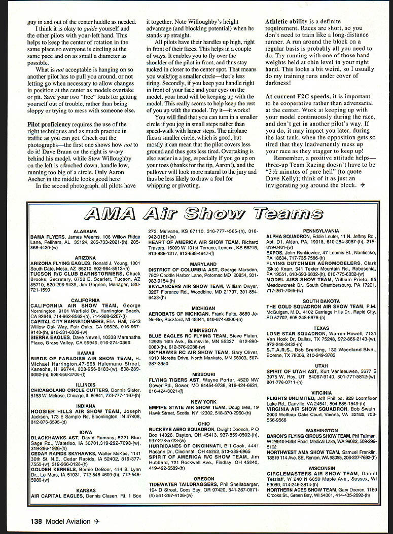 CONTROL LINE RACING US TEAM RACE CHAMPIONSHIPS sixth annual T/R Champs held mid-April Whittier Narrows Control Line site Southern California contest has format similar PAl F2C team trials six races flown over two-day weekend provides good early season workout Unfortunately turnout lowjust three teamsbut thats quorum Team Race contestants least happy teams used NazinlVorobiev engines kitplanes Willoughby/Oge Kusik/Braun employing latest side-exhaust engine variant model new unflown deal usual teething troubles such tightening shutoff spring engine comes restrictor exhaust prime line removed second day found immediate improvement restarting other significant modification stock engine turn down offset cooling fins head could see would make much difference cooling modifying kitsupplied cooling duct fit new head design would have lot work maybe Im just getting lazy Anyway performance good encouraged find engine preferred little pitch single-blade prop front-exhaust engines Ascher/Ascher flew very consistently over two days take first place 330 average three best races 329 331 330 Lenard Aaron clnim saving equally reliable 325 equipment team trials Fall Willoughby/Oge placed second 333 average 339 334 324 Kusik/Braun took third 342 343 344 339 F2C participants agreed good time got some useful practicethanks Kenn Smith organizer Ken Mogi jury Vintage B Team Race also flown both days event appealing because models look like full-scale racers can easily flown three-up because moderate speed around 90 mph Points awarded realism workmanship combined race times determine final score Jed Kusik took first place OS 25-powered Shadrach Kenn Smith placed second-flying similarly powered Sheik copy rules event reprints plans/articles suitable models contact Kenn Smith 521 Jansen Avenue San Dimas CA 91773 Tel [909] 592-2100 Piloting Technique Pilot proficiency three-up race very important aspect F2C Team Race Rule Keep up model Back 1980s getting behind Nelson usually led acute case terminal burndown big drop airspeed Catching back up airplane wasnt problemit slowed down speed What required pit stop compression adjustment resulted poor race time Fortunately scenario less common modern Eastern European engines usually just stay song held up leaves pilot choice running like crazy around other pilots catch up stepping back hauling model over top current speeds latter option often better choiceif can afford foul Best avoid getting situation first place requires three pilot attributes cooperation proficiency athletic ability Cooperation No going get good time pushing pulling blocking centerjust slow times exhausted pilots sooner pilots realize better because cooperation something under control can give may get back return Sure Jury keep everything clean gentlemanly cant relied swift retribution good callthe 1996 World Champs final example pilots best interest cooperative Pilots should work other allow faster pilot through unimpeded Trying block him probably wont work like used will leave out position running catch up after goes Let October 1997 137 Shadrach vintage B Team Racer has 08 25 power Jed Kusiks model placed first US Team Race Champs California L-R Stew Willoughby Aaron Ascher Dave Braun flying F2C US Team Race Champs Charlie Johnson photo Same guys previous photo show should done See text discussion piloting techniques guy out center huddle needed think okay guide yourself other pilots your-left hand helps keep center rotation same place everyone circling same pace small diameter possible What acceptable hanging another pilot has pull around letting go necessary allow changes position center models overtake pit Save two free fouls getting yourself out trouble rather being sloppy trying mess someone else Pilot proficiency requires use right techniques much practice traffic can get Check out photographsthe first shows Dave Braun right w-a-y behind model Stew Willoughby left crouched down handle low running too big circle Only Aaron Ascher middle looks good second photograph pilots have ALABAMA BAMA FLYERS James Weems 106 Willow Ridge Lane Peliham AL 35124 205-733-2021-h 205 868-4430-w ARIZONA ARIZONA FLYING EAGLES Ronald J Young 1301 South Date Mesa AZ 85210 602-9645513h TUCSON RIC CLUB BARNSTORMERS Chuck Brooks Secretary 6738 E Scarlett Tucson AZ 85710 520-2989439 Jim Gagnon Manager 520721-1590 CALIFORNIA CALIFORNIA AIR SHOW TEAM George Normington giCi Wartield Dr Huntington Beach CA g2646 714-962-8562-h 714-g686267-f CAPITAL CITY BARNSTORMERS Ellis HaIl 5543 Willow Oak Way Fair Oaks CA 95628 g16-9679140-h 916-331-6302-w SIERRA EAGLES Dave Newell 10538 Maranatha Place Grass Valley CA 95945 916-274-0866 HAWAII BIRDS OF PARADISE AIR SHOW TEAM H Michael Harrington47-668 Halemanu Street Kaneohe HI 96744 808-956-8183w 808-2396682-h 808-956-3706-f ILLINOIS CHICAGOLAND CIRCLE CUTTERS Dennis Sister 5153W Melrose Chicago IL 60641 773-777-1 167-h INDIANA HOOSIER HILLS AIR SHOW TEAM Joseph Jackson 173 E Sample Rd Bloomington IN 47408 81 2-876-6595-d IOWA BLACKHAWKS AST David Ramsey 5721 Blue Sage Rd Waterloo IA 50701319-292-7093-w 319-296-1 926-h CEDAR RAPIDS SKYHAWKS Walter McKee 1141 30th St NE Cedar Rapids IA 52402 319377 7550-w 319-366-01 26-h GOLDEN KERNELS Bernie DeBoer 414 5 Lynn Dr Le Mars IA 51031 712-5464609-h 712-5465980-w KANSAS AIR CAPITAL EAGLES Dennis Clasen Rt 1 Box together Note Willoughbys height advantage blocking potential stands up straight pilots have handles up high right front faces helps couple ways enables fly over shoulder pilot front thus stay tucked closer center spot means walk/jog smaller circlethats less tiring Secondly keep handle right front face eyes model head will keeping up model really seems help keep rest up model Try itit works will find can turn smaller circle jog small steps rather speed-walk larger steps airplane flies smaller circle good mosfly can mean pilot covers less ground thus gets less tired Overtaking also easier jog especially go up toes thanks tip Aaron pullov
