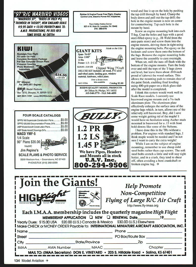 CONTROL LINE RACING THE FM Federation Aemnautique Intemationale F2C team trials 1998 World Championships Kiev Ukraine first weekend October 1997 Whittier Narrows site California Eight teams participated flew six races best three times combined detennine final placing team John Ballard/Dick Lambert flew consistently using Mazniak equipment won first place 319 324 325 John got good working-over 1996 World Champs Sweden knee has nearly recovered surgery look team place high Kiev Aaron Ascher Lenard Ascher close behind leaders Vorobiev front-exhaust models posting personal-best 322 backed up two 325s noticeable improvement previous years team better restarts during pitstops John McCollumIBill Lee took third team spot 321 two 327s team its share problems last year two lucky didnt destroy competitive model ex-Shabashovllvanov racer ran least three times during weekend rest field did pose significant threat leaders Tim Gillott did well place fourth unfamiliar pilot Tom Fluker day-and-a-half practice after four-year layoff Tims Nelsons capable keeping up best Russian gear setting comfortable teams best time 328 Bob Oge could find steady race setting three models brought trials 336 best could fuel problem may have partially blame California ingredients mixed usual formula required much compression run steadily countered adding DII Diesel Ignition Improver now wish tried little oil way eliminate variable ship own fuel will make priority next time other mistake made winning Nationals Nats team trials yearjust ask Jed Kusik John MeCollum Lenard Threaded steel inserts Ascher studs originated Lenard Ascher provide flat stable method fastening engines wood mounts Details text Ascher previous recipients curse team Dave Braun Jed Kusik 1994 team members experienced various problems finished three races 336 its fastest time Kenny Perkins Lester Goldsmith flying first team trials lacked pilot proficiency Day Kenny beginning look like pro end Day Two quickest time 347 Lam DziaklDave McDonald started fair 339 race fortunes progressively declined throughout rest contest race Lan got strung out lap 97 another pilot got way behind model situation worsened DziaklMcDonalds new Mazniak model got wiped out lap 992/3 engine backplate major portion crossed finish line Kenn Smith crew timekeepers linecheckers did competent job running contest jury Tom Knoppi Vic Gamer Jim Dunkin Doc Jackson FM made fair decisions Thanks guys Aseher Studs Several years ago Lenard Ascher originated method mounting engines wooden Team Race TR crutches using threaded T-lugs have used system several models works very well Dale Long Riverside CA has reported using method successfully profile models up 40 size see photo method beats bolting engine straight wood lathe needed turn thread T lugs locknuts mild steel round stock see diagram 3-48 engine bolts suggest using 8-32 external thread T-lug 4-40 bolts 10-32 would suitable Hardware store bolts could used reduce amount work involved prefer start scratch steel predictable properties Leave extra material top lug milled off later Similarly locknut made thicker provided screwdriver slot left long enough grabbed pliers Clamp assembled profile body table mill drill press start tapdrilling engine mounts appropriate locations Switch one-inch end mill counterbore hole 040-inch before moving next hole Flip body over counterbore holes locknuts trick accomplishing step Clamp flat piece scrap wood table drill hole tap drill Place engine mount counterbored over scrap 132 Model Aviation 4250 T-LUG 04012 WOOD MOTOR MOUNT 050 3-48r8S32 LOCK-NUT10-32 Lenard Ascher releases Vorobiev-powered Team Racer F2C team Nose Dale Longs HB 40-powered Cosmic Wind racer showing trials Ascher/Ascher won second team spot Dale Long photo threaded inserts used engine mounting Long photo wood line up hole pushing tap drill through hand Clamp body down pull out tap drill hole engine mount now center counterboring Tap hole mount hand ___________________________________Screw engine mounting bolt __________________________________ T-lug Coat holes lugs good steel-filled epoxy eg JB Weld auto parts store screw engine mounts driving tight using engine mounting bolts Put epoxy locknuts screw onto bottom lugs Remove engine mounting bolts leave assembly cure overnight set mill nuts off flush bottom engine mounts Turn body over mill tops T-lugs down level leave about 010-inch proud above wood surface allows mounting pads remain clear paint finish enabling final leveling using 400-grit paper thick glass slab after model completed think system would work well Scale Race models currently use basswood engine mounts 3A6-inch aluminum plate aluminum plate _______________________________________ effectively enlarges surface area engine lugs turn allows use relatively soft basswood Boy did save some weight getting rid maple would have no hesitation using Ascher studs mounted basswood 15 front hold-downs like some Nelsons have done TRs problem engines standard lugs think maple would needed Im sure want carry extra weight am subject engine mounting remember use cheap mild steel bolts rather cap screws soft steel bolts stretch little will stay tight better crash tend shear off often avoiding bent crankshaft broken engine lug oin GiantsHelp PromoteI smeed ~&fIzNon-Competitive .," ing Large RIC Air Cra ft //wwwfly-imaaorgI IMAA membership includes quarterly magazine High Flight MEMBERSHIP APPLICAllON NEW RENEWAL Date19I Yearly Dues $1500 USA $2000 US Canada & Mexico $3000 US Elsewhere I Make CHECK MONEY ORDER Payable INTERNAIlONAL MINIATURE AIRCRAFT ASSOCIATION INC I Name _________________ Phone ___________ Street _____________________________________ P0 Box/Route Box ________________ I________________________ 1CityState/Province ________________Zip IMAA _______ AMA Number_______ MAAC _______Chapter L MAIL TO IMAA Secretary DON E VINEYARD S HilIclale Road na KS 67401 134 Model Aviation [ WARUIRDS 97 BIRDS #2 THUNDER IN TIIES*T NEW ENGLAND SCALE $199