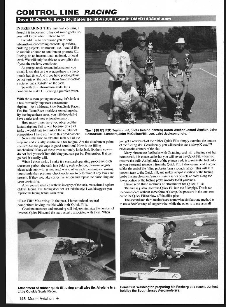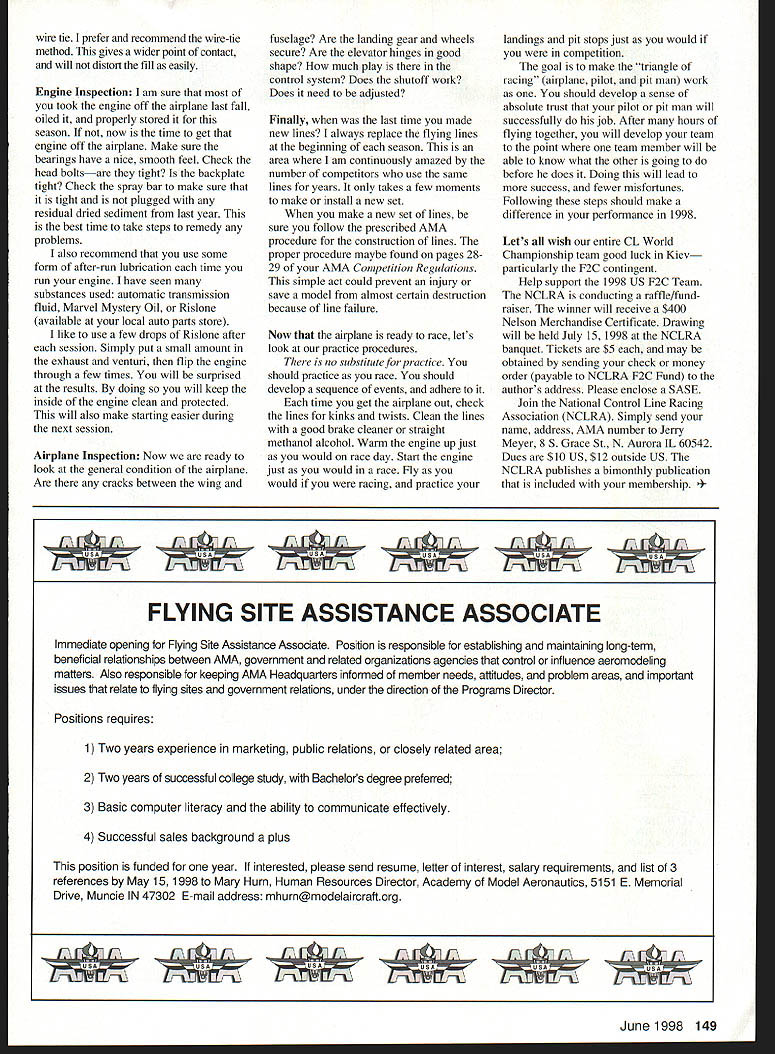 CONTROL LINE RACING JTTU IN PREPARING THIS first column thought important lay out some goals will know what intend would like encourage send information concerning contests questions building projects comments etc would like use column continue promote CL Racing international national local level will able accomplish readers contribute As get ready send information should know average threemonth lead time have photos please write back Simply enclose note put PostitTM back So information aside lets continue make CL Racing premier event season getting underway lets look few extremely important areas airplanebe Mouse Slow Rat Scale Racer Fast Rat Team Race model something else looking areas will hopefully have safer enjoyable season times have observed fastest airplane fail win because bad tank would hate think number competitors have seen predicament Now time take tank out airplane visually scrutinize fatigue Are attachment points secure Are pickups good condition filling mechanism remotely looks bad fix now fool yourself thinking can get Remember can go bad usually will clean tanks make standard operating procedure season parboil tank baking soda solution thoroughly clean tank methanol wash After cleaning rinsing should pressure-check tank determine leaks present take corrective action repeat parboiling pressure-testing After satisfied integrity tank reattach replace old fuel tubing Fuel tubing does last indefinitely would suggest replace tubing before event Fast Fill Mounting past have noticed several competitors having trouble Quick Fills Good maintenance mounting will help minimize number inverted Quick Fills tears usually associated get new batch rubber Quick Fills simply examine bottom fueling slot Occasionally will need use sharp XactoTM blade corners slot pitmen use fuel bulbs /6 tubing fueling slot too small conceivable will invert Quick Fill remove bulb slight trick pitman trade rotate fuel bulb insert remove Quick Fill also recommend solder end filling probe form round surface will help prevent tears Quick Fill makes rapid insertion fueling probe much easier Simply make series slots holes along lower portion fueling probe order fill tank have seen three methods attachment Quick Fills first just insert Quick Fill filler pipe recommended some form clamp pressure tank can cause Quick Fill blow off filler pipe second third methods somewhat similar method use double wrap copper wire other use small 148 Model Aviation US F2C Team L-R pilots behind pitmen Aaron Ascher/Lenard Ascher John Ballard/Dick Lambert John McCollum/Bill Lee Laird Jackson photo Attachment rubber quick-fill using small wire tie Airplane Little Quickie Scale Racer Demetrius Washington preparing Foxberg recent contest held South Jersey Aeromodelers wire tie prefer recommend wire-tie method gives wider point contact will distort fill easily Engine Inspection am sure took engine off airplane last fall oiled properly stored season now time get engine off airplane Make sure bearings have nice smooth feel Check head boltsare tight backplate tight Check spray bar make sure tight plugged residual dried sediment last year best time take steps remedy problems also recommend use some form after-run lubrication time run engine have seen substances used automatic transmission fluid Marvel Mystery Oil Rislone available local auto parts store like use few drops Rislone after session Simply put small amount exhaust venturi flip engine through few times will surprised results doing will keep inside engine clean protected will also make starting easier during next session Airplane Inspection Now ready look general condition airplane Are cracks between wing fuselage Are landing gear wheels secure Are elevator hinges good shape much play control system Does shutoff work Does need adjusted Finally last time made new lines always replace flying lines beginning season area am continuously amazed number competitors use same lines years takes few moments make install new set make new set lines sure follow prescribed AMA procedure construction lines proper procedure maybe found pages 2829 AMA Competition Regulations simple act could prevent injury save model almost certain destruction because line failure Now airplane ready race lets look practice procedures no substitute practice should practice race should develop sequence events adhere time get airplane out check lines kinks twists Clean lines good brake cleaner straight methanol alcohol Warm engine up just would race day Start engine just would race Fly would racing practice landings pit stops just would competition goal make triangle racing airplane pilot pit man work should develop sense absolute trust pilot pit man will successfully job After hours flying together will develop team point team member will able know what other going before does Doing will lead success fewer misfortunes Following steps should make difference performance 1998 Lets wish entire CL World Championship team good luck Kiev particularly F2C contingent Help support 1998 US F2C Team NCLRA conducting raffle/fundraiser winner will receive $400 Nelson Merchandise Certificate Drawing will held July 15 1998 NCLRA banquet Tickets $5 may obtained sending check money order payable NCLRA F2C Fund authors address Please enclose SASE Join National Control Line Racing Association NCLRA Simply send name address AMA number Jerry Meyer 8 5 Grace St N Aurora IL 60542 Dues $10 US $12 outside US NCLRA publishes bimonthly publication included membership 1998 149 USA FLYING SITE ASSISTANCE ASSOCIATE Immediate opening Flying Site Assistance Associate Position responsible establishing maintaining long-term beneficial relationships between AMA government related organizations agencies control influence aeromodeling matters Also responsible keeping AMA Headquarters informed member needs attitudes problem areas important issues relate flying sites government relations under direction Programs Director Positions requires 1 Two years experi