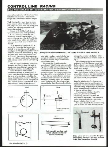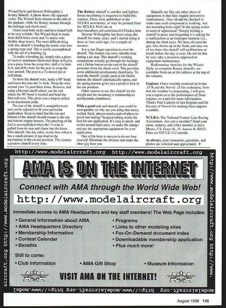 CONTROL LINE RACING Em ETT7U r Are having trouble Scale Race tanks Are need better shutoff design months column Tank Venting times have heard someone refer front feed tank setup refers fuel pickup point tank Racing tanks have become standard Lets talk about typical Scale Race tank its plumbing 2/2-3 ounce cylindrical tank has become standard Starting 21/2 ounce cylindrical tank trim fast-fill pipe length rubber fast-fill tank came assembled unsolder front tank Cut angle front tank seen Fig 3 using filler pipe guide go past will need reconfigure filling location would simpler build tank scratch using guide will able reinstall front cap would like acute angle will have trouble getting end cap fit may need fabricate new end cap well After angle established reinstall front plate solder place angle placed front tank effort help air roll off front tank Locate vertical horizontal centerlines tank pictured Fig 1 Locate pickup line pressure line located keep mind pickup should centerline satisfied location use punch make hole front cap tank Use punch instead drill because get Fig #1 Pressure Front Pck-up better jointyou have created lip tubing soldered instead just thickness material would have drilled holes pickup line should extended approximately /2 inch tank noted Fig 2 fail extend pickup enough may encounter difficulties takeoff can simply slight sag power complete flameout extension assures pickup will covered fuel times Now tank plumbed ready install extreme care should taken angle mounting Again front-feed system fuel actually moves forward outboard during flight accomplish Fte #2 Side View Note ck up continues Approx 1/2 Fig #4 Fusedage top 1ew IIjIIIIIIIuI Tank mounted fuse Note front exlends oulboarti rear allowing front pickup tank must mounted back tank inboard front tank seen Fig 4 Fuel will move farthest-outboard position during flight Since pickup front want fuel Note Fig 4 tank actually sitting pocket fuselage check efficiency system always check total number laps get tank volume fuel remains system information can invaluable need stretch pit window Shutoffs faulty shutoff will cause problems just much other piece equipment have received letters comments during past couple years people wanting know build shutoffs purchase Whether youre building shutoff buying remember reliability functionality size versus location adaptability needs have seen styles some good others seemed doomed failure start Two types shutoffs have seen years service wins Larry Dziaks 144 Model Aviation ry shutoff Stew Willoughbys Little Quickie Scale Racer Gillott Rossi Mk Ill Fig #3 Top 0 Side view two shutoff designs Willoughby Rotary left Dziak Wizard shutoff right Wizard Style Stewart Willoughbys Rotary Shutoff photo shows opposed styles Wizard Style mounts side airplane Rotary mounts through fuselage cheek cowl have used both styles have found both very reliable Wizard Style made K&S brass stock /i6 music wire hobby shop items difficult thing shutoff bending music wire spring-type end easily accomplished aid bending jig make bending jig simply take piece steel aluminum tool shops will give piece scrap bin drill /16 hole drill hole post wrap wire around post /I6 dowel pin drill blank form shutoff wire make 900 bend insert A6 hole Wrap wire around /I6 post three times Remove using Dremel cutoff wheel cut end 900 bend located bend first coil over gives loop utilize attachment point rest shutoff straightforward can adjusted fit particular application Keep mind top bottom shutoff should mount top bottom engine bearers pinching fuel accomplished pulled its step slams brass shutoff like other works best has small amount pre-load mechanism closed position assures positive shutoff time Rotary shutoff smaller lighter Some machining required build version Plans published NCLRA newsletter may printed NCLRA Web site http/membersaolcom/dmcd 1 43/indexhtm Stewart Willoughby has using shutoff years started using three four years ago couple reasons one-finger operation reset shutoff feature can save valuable time during pit stop shutoff s working components actually go through fuselage Delrin button end shutoff protrudes cheek cowl provides some additional aerodynamic cleanliness reset shutoff simply push Delrin button shutoff automatically opens spring tension gives positive lock run position Other reasons use shutoff weight mounting relationship aerodynamic cleanliness good tank shutoff could unstoppable using heavy walled thick almost-need-a-pair-of-pliers-topinch fuel tubing Surgical tubing works best application Its easy pinch works around tight areas make change use appropriate equipment application keys success beat yourself Eliminate obvious make other guy beat Shutoffs like other piece equipment require preventive maintenance should checked make sure component working Are mounting bolts tight spring action need adjustment Simply bolting shutoff place forgetting asking malfunction improper moment ie during final race have seen guy shows up field nine out ten times shutoff will malfunction break before day over let take proactive approach equipment maintenance Rudimentary sketches Wizard Style complete Rotary shutoffs available address top column Engines have recently received Irvine 15 Rand Norvel 15 evaluation Now weather cooperating will give report peiformance engines watch information Thanks Paul Landels Just Engines Ed Stevens Norvel making engines available NCLRA National Control Line Racing Association Are member Send name address AMA number Jerry Meyer 8 5 Grace St N Aurora IL 60542 Dues $10 US $12 outside As always comments questions photos solicited appreciated //wwwmodelaircraft August1998 145