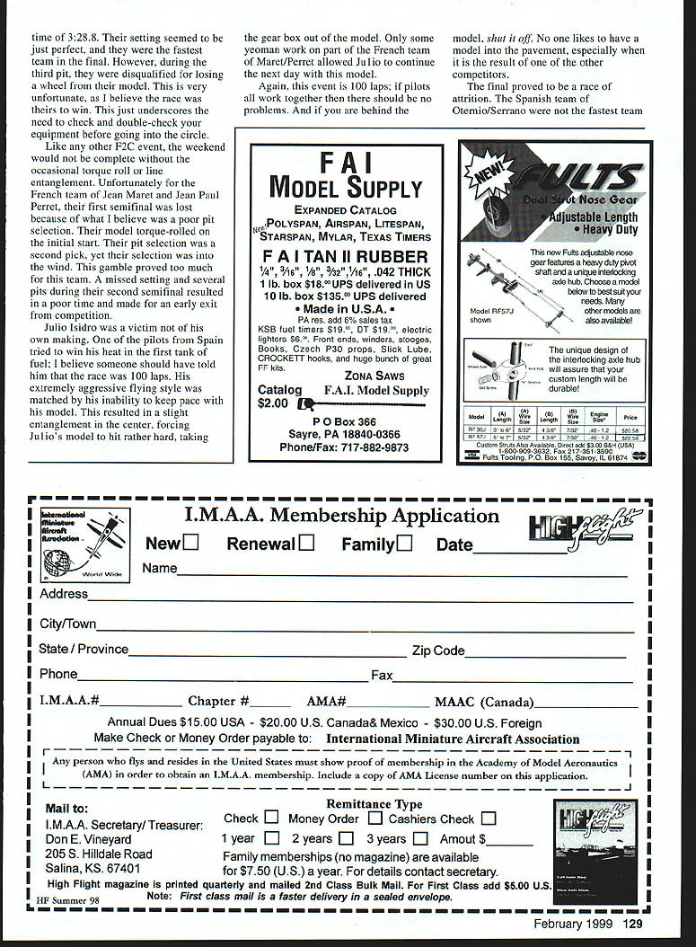 CONTROL LINE RACING ip7tU nil [4J ii r ii 1U Jh L THIS MONTHS column has somewhat international flair fortunate attend 1998 Open International De Cascais Worldcup held Cascais Portugal October 4-6 honor guest Mr Julio Isidro arranged true first-class trip Julio should very proud event truly did great job organization hosted banquet 128 guests featuring extremely fine service food band entertainment also hosted dinner Casino Estoril again true first-class evening good food great show Cascais Worldcup event featured Control Line F2 classes plus some additional Racing events such Vintage B Team Racing along F2C National event featuring profile F2C models using older steel piston/sleeve engines British Goodyear Mini-Goodyear Phantom racing demonstration US Mouse Racing also held Worldcup held conjunction airshow exposition featured 50 full-scale aircraft flight demonstrations Swedish Airforce organizers estimated 20000-25000 people passed through gate during three days event Adding flavor event corporate sponsorship modeling activities Continental Airlines Petrogual oil company Casino Estoril Tranquilidade insurance company Banco Espirito Santo large banking institution Approximately 100 contestants registered official events large contingents United Kingdom France Netherlands Spain Ukraine Russia Portugal As F2C equipment varied among Mazniak Vorobiev Titov some homebuilt few other various manufacturers Leading way practice teams UK France Portugal times 175 177 range vast majority teams running 181 185 category Portuguese team Antonio Mortinho Jose Goulao impressed running side-exhaust Vorobiev equipment good range seems have figured out marginal range issue sometimes associated some Vorobiev equipment practice times did indicate fastest airspeed performance team unmatched Antonio brings airplane pits fast faster anyone have seen Jose provides extremely efficient pitting serviceno wasted motion during pit one-flip service weekend enabled race setting 182 183 post heat times 325 range Unfortunately poor setting first semifinal disqualification second prevented Final race Other good teams Loet Wakkerman Javann De Weerd Netherlands probably fastest teams speed 175 range However appeared pilot just little behind speed especially threeup able make through semifinal time 3239 however retired after 86 laps final ended up being good enough claim second place Spanish team Oterino/Serrano also fast times 177 range resulting heat time 3258 semi final time 329 just good enough claim third transfer spot final race Some questionable flying practices made pilot extremely difficult fly team Richard Miles Gordon Yeldham Great Britain also very fast using Mazniak equipment turning times 177 range able claim second transfer spot finals posting semifinal 128 Model Aviation Goulio Portugal gets stubborn Vorobiev model warmed up pits Ant6nio Janeiro helmet assists center about get crowded British French Jose Goulio launches model during F2C heat raceSpanish prepare action Worldcup contest time 3288 setting seemed just perfect fastest team final However during third pit disqualified losing wheel model very unfortunate believe race win just underscores need check double-check equipment before going circle Like other F2C event weekend would complete occasional torque roll line entanglement Unfortunately French team Jean Maret Jean Paul Perret first semifinal lost because what believe poor pit selection model torque-rolled initial start pit selection second pick yet selection wind gamble proved too much team missed setting several pits during second semifinal resulted poor time made early exit competition Julio Isidro victim own making pilots Spain tried win heat first tank fuel believe someone should have told him race 100 laps extremely aggressive flying style matched inability keep pace model resulted slight entanglement center forcing Julios model hit rather hard taking gear box out model Only some yeoman work part French team Maret/Perret allowed Julio continue next day model Again event 100 laps pilots work together should no problems behind model shut off No likes have model pavement especially result other competitors final proved race attrition Spanish team Oternio/Serrano fastest team U --i IMAA Membership Application j4JI wEll RenewalL] FamilyL] Date_________ II Name I AddressI II City/Town i State/Province__________________________________ Zip Code____________________ I Phone__________________________________________ Fax__________________________________ I IMAA#__________ Chapter #_____ AMA#__________ MAAC Canada I I I I I I HF Summer 98 February 1999 129 I I I I I I I I Annual Dues $1500 USA $2000 US Canada& Mexico $3000 US Foreign Make Check Money Order payable International Miniature Aircraft Association r v32][b169257202321970]]1 Any person flys resides United States must show proof membership Academy Model Aeronautics I AM4 order obtain IMAA membership Include copy AMA License number application L v32][b170268402522930]] Mail ttance Type IMAA Secretary/TreasurerCheck Eli Money Order LI Cashiers Check LI Don E Vineyard1 year LI 2 years LI 3 years LI Amout $ 205 5 HilIdale Road Salina KS 67401 Family memberships no magazine available $750 US year details contact secretary High Flight magazine printed quarterly mailed 2nd class Bulk Mail First class add $500 US Note First class mall faster delivery sealed envelope FAI MODEL Su~i EXPANDED CATALOG OdiPOLYSPAN AIRSPAN LITESPAN STARSPAN MYLAR TEXAS TIMERS FAITAN II RUBBER 1/all 3/3211/1611 042 THICK 1 lb box $18n UPS delivered US 10 lb box $135re UPS delivered Made USA. PA res add 6% sales tax KSB fuel timers 1900 electric lighters $600 Front ends winders stooges Books Czech P30 props Slick Lube CROCKETT hooks huge bunch great FE kits ZONA SAWS Catalog FAI Model Supply $200 Ij P 0 Box 366 Sayre PA 18840-0366 Phone/Fax 717-882-9873 new Fults adjustable nose gear features heavy duty pivot shaft unue intertocldng nde hub Choose modd below best suit needs Mod