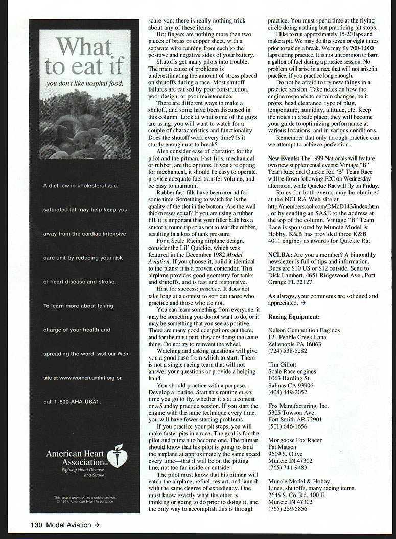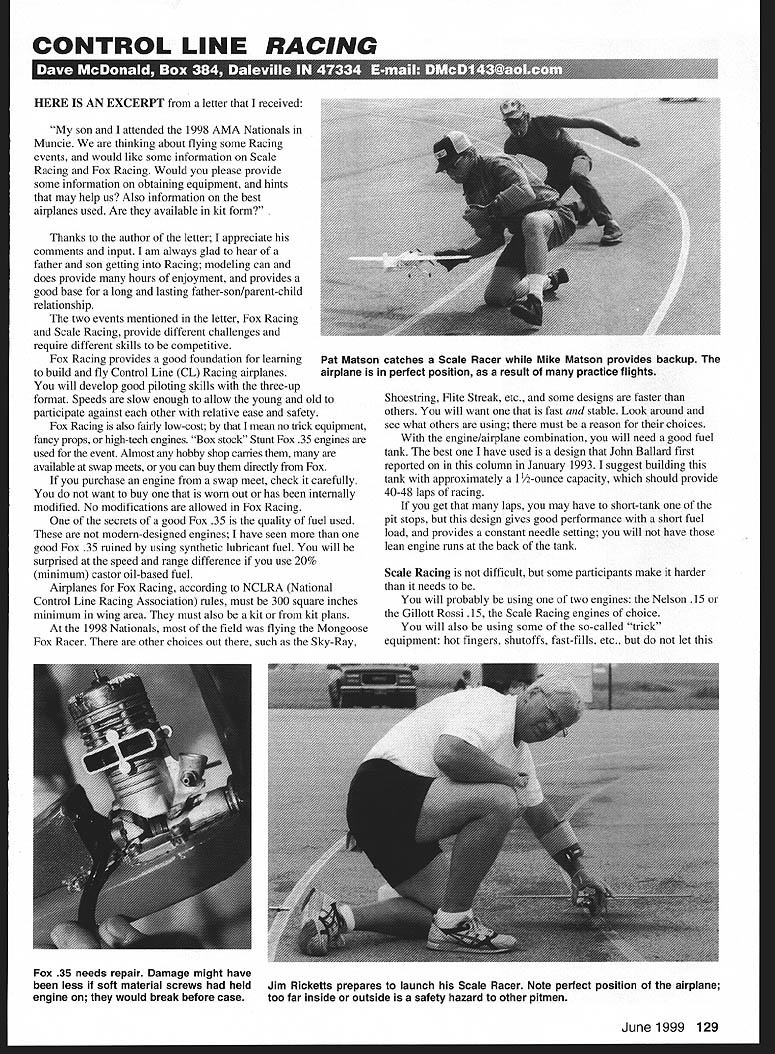 CONTROL LINE RACING iTY7 El] 1r rvtr1YjuIrIu WWj~f .F1Il-U Ii3k r IS EXCERPT letter received son attended 1998 AMA Nationals Muncie thinking about flying some Racing events would like some information Scale Racing Fox Racing Would please provide some information obtaining equipment hints may help us Also information best airplanes used Are available kit form Thanks author letter appreciate comments input am always glad hear father son getting Racing modeling can does provide hours enjoyment provides good base long lasting father-son/parent-child relationship two events mentioned letter Fox Racing Scale Racing provide different challenges require different skills competitive Fox Racing provides good foundation learning build fly Control Line CL Racing airplanes will develop good piloting skills three-up format Speeds slow enough allow young old participate against other relative ease safety Fox Racing also fairly low-cost mean no trick equipment fancy props high-tech engines Box stock Stunt Fox 35 engines used event Almost hobby shop carries available swap meets can buy directly Fox purchase engine swap meet check carefully want buy worn out has internally modified No modifications allowed Fox Racing secrets good Fox 35 quality fuel used modern-designed engines have seen good Fox 35 ruined using synthetic lubricant fuel will surprised speed range difference use 20% minimum castor oil-based fuel Airplanes Fox Racing according NCLRA National Control Line Racing Association rules must 300 square inches minimum wing area must also kit kit plans 1998 Nationals field flying Mongoose Fox Racer other choices out such Sky-Ray Shoestring Flite Streak etc some designs faster others will want fast stable Look around see what others using must reason choices engine/airplane combination will need good fuel tank best have used design John Ballard first reported column January 1993 suggest building tank approximately 1 1/2-ounce capacity should provide 40-48 laps racing get laps may have short-tank pit stops design gives good performance short fuel load provides constant needle setting will have lean engine runs back tank Scale Racing difficult some participants make harder needs will probably using two engines Nelson 15 Gillott Rossi 15 Scale Racing engines choice will also using some so-called trick equipment hot fingers shutoffs fast-fills etc let June 1999 129 Pat Matson catches Scale Racer Mike Matson provides backup airplane perfect position result practice flights Fox 35 needs repair Damage might have less soft material screws held Jim Ricketts prepares launch Scale Racer Note perfect position airplane engine would break before case too far inside outside safety hazard other pitmen scare really nothing trick about items Hot fingers nothing two pieces brass copper sheet separate wire running positive negative sides battery Shutoffs get pilots trouble main cause problems underestimating amount stress placed shutoffs during race Most shutoff failures caused poor construction poor design poor maintenance different ways make shutoff some have discussed column Look what some guys using will want watch couple characteristics functionality Does shutoff work time sturdy enough break Also consider ease operation pilot pitman Fast-fills mechanical rubber options opting mechanical should easy operate provide adequate fuel transfer volume easy maintain Rubber fast-fills have around some time Something watch quality slot bottom Are wall thicknesses equal using rubber fill important filler bulb has smooth round tip tear rubber resulting loss tank pressure Scale Racing airplane design consider Lil Quickie featured December 1982 Model Aviation choose build identical plans proven contender airplane provides good geometry tanks shutoffs fast responsive Hint success practice does take long contest sort out practice can learn something everyone may something want may something see positive good competitors out part doing same thing try reinvent wheel Watching asking questions will give good base start single racing team will answer questions provide helping hand should practice purpose Develop routine Start routine time go fly whether its contest Sunday practice session start engine same technique time will have fewer starting problems practice pit stops will make faster pits race goal pilot pitman become pitman should know pilot going land airplane approximately same speed timethat will pitting line too far inside outside pilot must know pitman will catch airplane refuel restart launch same degree expediency must know exactly what other thinking going prior doing way accomplish through practice must spend time flying circle doing nothing practicing pit stops like run approximately 15-20 laps make pit may seven eight times prior taking break may fly 700-1000 laps during practice uncommon bum gallon fuel during practice session No problem will arise race will arise practice practice long enough afraid try new things practice session Take notes engine responds certain changes props head clearance type plug temperature humidity altitude etc Keep notes safe place will become guide optimizing performance various locations various conditions Remember through practice can attempt achieve perfection New Events 1999 Nationals will feature two new supplemental events Vintage B Team Race Quickie Rat B Team Race will flown following F2C Wednesday afternoon Quickie Rat will fly Friday Rules both events may obtained NCLRA Web site http//membersaolcom/DMcDI43lindexhtm sending SASE address top column Vintage B Team Race sponsored Muncie Model & Hobby K&B has provided three K&B 4011 engines awards Quickie Rat NCLRA Are member bimonthly newsletter full tips information Dues $10 US $12 outside Send Dick Lambert 4651 Ridgewood Ave Port Orange FL 32127 As always comments solicited appreciated ng Equipment Nelson Competition Engines 121 Pebble Creek Lane Zelienople PA 16063 724 538-5282 Tim Gillott Scale Race engines 1063 Harding St Salina