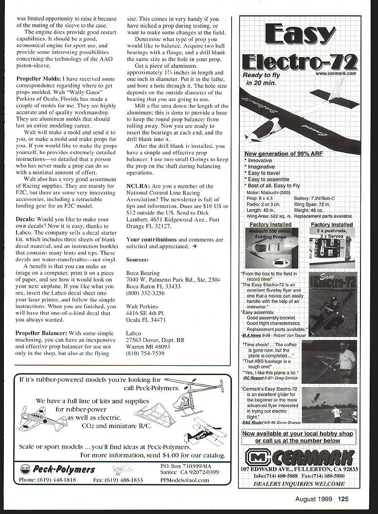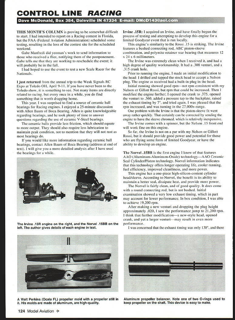 CONTROL LINE RACING mTY7Yrj mrI1rfItr -i r-i1J ii r- -u ii-i HIS MONTHS COLUMN proving somewhat difficult start intended report Racing contest Florida FAA Federal Aviation Administration scheduled some testing resulting loss contest site scheduled weekend Gabe Manfredi did yeomans work send information received flier notifying postponement Gabe tells working reschedule event will probably fall hoped use event test new Scale Racer Nationals just returned annual trip Weak Signals RC Expo Toledo OH April 9-11 have never Toledo show something see items directly related racing once find something worth dragging home year surprised find source ceramic ball bearings Racing engines enjoyed 25-minute discussion Allen Baum Boca Bearing Allen quite knowledgeable regarding bearings took plenty time answer questions regarding use ceramic V-Steel bearings ceramic balls provide less friction should equate output should also require less lubrication maintain peak condition mention will rust bearings would like information regarding ceramic ball bearings contact Allen Baum Boca Bearing address end text will give detailed analysis after have used bearings Irvine 15R acquired Irvine have finally begun process testing attempting develop engine limited Goodyear event run locally engines similarity Rossi 15 striking Irvine features bushed connecting rod ABC piston-sleeve combination polymite retainer rear bearing measures 12 x 24 x 6 millimeters Irvine extremely clean received high degree quality workmanship 308 venturi 315 crank hole Prior running engine made initial modification head drilled tapped stock head accept Nelson plug engine received built-in plug head Initial running showed good rpmnot rpm consistent Nelson Gillott Rossi rpm could increased modified engine further opened crank 375 opened venturi 360 added pressure tap backplate raised exhaust timing 70 tried again pleased rpm increased turning 27000-range problem Irvine piston-sleeve fit went away rather quickly certainly can corrected sending engine have sleeve chromed relatively inexpensive Irvine comes spinner Nelson 15 front end will work fine engine So far Irvine par Nelson Gillott Rossi should provide good power potential flying some form limited Goodyear have ability develop engine Norvel 15BB first engine know features AAO Aluminum-Aluminum-Oxide technologyAAO Ceramic Seal Cylinder/Piston technology Norvel information indicates technology offers longer operating life cooler running fuel efficiency improved cleanliness power engine has one-piece high-silicon-content cylinder head/sleeve According Norvel benefit its ability maintain better seal dissipate heat provide power Norvel fairly clean good quality does come round connecting rod bushed Initial examination showed very low exhaust timing part may account lower performance box condition able achieve 19200 rpm After making new venturi dropping plug height approximately 020 saw performance jump 21200 rpm think further modificationa new-style head opened crank yet larger venturimay result performance concerned exhaust timing 1380 124 Model Aviation ne 15R engine right Norvel 15BB left author gives details engine text Walt Perkins Ocala FL propeller mold propeller still Aluminum propeller balancer Note two 0-rings used molds made aluminum high-quality keep propeller shaft device easy make limited opportunity raise because mating sleeve case engine does provide good restart capabilities should good economical engine sport use provide some interesting possibilities concerning technology AAO piston-sleeve Propeller Molds have received some correspondence regarding get props molded Walt Wally Gator Perkins Ocala Florida has made couple molds highly accurate quality workmanship aluminum molds should last entire modeling career Walt will make mold send make mold make props you would like make props yourself provides extremely detailed instructionsso detailed person has never made prop can minimal amount effort Walt also has very good assortment Racing supplies mainly F2C some very interesting accessories including retractable landing gear F2C model Decals Would like make own decals Now easy thanks Labco company sells decal starter kit includes three sheets blank decal material instruction booklet contains hints tips decals water-transferablenot vinyl benefit can make image computer print piece paper see would look next airplane like what see insert Labco decal sheet laser printer follow simple instructions finished will have one-of-a-kind decal always wanted Propeller Balancer some simple machining can have inexpensive effective prop balancer use shop also flying have full line kits supplies well electric rubber-power site comes very handy have nicked prop during testing want make some changes field Determine what type prop would like balance Acquire two ball bearings flange drill blank same size hole prop Get piece aluminum approximately 1 inches length inch diameter Put lathe bore hole through hole size depends outside diameter bearing going use Mill flat area down length aluminum done provide base keep round prop balancer rolling away Now ready insert bearings end drill blank After drill blank installed have simple effective prop balancer use two small 0-rings keep prop shaft during balancing operations NCLRA Are member National Control Line Racing Association newsletter full tips information Dues $10 US $12 outside US Send Dick Lambert 4651 Ridgewood Ave Port Orange FL 32127 contributions comments solicited appreciated ces Boca Bearing 7040 W Palmetto Park Rd Ste 2304 Boca Raton FL 33433 800 332-3256 Walt Perkins 4416 SE 4th P1 Ocala FL 34471 Labco 27563 Dover Dept BR Warren Ml 48093 810 754-7539 its rubber-powered models youre looking call Peck-Polymers C02 miniature R/C Scale sport models ull find ideas Peck-Polymers information send $400 catalog ,P0 Box 710399-MA Santee CA 92072-0399 Phone 619 448 1818Fax 619 488-1833PPModels@aolcom Easy CIecU-12 Ready flywwwcermarkcom 20 mm * Innovative *