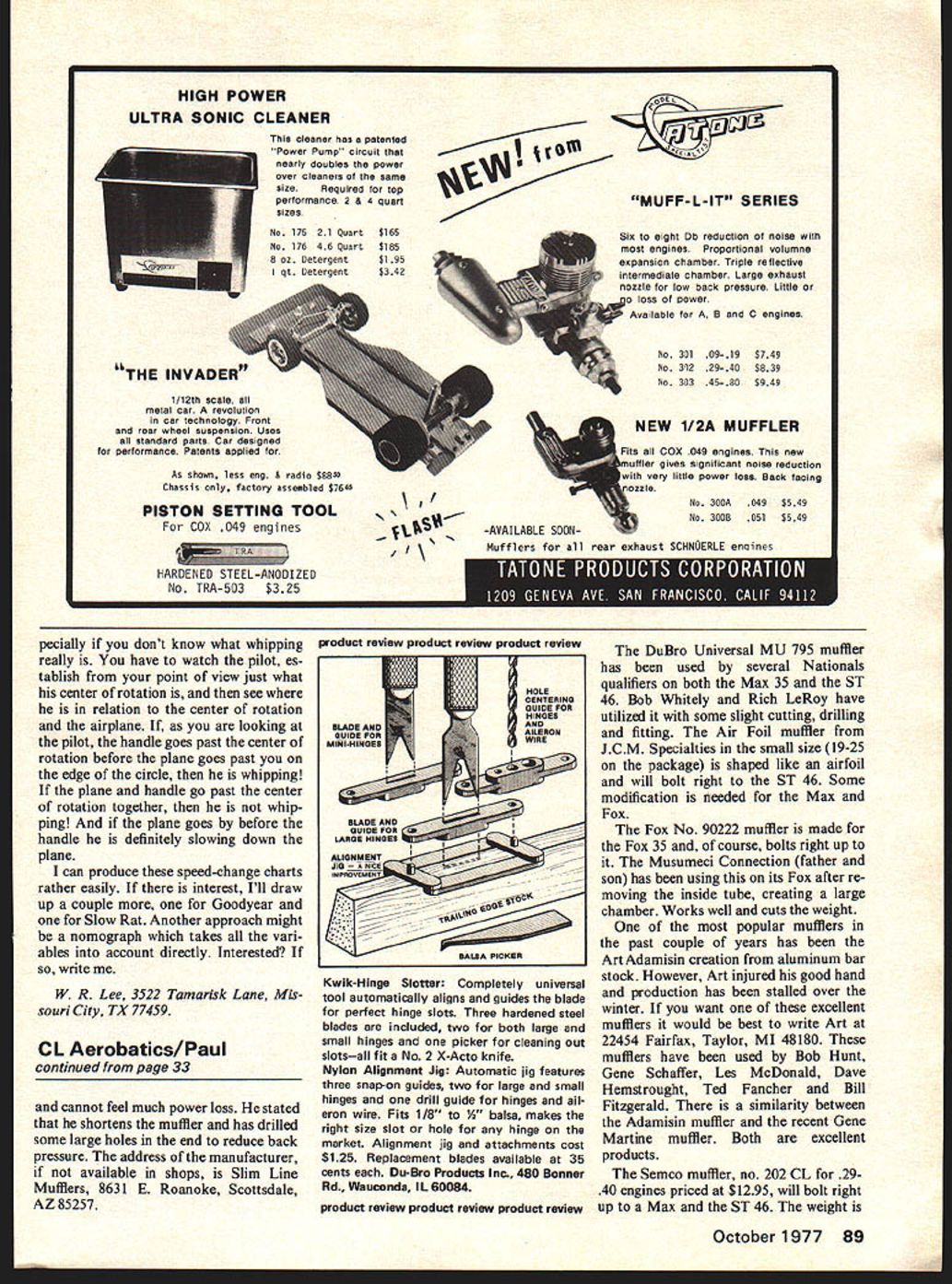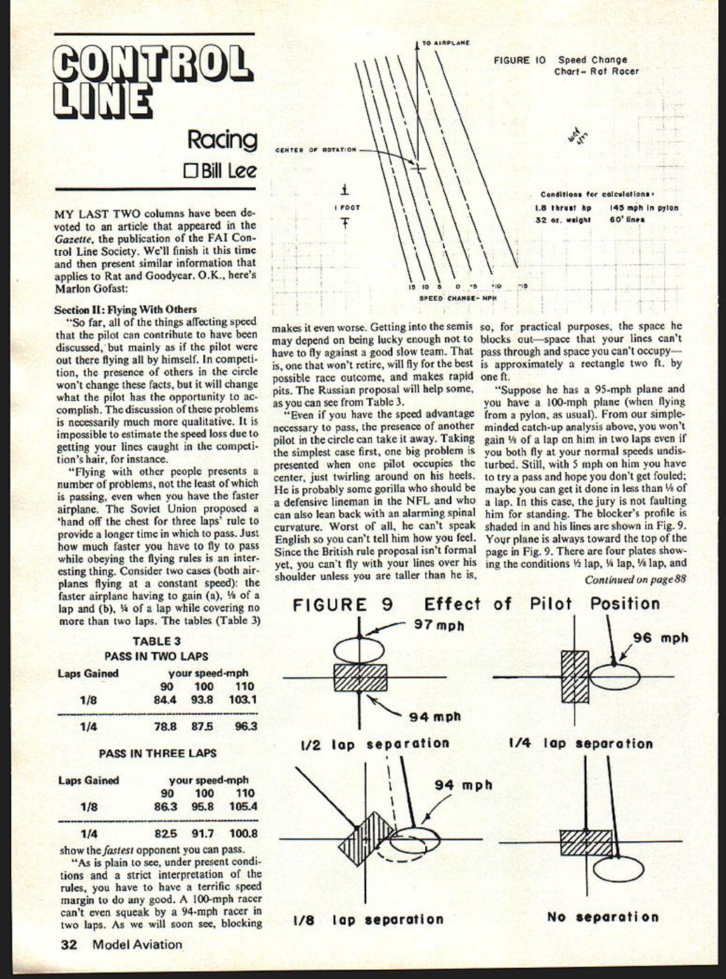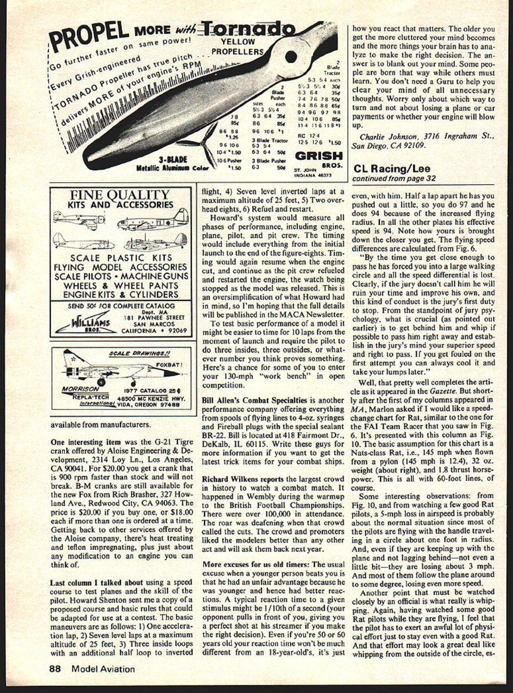 Racing EJBiII Lee MY LAST TWO columns have de voted article appeared Gazette publication FAI Con trol Line Society Well finish time present similar information applies Rat Goodyear OK heres MarIon Gofast Section II Flying Others So far things affecting speed pilot can contribute have discussed mainly pilot out flying himself competi tion presence others circle wont change facts will change what pilot has opportunity ac complish discussion problems necessarily much qualitative impossible estimate speed loss due getting lines caught competi tions hair instance Flying other people presents number problems least passing have faster airplane Soviet Union proposed hand off chest three laps rule provide longer time pass Just much faster have fly pass obeying flying rules inter esting thing Consider two cases both air planes flying constant speed faster airplane having gain 1/s lap b lap covering no two laps tables Table 3 TABLE 3 PASS IN TWO LAPS Laps Gained 1/8 speed-mph 90100110 8449381031 1/4788 875963 PASS IN THREE LAPS Laps Gainedyour speed-mph 90100110 1/88639581054 1/4 825 917 1008 show fastest opponent can pass As plain see under present condi tions strict interpretation rules have have terrific speed margin good 100-mph racer cant squeak 94-mph racer two laps As will soon see blocking AIRPLANE \\ \ CENTER OF ROTATION OT\\\18 thrust hp \\\32 oz weight lB 10 50 -51015 SPEED CHANGE MPH makes worse Getting semis may depend being lucky enough have fly against good slow team wont retire will fly best possible race outcome makes rapid pits Russian proposal will help some can see Table 3 have speed advantage necessary pass presence another pilot circle can take away Taking simplest case first big problem presented pilot occupies center just twirling around heels probably some gorilla should defensive lineman NFL can also lean back alarming spinal curvature Worst cant speak English cant tell him feel Since British rule proposal isnt formal yet cant fly lines over shoulder unless taller 97mph 94mph 1/2 lop separation 1/8 lap separation FIGURE 10 Speed Change Chart Rat Racer Conditions calculations 145 mph pylon 60 lines practical purposes space blocks outspace lines cant pass through space cant occupy approximately rectangle two ft ft Suppose has 95-mph plane have 100-mph plane flying pylon usual simple minded catch-up analysis above wont gain lap him two laps both fly normal speeds undis turbed Still 5 mph him have try pass hope dont get fouled maybe can get done less /s lap case jury faulting him standing blockers profile shaded lines shown Fig 9 plane always toward top page Fig 9 four plates show ing conditions lap /s lap Continued page 88 IN 98 mph / 1/4 lap separation 2 No separat 32 Model Aviation FIGURE 9Effect Pilot Position MORE wi1fld9 same powerYELLOW4 adr G0.sePROPELL Taco e\eeO~ 5 4 304 ~4O-53 54c h trv%o63 64 354 ~ 76 78 504 ~OXI84 86 88 654 94969798 \ 6e-104 10685 11-4 11-6 11-81 lC24 12526150 GRISH BROS ST JOHN INDIANA 46373 available manufacturers interesting item G-2 1 Tigre crank offered Aloise Engineering & De velopment 2314 Loy Ln Los Angeles CA 90041 $2000 get crank 900 rpm faster stock will break B-M cranks still available new Fox Rich Brasher 327 Howland Ave Redwood City CA 94063 price $2000 buy $1800 ordered time Getting back other services offered Aloise company theres heat treating teflon impregnating plus just about modification engine can think Last column talked about using speed course test planes skill pilot Howard Shenton sent copy proposed course basic rules could adapted use contest basic maneuvers follows 1 accelera tion lap 2 Seven level laps maximum altitude 25 feet 3 Three inside loops additional half loop inverted flight 4 Seven level inverted laps maximum altitude 25 feet 5 Two over head eights 6 Refuel restart Howards system would measure phases performance including engine plane pilot pit crew timing would include everything initial launch end figure-eights Tim ing would again resume engine cut continue pit crew refueled restarted engine watch being stopped model released oversimplification what Howard mind Im hoping full details will published MACA Newsletter test basic performance model might easier time 10 laps moment launch require pilot three insides three outsides what ever number think proves something Heres chance some enter 130-mph work bench open competition Bill Allens Combat Specialties another performance company offering everything spools flying lines 4-oz syringes Fireball plugs special sealant BR-22 Bill located 418 Fairmont Dr DeKaIb IL 60115 Write guys information want get latest trick items combat ships Richard Wilkens reports largest crowd history watch combat match happened Wembly during warmup British Football Championships over 100000 attendance roar deafening crowd called cuts crowd promoters liked modelers better other act will ask back next year excuses us old timers usual excuse younger person beats unfair advantage because younger hence better reac tions typical reaction time given stimulus might 1/10th second opponent pulls front giving perfect shot streamer make right decision youre 50 60 years old reaction time wont much different 18-year-olds its just react matters older get cluttered mind becomes things brain has ana lyze make right decision swer blank out mind Some peo ple born way others must learn dont need Guru help clear mind unnecessary thoughts Worry about way turn about losing plane car payments whether engine will blow up Charlie Johnson 3716 Ingraham St San Diego CA 92109 CL Racing/Lee continued page 32 him Half lap apart has pushed out little 97 does 94 because increased flying radius other plates effective speed 94 Note yours brought down closer get flying speed differences calculated Fig 6 time get close enough pass has forced large walking circle speed differential lost Clearly jury doesnt call him will ruin time improve own kind conduct jurys first duty stop standpoint jury psy chology what crucial pointed