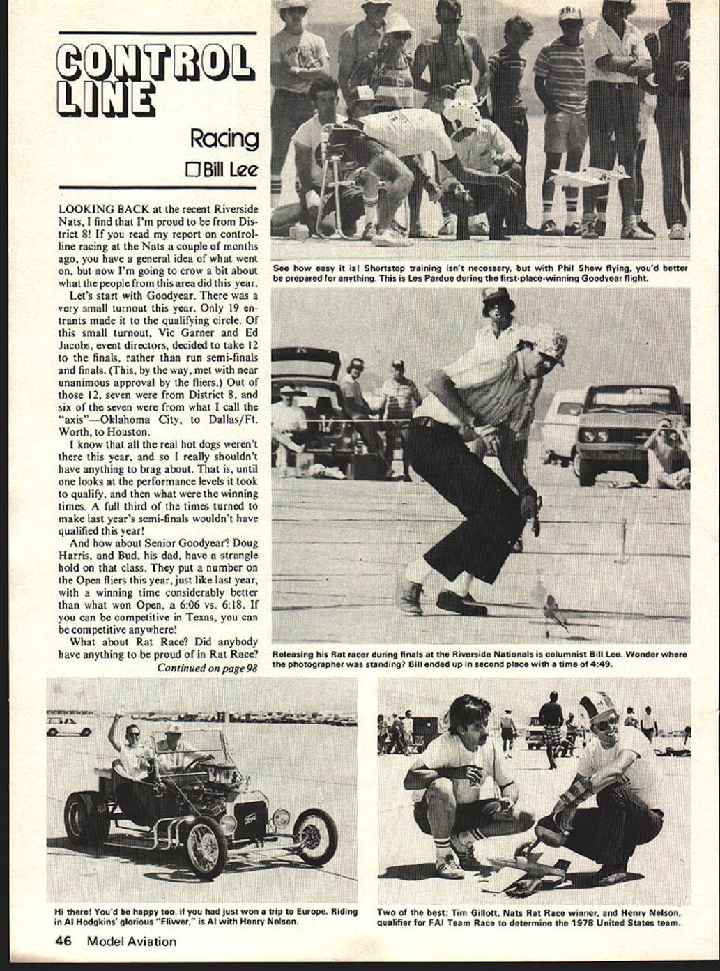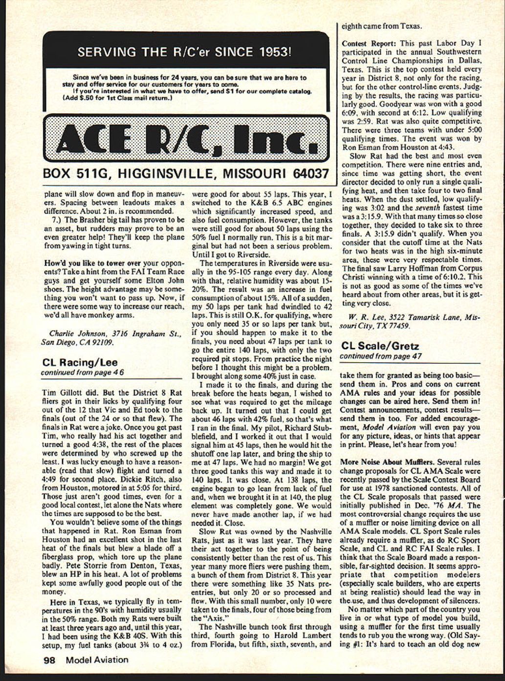 LuhJ Racing 0 Bill Lee LOOKING BACK recent Riverside Nats find Im proud Dis trict 8 read report controlline racing Nats couple months ago have general idea what went now Im going crow bit about what people area did year Lets start Goodyear very small turnout year Only 19 en trants made qualifying circle small turnout Vic Garner Ed Jacobs event directors decided take 12 finals rather run semi-finals finals way met near unanimous approval fliers Out 12 seven District 8 six seven what call axisOklahoma City Dallas/Ft Worth Houston know real hot dogs werent year really shouldnt have anything brag about until looks performance levels took qualify what winning times full third times turned make last years semi-finals wouldnt have qualified year about Senior Goodyear Doug Harris Bud dad have strangle hold class put number Open fliers year just like last year winning time considerably better what won Open 606 vs 618 can competitive Texas can competitive anywhere What about Rat Race Did anybody have anything proud Rat Race CnntinupdnnOR 46 Model Aviation See easy Shortstop training lant necessary mu anew tiying you-a oeier prepared anything Les Pardue during first-place-winning Goodyear fliaht Releasing Rat racer during finals Riverside Nationals columnist Bill Lee Wonder photographer standing Bill ended up second place time 449 Hi Youd happy too just won trip Europe Riding Two best Tim Gillott Nats Fiai nace winner ana nenry damson Al Hodgkins glorious Flivver Al Henry Nelson qualifier FAI Team Race determine 1978 United States team BOX 511G HIGGINSVILLE MISSOURI 64037 plane will slow down flop maneuv ers Spacing between leadouts makes difference About 2 recommended 7 Brasher big tail has proven asset rudders may prove greater help Theyll keep plane yawing tight turns Howd like tower oer oppon ents Take hint FAI Team Race guys get yourself some Elton John shoes height advantage may some thing wont want pass up Now some way increase reach wed have monkey arms Charlie Johnson 3716 Ingraham St San Diego CA 92109 CL Racing/Lee continued page 46 Tim Gillott did District 8 Rat fliers got licks qualifying four out 12 Vic Ed took finals out 24 flew finals Rat joke Once get past Tim really act together turned good 438 rest places determined screwed up least lucky enough have reason able read slow flight turned 449 second place Dickie Ritch also Houston motored 505 third just arent good times good local contest let alone Nats times supposed best wouldnt believe some things happened Rat Ron Esman Houston excellent shot last heat finals blew blade off fiberglass prop tore up plane badly Pete Storrie Denton Texas blew HP heat lot problems kept some awfully good people out money Texas typically fly tem peratures 90s humidity usually 50% range Both Rats built least three years ago until year using K&B 40S setup fuel tanks about 3 4 oz good about 55 laps year switched K&B 65 ABC engines significantly increased speed also fuel consumption However tanks still good about 50 laps using 50% fuel normally run bit mar ginal serious problem Until got Riverside temperatures Riverside usu ally 95-105 range day Along relative humidity about 1520% result increase fuel consumption about 15% sudden 50 laps per tank dwindled 42 laps still OK qualifying need 35 laps per tank should happen make finals need about 47 laps per tank go entire 140 laps two required pit stops practice night before thought might problem brought along some 40% just case made finals during break before heats began wished see what required get mileage back up turned out could get about 46 laps 42% fuel thats what ran final pilot Richard Stub blefield worked out would signal him 45 laps would hit shutoff lap later bring ship 47 laps no margin got three good tanks way made 140 laps close 138 laps engine began go lean lack fuel brought 140 plug element completely gone would never have made another lap needed Close Slow Rat owned Nashville Rats just last year have act together point being consistently better rest us year fliers pushing bunch District 8 year something like 35 Nats pre entries 20 processed flew small number 10 taken finals four being Axis Nashville bunch took first through third fourth going Harold Lambert Florida fifth sixth seventh eighth came Texas Contest Report past Labor Day participated annual Southwestern Control Line Championships Dallas Texas top contest held year District 8 racing other control-line events Judg ing results racing particu larly good Goodyear won good 609 second 612 Low qualifying 259 Rat also quite competitive three teams under 500 qualifying times event won Ron Esman Houston 443 Slow Rat best competition nine entries since time getting short event director decided run single quali fying heat take four two final heats dust settled low qualify ing 302 seventh fastest time 3159 times close together decided take six three finals 3159 didnt qualify consider cutoff time Nats two heats high six-minute area very respectable times final saw Larry Hoffman Corpus Christi winning time 6102 good some times weve heard about other areas get ting very close W R Lee 3522 Tamarisk Lane Mis souri City TX 77459 CL Scale/Gretz continued page 47 take granted being too basic send Pros cons current AMA rules ideas possible changes can aired Send Contest announcements contest results send too added encourage ment Model Aviation will pay picture ideas hints appear print Please lets hear Noise About Mufflers Several rules change proposals CL AMA Scale recently passed Scale Contest Board use 1978 sanctioned contests CL Scale proposals passed initially published Dec 76 MA controversial change requires use muffler noise limiting device AMA Scale models CL Sport Scale rules already require muffler RC Sport Scale CL RC FAT Scale rules think Scale Board made respon sible far-sighted decision seems appro priate competition modelers especially scale builders experts being realistic should lead way theuse thus development silencers No matter part coun