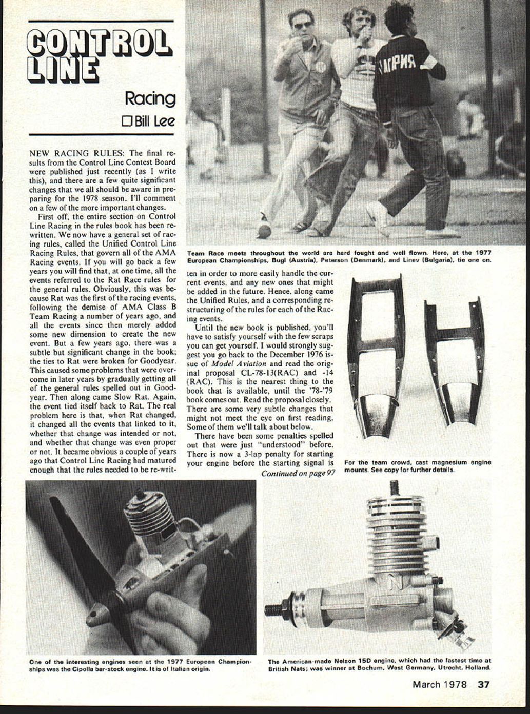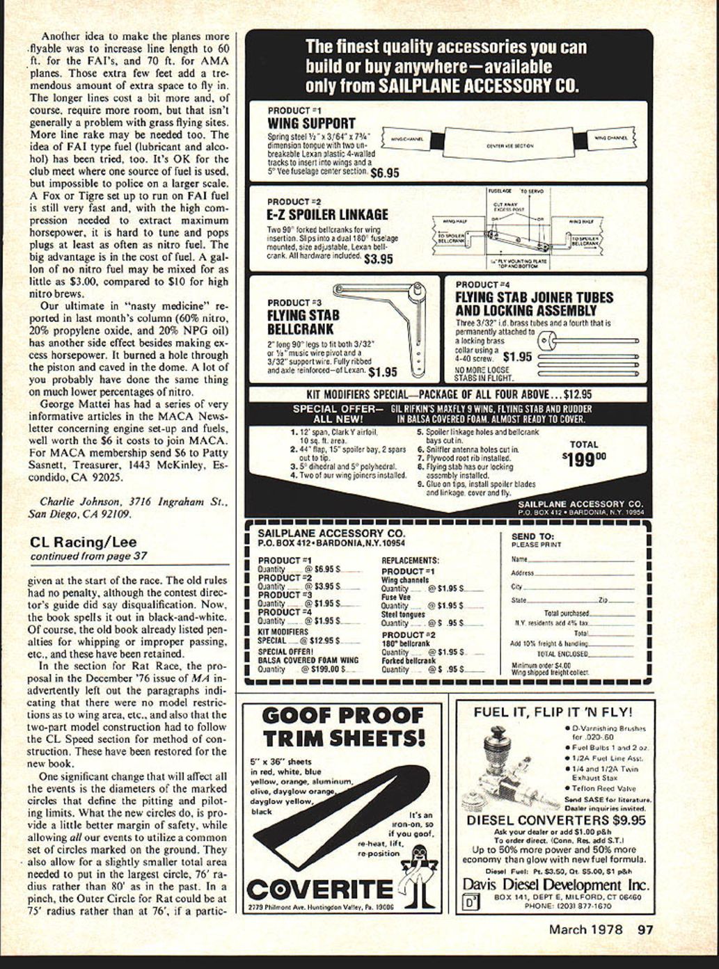 I Racing EJBiII Lee NEW RACING RULES final re suits Control Line Contest Board published just recently write few quite significant changes should aware pre paring 1978 season Ill comment few important changes First off entire section Control Line Racing rules book has re written now have general set rac ing rules called Unified Control Line Racing Rules govern AMA Racing events will go back few years will find time events referred Rat Race rules general rules Obviously cause Rat first racing events following demise AMA Class B Team Racing number years ago events since merely added some new dimension create new event few years ago subtle significant change book ties Rat broken Goodyear caused some problems over come later years gradually getting general rules spelled out Good year along came Slow Rat Again event tied itself back Rat real problem Rat changed changed events linked whether change intended whether change proper became obvious couple years ago Control Line Racing matured enough rules needed re-written order easily handle cur rent events new ones might added future Hence along came Unified Rules corresponding re structuring rules Rac ing events Until new book published youll have satisfy yourself few scraps can get yourself would strongly sug gest go back December 1976 sue Model viation read orig inal proposal CL-78-13RAC -14 RAC nearest thing book available until 78-79 book comes out Read proposal closely some very subtle changes might meet eye first reading Some well talk about below have some penalties spelled out just understood before now 3-lap penalty starting engine before starting signal Continued page 97 American-made Nelson 1 SD engine fastest time British Nats winner Bochum West Germany Utrecht Holland March 1978 37 Team Race meets throughout world hard fought well flown 1977 European Championships BugI Austria Peterson Denmark 1mev Bulgaria tie team crowd cast magnesium engine mounts See copy further details interesting engines seen 1577 European Champion ships Cipolla bar-stock engine Italian origin Another idea make planes flyable increase line length 60 ft FAIs 70 ft AMA planes extra few feet add tre mendous amount extra space fly longer lines cost bit course require room isnt generally problem grass flying sites line rake may needed too idea FAI type fuel lubricant alco hol has tried too Its OK club meet source fuel used impossible police larger scale Fox Tigre set up run FAI fuel still very fast high com pression needed extract maximum horsepower hard tune pops plugs least often nitro fuel big advantage cost fuel gal lon no nitro fuel may mixed little $300 compared $10 high nitro brews ultimate nasty medicine~ re ported last months column 60% nitro 20% propylene oxide 20% NPG oil has another side effect besides making ex cess horsepower burned hole through piston caved dome lot probably have done same thing much lower percentages nitro George Mattei has series very informative articles MACA News letter concerning engine set-up fuels well worth $6 costs join MACA MACA membership send $6 Patty Sasnett Treasurer 1443 McKinley Es condido CA 92025 Charlie Johnson 3716 San Diego CA 92109 graham St CL Racing/Lee continued page 37 given start race old rules no penalty although contest direc tors guide did say disqualification Now book spells out black-and-white course old book already listed pen alties whipping improper passing etc have retained section Rat Race pro posal December 76 issue MA advertently left out paragraphs indi cating no model restric tions wing area etc also two-part model construction follow CL Speed section method con struction have restored new book significant change will affect events diameters marked circles define pitting pilot ing limits What new circles pro vide little better margin safety allowing events utilize common set circles marked ground also allow slightly smaller total area needed put largest circle 76 ra dius rather 80 past pinch Outer Circle Rat could 75 radius rather 76 partic PRODUCT1 WING SUPPORT Spring steel 1/2 03/64 57HONG Co NAGWING CHANNEL dimension tongue two on-CENHAN ICA breakable Lexan plastic 4-walled tracks insert wings 5 Vee fuselage center section $695 PRODUCT #2 E-Z SPOILER LINKAGE Two 900 torked bellcranks wing insertion Slips deal 1 800 fuselageCELLCNANNeHONeCILEN mounted size adjustable Lexan bellcrank hardware included $395 oPRODUCTm4 PRODUCT #3FLYING STAB JOINER TUBES FLYING STABAND LOCKING ASSEMBLY Three 3/32 id brass tubes fourth BELLCRANKpermanently attached 2 long 900 legs fit both 3/32a locking brass /o music wire pivot sing 3/32 support wire Fully ribbed4-40 screw $1 anle reintorcedot Lexan $195HNO MORE LOOSE STABS IN FLIGHT KIT MODIFIERS SPECIALPACKAGE OF ALL FOUR ABOVE. $1295 S 1 12 span Clark Y airfoil 10 sq area 2 44 hap 15 spoiler bay 2 spars out tip 3 5 dihedral 50 polyhedral Two oh wing joiners installed 5 Spoiler linkage holes bellcrank bays cut 6 Sniffler antenna holes cut 7 Plywood root rib installed 8 Flying stab has locking assembly installed 9 Glue tips install spoiler blades linkage cover fIr TOTAL $19000 SAILPLANE ACESSOHY COSEND TO PO BOX 412 BARDONIANY10954PLEASE PRINT I I PRODUCT #1REPLACEMENTSiSaws Quantity . @ $695 5PRODUCT #1Address .......... PRODUCT #2Wing channels Ouantity @ $395 5-Quantity @ $195 $ciw........ Quantity 95 $.Quantity 95 $ PRODUCT #3Fuse VeeSlotsZip......... PRODUCT #4Steel tongues l purchased II Quantity @ $195 5---Quantity @ $95 $.. -NY residentu odd 4% tax KIT MODIFIERSPRODUCT #2Tntal SPECIAL @ $1295 $iso0 belicrankAdd 10% Irniehi & handilneI FFERQuantity 95 $--TOTAL 5NCLO5CO BALSA COVEREDMinimum nrder $400 FOAM WINGForked bellcrank Quantity@ $19900 $Quantity@ $ 95 $ Wing shipped treight cniiectI k March1978 97 GOOF PROOF TRIM SHEETS Ita iron-on goof re heat ft 2779 Ph man Aae Hun agdan Va eye 05 C COVERITE Pa 9006 FUEL IT FLIP IT N FLY D-Varnrshpng Brashes 020-60 Fuei Bulbs 1 2 oz 01 /2A Fani Line Assi 01/4 1 /2A Twn 0 Tef ion Rend Vaive 1.Send SASE linerasure