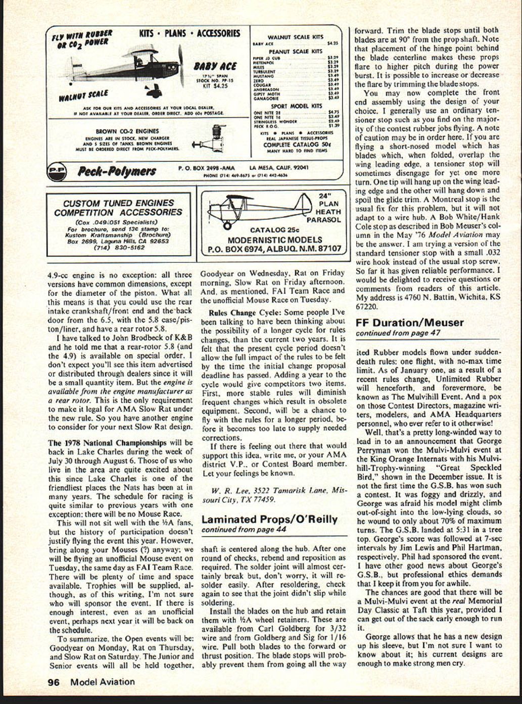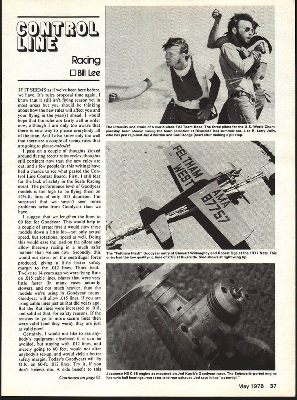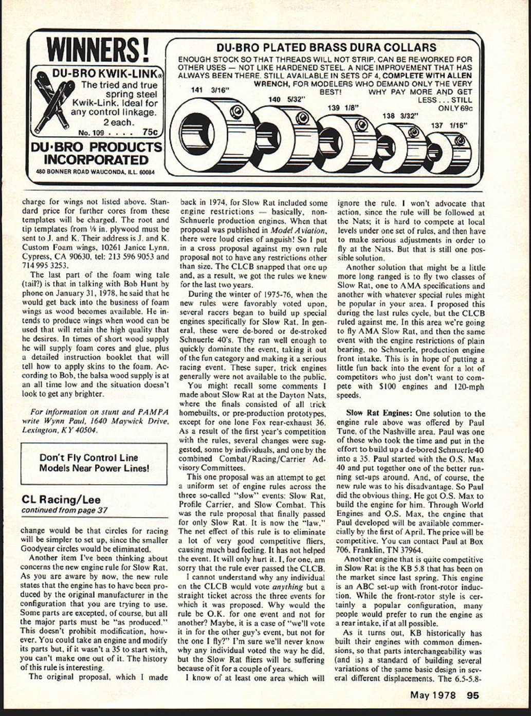Racing 0 Bill Lee IF IT SEEMS weve before have Its rules proposal time again know still isnt flying season yet areas hut should thinking about new rules will affect flying years ahead would hope rules fairly well order now although am too aware now way please everybody time also know too well couple racing rules going please nobody pass couple thoughts kicked around during recent rules cycles thoughts still pertinent now new rules out few people writing have chance see what passed Con trol Line Contest Board First still fear lack safety Scale Racing event performance level Goodyear models too high flying 52-ft lines 012 diameter Im surprised havent seen problems arise Goodyear have suggest lengthen lines 60 feet Goodyear would help couple areas first would slow models down little bitnot actual speed rotational speed well Doing would ease load pilots allow three-up racing much safer manner see now Secondly would cut down centrifugal force produced giving little better safety margin 012 lines Think back Twelve 14 years ago flying Rats 015 cable lines planes very little faster cases actually slower much heavier models using Goodyear today Goodyear will allow 015 lines using cable lines just Rat did years ago Rat lines increased 018 solid safety reasons reasons go secure lines valid just valid now Certainly would like see bodys equipment obsoleted can avoided staying 012 lines merely going 60 feet would alter anybodys set-up would yield better safety margin Todays Goodyears will fly OK 60-ft 012 lines Try dont believe side benefit Continued page 9S May1978 37 Intensity strain 0 world-class I-RI i earn Hace Ins tnree pilots ror tne un vvario Lnam pionship team shown during team selection Riverside last summer R Larry Jolly has just rejoined Jay Albritton end Carl Dodge rear after making pit stop Feltham Flash~ ioodyear entry ot stewart Vviiloughby ooertuge attne iI riats mis entry low qualifying time 253 Riverside Skid shows right wing tip Japanese MUK 15 engine mounted Jed Kuslics Uoodyear racer Schnuerleported engine has twin ball bearings rear rotor rear exhaust Jed says has potential WINNERS DU-BRO KWIK-LINK tried true 141 3/16 Wspring steel Kwi k-Link Ideal control linkage No 1092each 75c DUBRO PRODUCTS INCORPORATED 480 BONNER ROAD WAUCONDA ILL 60084 charge wings listed above Stan dard price further cores templates will charged root tip templates ood must sent J K address K Custom Foam wings 10261 Janice Lynn Cypress CA 90630 tel 213 596 9053 714995 3253 last part foam wing tale tail talking Bob Hunt phone January 31 1978 said would get back business foam wings wood becomes available tends produce wings wood can used will retain high quality desires times short wood supply will supply foam cores glue plus detailed instruction booklet will tell apply skins foam Ac cording Bob balsa wood supply time low situation doesnt look get brighter information stunt PAMPA write Wynn Paul 1640 Maywick Drive Lexington KY 40504 Dont Fly Control Line Models Near Power Lines CL Racing/Lee continued page 37 change would circles racing will simpler set up since smaller Goodyear circles would eliminated Another item Ive thinking about concerns new engine rule Slow Rat As aware now new rule states engine has have pro duced original manufacturer configuration trying use Some parts excepted course major parts must produced doesnt prohibit modification ever could take engine modify its parts wasnt 35 start cant make out history rule interesting original proposal made back 1974 Slow Rat included some engine restrictions cally non Schnuerle production engines proposal published Model viation loud cries anguish So put cross proposal against own rule proposal have restrictions other size CLCB snapped up result got rules knew last two years During winter 1975-76 new rules favorably voted upon several racers began build up special engines specifically Slow Rat gen eral de-bored de-stroked Schnuerle 40s ran well enough quickly dominate event taking out fun category making serious racing event super trick engines generally available public might recall some comments made about Slow Rat Dayton Nats finals consisted trick homebuilts pre-production prototypes except lone Fox rear-exhaust 36 As result first years competition rules several changes sug gested some individuals combined Combat/Racing/Carrier Ad visory Committees proposal attempt get uniform set engine rules across three so-called slow events Slow Rat Profile Carrier Slow Combat rule proposal finally passed Slow Rat now law net effect rule eliminate lot very good competitive fliers causing much bad feeling has helped event will hurt am sorry rule ever passed CLCB cannot understand individual CLCB would vote anything straight ticket across three events proposed would rule OK event another Maybe case well vote other guys event fly Im sure well never know individual voted way did Slow Rat fliers will suffering because couple years know least area will ignore rule wont advocate action since rule will followed Nats hard compete local levels under set rules have make serious adjustments order fly Nats still pos sible solution Another solution might little long ranged fly two classes Slow Rat AMA specifications another whatever special rules might popular area proposed during last rules cycle CLCB ruled against area going fly AMA Slow Rat same event engine restrictions plain bearing no Schnuerle production engine front intake hope putting little fun back event lot competitors just dont want com pete $100 engines 120-mph speeds Slow Rat Engines solution engine rule above offered Paul Tune Nashville area Paul took time put effort build up de-bored Schnuerle4o 35 Paul started OS Max 40 put together better run ning set-ups around course new rule disadvantage So Paul did obvious thing got OS Max build engine him Through World Engines OS Max engine Paul developed will available commer cially first April price will competitive can contact Paul Box 706 Franklin TN 37964 Anothe