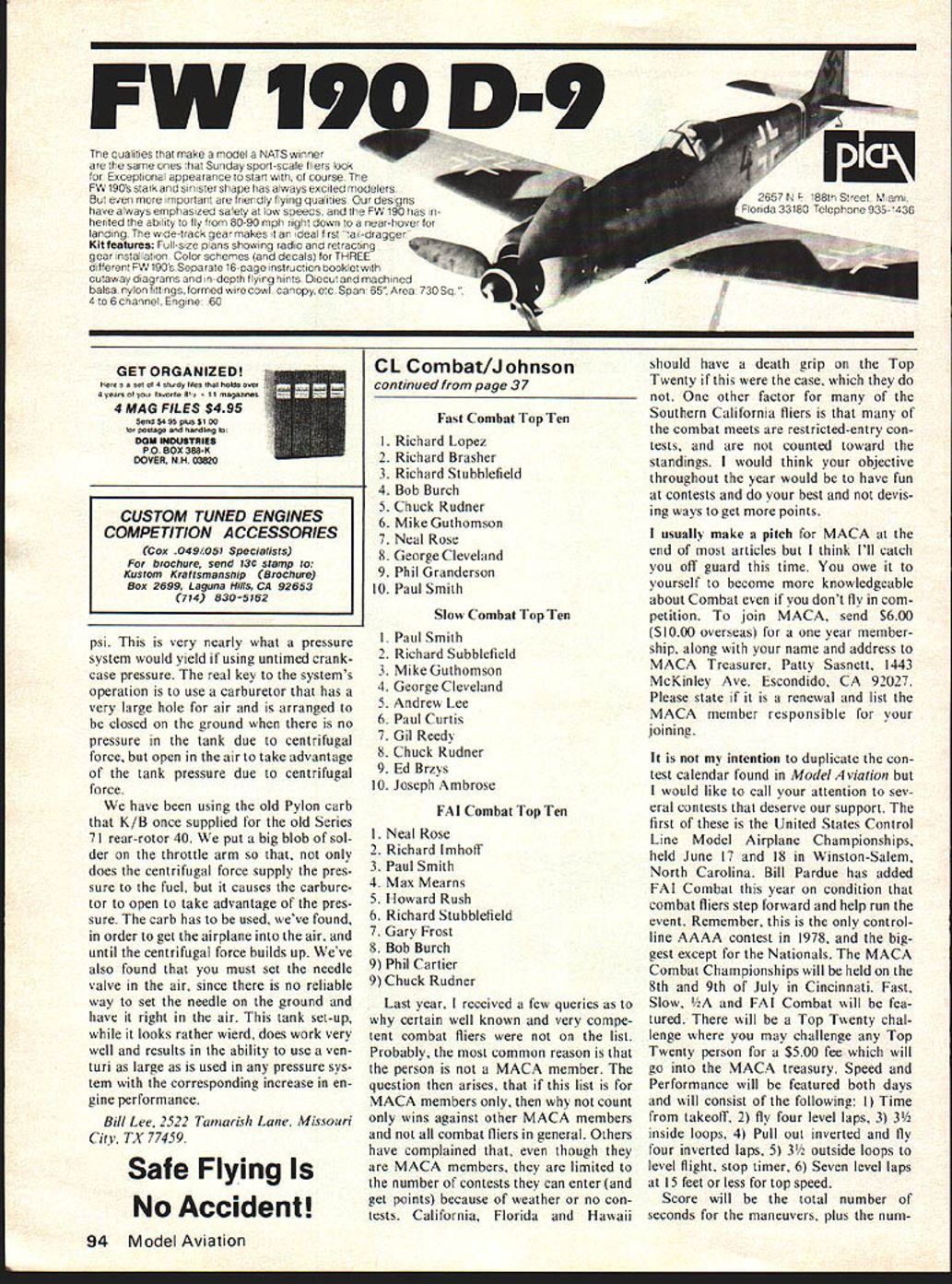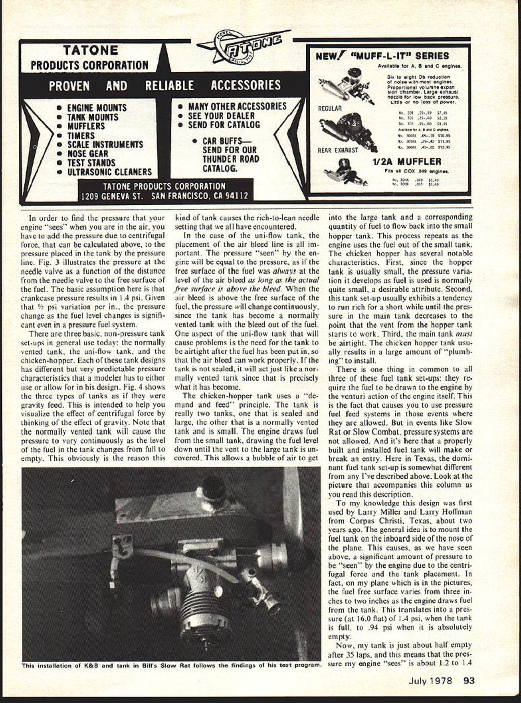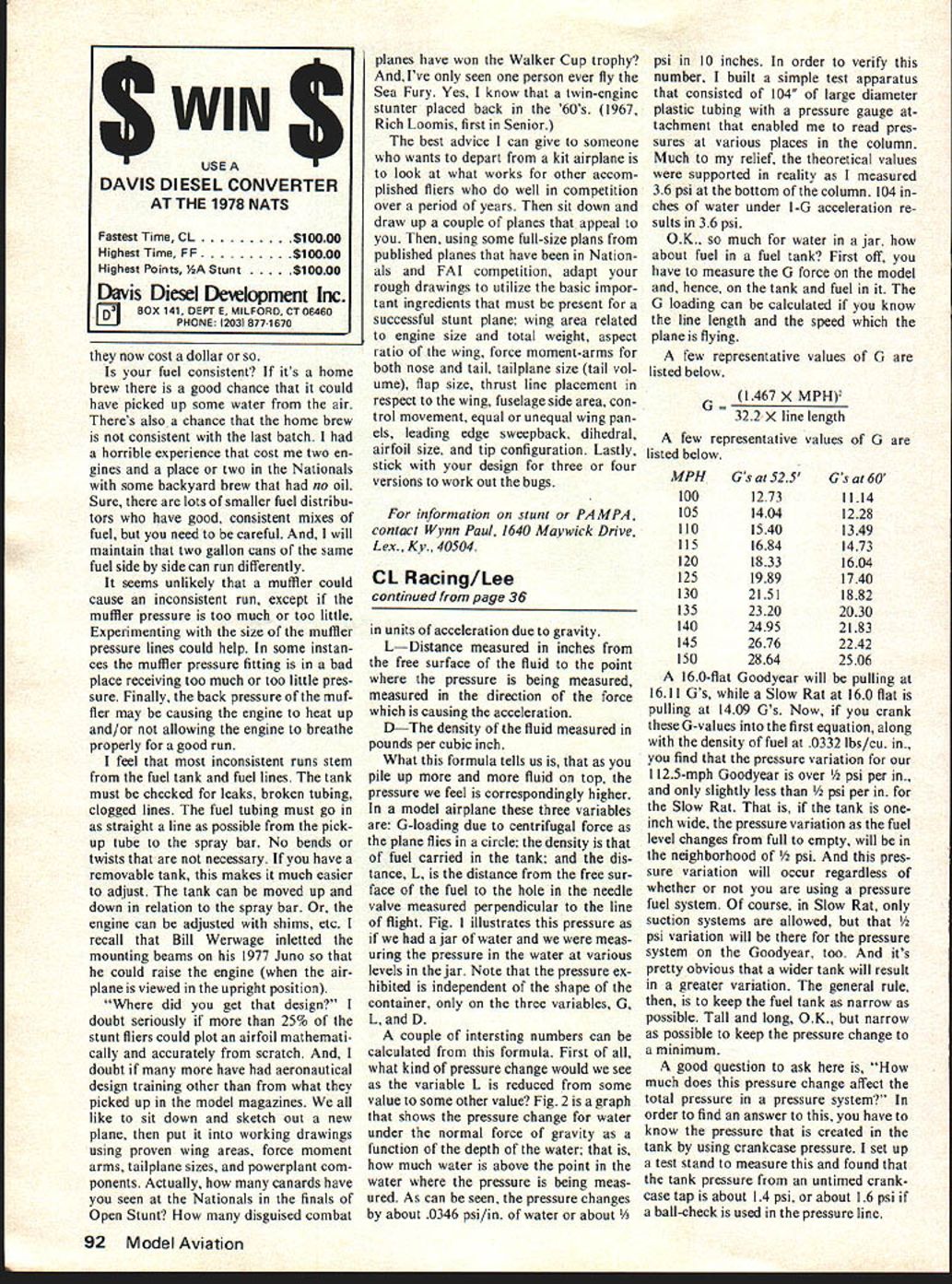 Control Line. Racing. Bill Lee IT SEEMS areas construction competition can best classified black magic seems flier has own way doing something undoubtedly best way Well want talk about little theory give some equations about fuel tanks shape placement act way flight hope will dis pel some myth surrounds topic First some basic facts weight water very near oz per fluid ounce converts 0346 pounds per cu since fluid ounce 1804 cu OK whos worried about weight water Certainly use very little flying model airplanes Well turns out fuel very near water weight 96 ounce per fluid ounce So want un derstand what goes fuel system can investigate using water know ballpark fuel Listed V-IF IF vj ii 1 -I1W 1 I1I ff11 1 FIGURE 1 WATER IN JAR PRESSURE IS FUNCTION OF DEPTH 0346 0346 IUIIIfIYiILILIiII below some densities various fluids Ounces Lbs Specific fi oz cu Gravity Water Methanol Ucon LB625 Nitromethane Fuel 50% nit ro 100346 810281 960332 1060368 960332 10 81 96 106 96 As can seen table alcohol lighter water nitro heavier oil slightly lighter com bine components make fuel result slightly lighter water about same density oil Now apply numbers few principles physics can help us swer question Any quantity fluid subjected force will exhibit some fixed characteristics important us pressure gradiant within fluid function much fluid piled above pressure can simply expressed formula P product G L D GThe acceleration affect measured Continued page 92 j7{F41 LI2ii -R4i2S j-- -v - 30NCFoHNv 2O1 UIiFA 11li ILl AIR 6 IL-FUEL IAIR TO ENGINE FIGURE 4 TANK CONFIGURATIONS MAIN TANK AIR Ei HOPPER -PARTIAL VACUUM FUEL TO ENGINE UNIFLOW CHICKEN HOPPER 36 Model Aviation NORMALLY VENTED TO ENGI now cost dollar fuel consistent its home brew good chance could have picked up some water air Theres also chance home brew consistent last batch horrible experience cost two en gines place two Nationals some backyard brew no oil Sure lots smaller fuel distribu tors have good consistent mixes fuel need careful will maintain two gallon cans same fuel side side can run differently seems unlikely muffler could cause inconsistent run except muffler pressure too much too little Experimenting size muffler pressure lines could help some instan ces muffler pressure fitting bad place receiving too much too little pres sure Finally back pressure muf fler may causing engine heat up and/or allowing engine breathe properly good run feel inconsistent runs stem fuel tank fuel lines tank must checked leaks broken tubing clogged lines fuel tubing must go straight line possible pick up tube spray bar No bends twists necessary have removable tank makes much easier adjust tank can moved up down relation spray bar engine can adjusted shims etc recall Bill Werwage inletted mounting beams 1977 Juno could raise engine air plane viewed upright position did get design doubt seriously 25% stunt fliers could plot airfoil mathemati cally accurately scratch doubt have aeronautical design training other what picked up model magazines like sit down sketch out new plane put working drawings using proven wing areas force moment arms tailplane sizes powerplant com ponents Actually canards have seen Nationals finals Open Stunt disguised combat planes have won Walker Cup trophy Ive seen person ever fly Sea Fury Yes know twin-engine stunter placed back 60s 1967 Rich Loomis first Senior best advice can give someone wants depart kit airplane look what works other accom plished fliers well competition over period years sit down draw up couple planes appeal using some full-size plans published planes have Nation als FAI competition adapt rough drawings utilize basic impor tant ingredients must present successful stunt plane wing area related engine size total weight aspect ratio wing force moment-arms both nose tail tailplane size tail vol ume flap size thrust line placement respect wing fuselage side area con trol movement equal unequal wing pan els leading edge sweepback dihedral airfoil size tip configuration Lastly stick design three four versions work out bugs information stunt PAMPA contact Wynn Paul 1640 Maywick Drive Lex Ky. 40504 CL Racing/Lee continued page 36 units acceleration due gravity LDistance measured inches free surface fluid point pressure being measured measured direction force causing acceleration DThe density fluid measured pounds per cubic inch What formula tells us pile up more fluid top pressure feel correspondingly higher model airplane three variables 6-loading due centrifugal force plane flies circle density fuel carried tank dis tance L distance free sur face fuel hole needle valve measured perpendicular line flight Fig illustrates pressure jar water meas uring pressure water various levels jar Note pressure ex hibited independent shape container three variables G L D couple intersting numbers can calculated formula First what kind pressure change would see variable L reduced some value some other value Fig 2 graph shows pressure change water under normal force gravity function depth water much water above point water pressure being meas ured As can seen pressure changes about 0346 psi/in water about psi 10 inches order verify number built simple test apparatus consisted 104 large diameter plastic tubing pressure gauge tachment enabled read pres sures various places column Much relief theoretical values supported reality measured 36 psi bottom column 104 ches water under 1-6 acceleration re sults 36 psi OK much water jar about fuel fuel tank First off have measure G force model hence tank fuel 6 loading can calculated know line length speed plane flying few representative values 6 listed below 6 1467 x MPH2 322 X line length few representative values G listed below MPHGs 525Gs 60 10012731114 10514041228 11015401349 11516841473 12018331604 12519891740 13021511882 13523202030 14024952183 14526762242 ISO28642506 160-flat Goodyear will pulling 1611 6s Slow Rat 160 flat pulling 1409 6s Now crank 6-values first equation along density fuel 0332 lbs/c