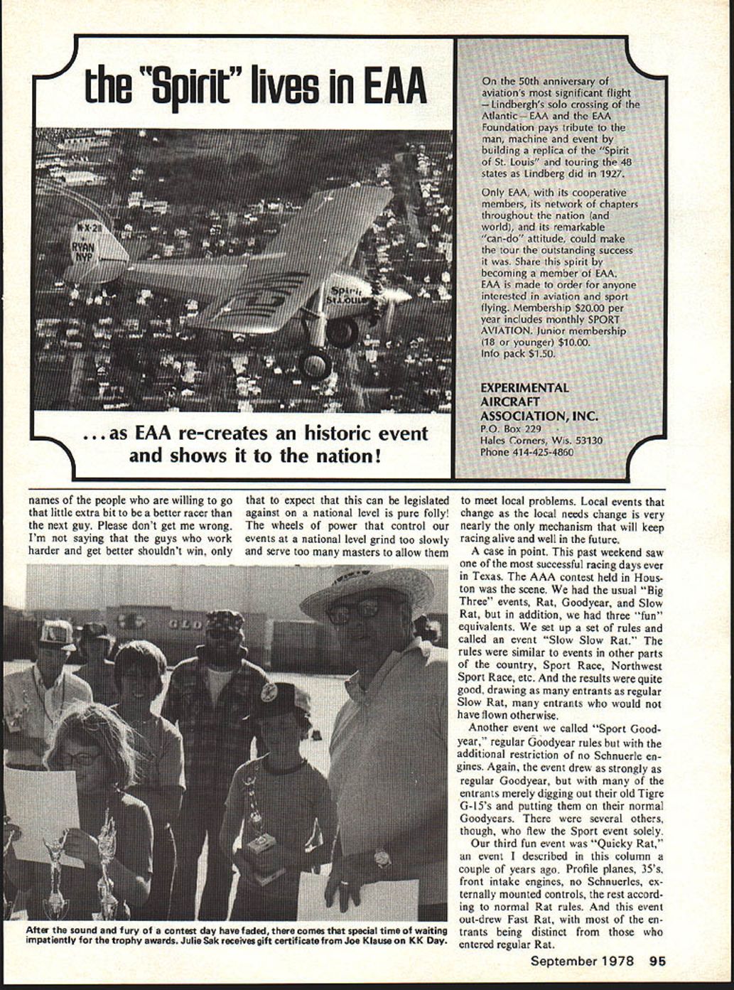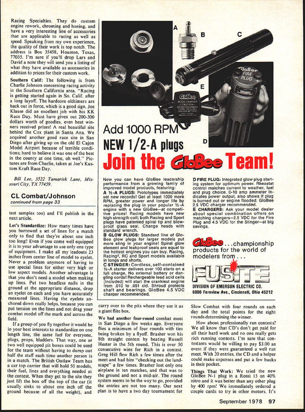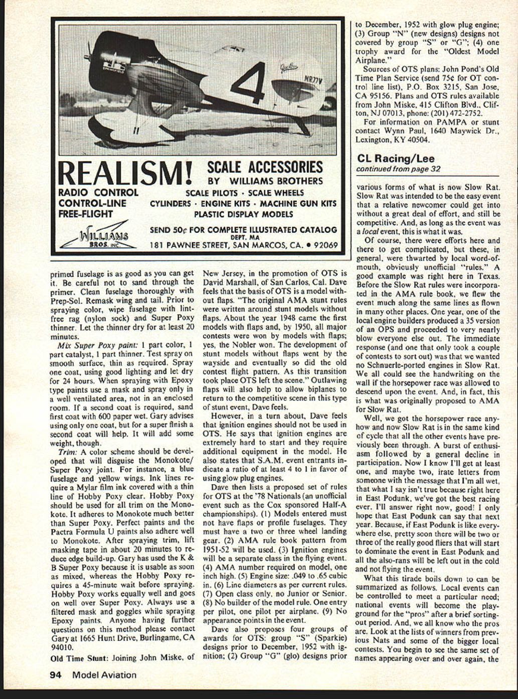 is Slow Rat event grew out lot people need eas response decline fast Rat ier less complex event satisfied Control lIme. Rat become too fast too complicated Continued page 94 Racing. Bill Lee THE LAST few years have seen lot words spent topic Control Line Racing rules events etc King rac ing still lives Rat still alive well contrary dire predictions some author Admittedly isnt event today ten fifteen years ago Rat strong today three four years ago unexpected have seen lot events control line otherwise have burst upon scene enjoying immense popularity rather brief period time die apparently die What about events makes seem go through cycle bad Weve seen Rat over years big event seemed draw many entrants drop down very low level low enough isnt flown areas country find flying Rat Look around next contest go think youll find Rat fliers general long-term competitors ones have around long time say number competitors fly Rat probably have flying Rat long time form majority people youll find flying event today just isnt very much new blood Rat today what blood left very high quality experience exhibited whats left Rat fliers quality about Goodyear think youll find very much same cycle has affected Goodyear has affected Rat initial burst enthusiasm event big drawing card local contest followed gradual decline down some level again inter est becomes low enough event isnt flown places find flying Goodyear today Again look around next contest go Youll find few flying Goodyear today have general flying event long time some before first became official event same people nucleus Rat nucleus Good year Sure remaining Good year fliers Rat fliers too enough indicate something latest event go through cycle 32 Model Aviation Typical revival racing events Southern Cal Kustom Kraft Race Day distin guished great flying site good prizes well down line some fine racing Fred Buschbaum raises right foot clear modelhes lefthanded Dale Kim watches Big Goodyear UouW bit 0 clown elevator about cause problem ratty Sasnett launches tor daughter Julie Photographs Kustorn Kraft Race Day Charlie Johnson SCALE PILOTS SCALE WHEELS CYLINDERS ENGINE KITS INE GUN KITS PLASTIC DISPLAY MODELS SEND 5O FOR COMPLETE ILLUSTRATED CATALOG DEPT MA 181 PAWNEE STREET SAN MARCOS CA 9 primed fuselage good can get it Be careful sand through primer Clean fuselage thoroughly Prep-Sol Remask wing tail Prior spraying color wipe fuselage lintfree rag nylon sock Super Poxy thinner Let thinner dry least 20 minutes Mix Super Poxy paint 1 part color 1 part catalyst 1 part thinner Test spray smooth surface thin required Spray coat using good lighting let dry 24 hours spraying Epoxy type paints use mask spray well ventilated area enclosed room second coat required sand first coat 600 paper wet Gary advises using coat super finish second coat will help will add some weight though Trim A color scheme should devel oped will disguise Monokote/ Super Poxy joint instance blue fuselage yellow wings Ink lines re quire Mylar film ink covered thin line Hobby Poxy clear Hobby Poxy should used trim Mono kote adheres Monokote much better Super Poxy Perfect paints Pactra Formula U paints also adhere well Monokote After spraying trim lift masking tape about 20 minutes re duce edge build-up Gary has used K & B Super Poxy because usable soon mixed whereas Hobby Poxy re quires 45-minute wait before spraying Hobby Poxy works equally well goes well over Super Poxy Always use filtered mask goggles spraying Epoxy paints Anyone having further questions method please contact Gary 1665 Hunt Drive Burlingame CA 94010 Old Time Stunt Joining John Miske New Jersey promotion OTS David Marshall San Carlos Cal Dave feels basis OTS model out flaps original AMA stunt rules written around stunt models flaps About year 1948 came first models flaps 1950 major contests won models flaps yes Nobler won development stunt models flaps went wayside eventually did old contest flight pattern As transition took place OTS left scene Outlawing flaps will also help allow biplanes return competitive scene type stunt event Dave feels However turn about Dave feels ignition engines should used OTS says ignition engines extremely hard start require additional equipment model also states SAM event entrants dicate ratio least 4 1 favor using glow plug engines Dave lists proposed set rules OTS 78 Nationals unofficial event such Cox sponsored Half-A championships Models entered must have flaps profile fuselages must have two three wheel landing gear 2 AMA rule book pattern 195 1-52 will used 3 Ignition engines will separate class flying event 4 AMA number required model inch high 5 Engine size 049 65 cubic 6 Line diameters per current rules 7 Open class no Junior Senior 8 No builder model rule entry per pilot pilot per airplane 9 No appearance points event Dave also proposes four groups awards OTS group 5 Sparkie designs prior December 1952 ig nition 2 Group G glo designs prior December 1952 glow plug engine 3 Group N new designs designs covered group 5 G 4 trophy award Oldest Model Airplane Sources OTS plans John Ponds Old Time Plan Service send 75 OT con trol line list PO Box 3215 San Jose CA 95156 Plans OTS rules available John Miske 415 Clifton Blvd Clif ton NJ 07013 phone 201 472-2752 information PAMPA stunt contact Wynn Paul 1640 Maywick Dr Lexington KY 40504 CL Racing/Lee continued page 32 various forms what now Slow Rat Slow Rat intended easy event relative newcomer could get great deal effort still competitive long event local event what course efforts get complicated general thwarted local word-ofmouth obviously unofficial rules good example right Texas Before Slow Rat rules incorpora ted AMA rule book flew event much along same lines flown other places year local engine builders produced 35 version OPS proceeded very nearly blow everyone else out immediate response took couple contests sort out wanted no Schnuerle-ported engines Slow Rat could see handwriting wall horsepower race allowed descend upo