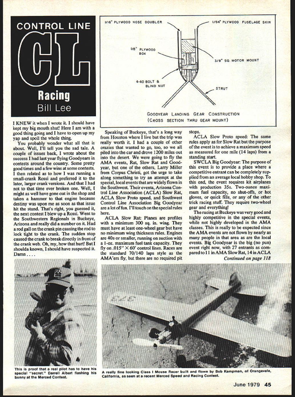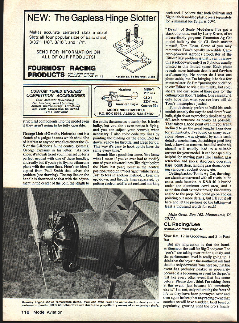 I KNEW wrote should have kept big mouth shut am good thing going have open up yap spoil whole thing probably wonder what about Well Ill tell sad tale couple issues back wrote about success last year flying Goodyears contests around country Some pretty good times few wins some contests related running small-crank Rossi preferred later larger crank versions time ever broken Well might well have gone out shop taken hammer engine because destiny upon soon issue hit stand Thats right guessed next contest blew up Rossi Went Southwestern Regionals Buckeye Arizona really did number rod gall crank pin causing rod lock tight crank sudden stop caused crank break directly front crank web Oh hurt shoulda known should have suspected Damn.. 1/16 PLYWOOD NOSE DOUBLER /8 PLYWOOD \\ B Ox STRUT 4-40 BOLT BLIND NUT 1/64 PLYWOOD FUSELAGE SKIN 3/B SO MOTOR MOUNT GOODYEAR LANDING GEAR CONSTRUCTION CROSS SECTION THRU GEAR MOUNT Speaking Buckeye thats long way Houston live trip really worth couple other crazies wanted go too piled car drove 1200 miles out desert going fly AMA events Rat Slow Rat Good year others Larry Miller Corpus Christi got urge take along something try attempt special local events widely flown Southwest events Arizona Con trol Line Association ACLA Slow Rat ACLA Slow Proto speed Southwest Control Line Association Big Goodyear lot fun Ill touch special rules ACLA Slow Rat Planes profiles minimum 300 sq wing must have least one-wheel gear have no minimum wing thickness rules Engines 40s smaller running suction 1 -oz maximum fuel tank capacity fly 015 ontrol lines Races standard 70/140 laps style AMAers fly no required pit stops ACLA Slow Proto speed same rules apply Slow Rat purpose event achieve maximum speed measured mile 14 laps standing start SWCLA Big Goodyean purpose event provide place competitive entrant can completely sup plied average local hobby shop end event requires kit airplanes production 35s Two-ounce maxi mum fuel capacity no shut-offs hot gloves quick fills other trick racing stuff require two-wheel gear everything racing Buckeye very good highly competitive special events highly developed AMA classes really expected since AMA events flown nearly people area local events Big Goodyear big no pun event right now 27 entrants com paredtoll inAMASlowRat l4inACLA Continued page 118 June1979 45 [ma POOT mat rest IIOT nas nave nis special secret Darrell Albert flashing really fine looking Class Mouse Racer built flown Bob Kampman Orangevale bunny Merced Contest California seen recent Merced Speed Racing Contest CUSTOM TUNED ENGINESHazaiflUtMBH-1 COMPETITION ACCESSORIEScso-i 22A ws Ku slam Kraflsmanship Brochureo American Eagle catalog 25c Box 2699 Laguna Hills CA 92653 ERNISTIC MODELS 714 830-5162PO_BOX 6974 ALBUD NM 87197 structural components model arent going fully operable George Lieb Omaha Nebraska sent sketch gadget uses should interest anyone flies either G S J-Roberts 3-line control systems George explains letter As know its tough get lines set up perfect neutral handles really bad try fly plane same lines Heres idea copied Paul Smith solves problem see drawing top line handle shortened adjust ment center bolt length end same used looks bulky dont notice flying can adjust controls necessary also color code lines painting binding ends Red down yellow throttle green up way its easy hook up lines same time Sounds like goad idea know what mean youve ever modify elevator lines like right before Nats last year because neutral position just didnt feel right flying Just toss another method keep up down throttle lines separated putting different reel marking reel believe both Sullivan Sig sell molded plastic reels separately minimal fee Sigs 50e Dean Scale Modelers Ive got stack photos sent Larry Kruse indescribably gorgeous Grumman Ag-Cat model built old CL Scale master himself Tom Dean Some may remember Toms equally incredible Cam eron-powered Aeronca cropduster Fifties problem cant narrow stack down 2 3 photos usually printed limited space photo reveals intricate details flawless craftsmanship No sooner cast photo aside Im bringing back few minutes later So Im passing buck Editor wield mighty cold shears cast some pics cutting roam floor Editor casualty hope what see will Toms masterpiece justice Tom obviously prefers build scale models exactly way real aircraft built right down precisely duplicating full-scale structure nearly possible raises goad point arent inclined go great lengths Tom does authenticity Ive found occa sions stymied some scale detail mechanism taking good long look area handled big aircraft will usually lead suitable answer model can especially helpful moving parts like landing gear retraction shock absorbers operating flaps bomb drop landing gear doors open ing canopies cockpit doors etc Getting back Toms Ag-Cat wings aluminum covered rivets exact scale location K&B 40 buried under aluminum cowl area extension shaft extends through dummy engine prop could go on pointing out details Ill cut off let pictures talkingat least thousand words Mike Gretz Box 162 Montezuma IA 50171 CL Racing/Lee continued page 45 Slow Rat 12 Goodyear 5 Fast Rat impression hand writing wall Big Goodyear pros taking over rather quickly performance level really going up think boys southwest will find its downhill event has probably peaked popularity because becoming event pros just like other event has come before Please dont think Im taking shots event just because its somebody elses Im reiterating facts life have portrayed over over again before racing event catches will have sudden brief burst popularity growing until pros finally 118 Model Aviation NEW The Gapless Hinge Slotter Makes accurate centered slots snap Slots four popular sizes balsa sheet 3/32 1/8 3/16 1/4 SEND FOR INFORMATION ON ALL OF OUR PRODUCTS FOURMOST RACING PRODUCTS 4040 24th AvenueRetail $195 includes blade Forest Grove OR 97116 Dummy engine shows remarkable detail can read name iacabs cmeariy rockerarm panels K&B 