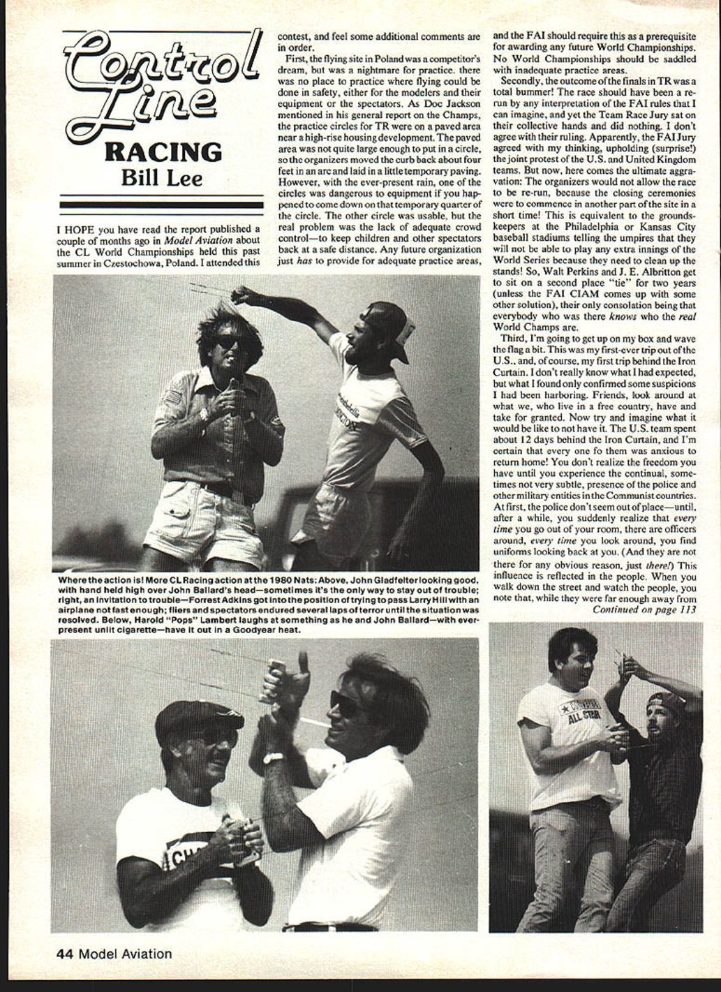 C RACING Bill Lee HOPE have read report published couple months ago Model Aviation about CL World Championships held past summer Czestochowa Poland attended contest feel some additional comments order First flying site Poland competitors dream nightmare practice no place practice flying could done safety either modelers equipment spectators As Doc Jackson mentioned general report Champs practice circles TR paved area near high-rise housing development paved area quite large enough put circle organizers moved curb back about four feet arc laid little temporary paving However ever-present rain circles dangerous equipment hap pened come down temporary quarter circle other circle usable real problem lack adequate crowd controlto keep children other spectators back safe distance Any future organization just has provide adequate practice areas FM should require prerequisite awarding future World Championships No World Championships should saddled inadequate practice areas Secondly outcome finals TR total bummer race should have re run interpretation FAI rules can imagine yet Team Race Jury sat collective hands did nothing dont agree ruling Apparently FM Jury agreed thinking upholding surprise joint protest US United Kingdom teams now comes ultimate aggra vation organizers would allow race re-run because closing ceremonies commence another part site short time equivalent grounds keepers Philadelphia Kansas City baseball stadiums telling umpires will able play extra innings World Series because need clean up stands So Walt Perkins J E Albritton get sit second place tie two years unless FAI ClAM comes up some other solution consolation being everybody knows real World Champs Third Im going get up box wave flag bit first-ever trip Out US course first trip behind Iron Curtain dont really know what expected what found confirmed some suspicions harboring Friends look around what live free country have take granted Now try imagine what would like have US team spent about 12 days behind Iron Curtain Im certain fo anxious return home dont realize freedom have until experience continual some times very subtle presence police other military entities Communist countries first police dont seem out placeuntil after suddenly realize time go out room officers around time look around find uniforms looking back obvious reason just influence reflected people walk down street watch people note far enough away Continued page 113 44 Model Aviation wnere Irle acilun Iviore L iacng eiion ai 1980 Nats Above John Gladfelter looking good hand held high over John Ballards headsometimes its way stay out trouble right invitation troubleForrest Adkins got position trying pass Larry Hill airplane fast enough fliers spectators endured several laps terror until situation resolved Below Harold Pops Lambert laughs something John Ballardwith ever present minhit tiGrAttAhrnA nut ar hant AMAMJ MAS ENTERPRISESN NATIONAL CHAMPION LISTS IN 1979-1980 SPE M I&k Proudly HeadsRC HELICOPTERS MJ MAS ENTERPRISES now offering totally new seroice helicopter enthasiast Oct-stop shopping veer R/C Helicopter needs regardless what yovre flying discoutt prices also offering free set-up flying inasraction yours askistg have bails flown analyzed major brand Helicopter aneil able Ovr staff qoalified answer questions ranging installing train ing gear flying yovr ship invertod j Custom-built Helicopters leclade year choice Helicopter Eng Radio Test Flown Limited Oasis AMERICAN R/C HELICOPTERS PINE LINE OP HELICOPTERS COMMANDER Engine-off Landing LIST $38005 SPECIAL $32500 AMERICAN RIC HELICOPTER REVOLUTION II 60 SIZE LIST $33005 SPECIAL $27995 MANTIS 40 POWERED HELICOPTER LIST $14005CALL FOR PACKAGE DEAL 0HDQUARTERs SCHLUTER HELl BOY 60 Size Reg $39005ONLY $34995 Schluger Helicopter Puns Stock Including Pipes Puselages Etc HELl-BOY MAIN ROTOR BLADES Pare oc 881Only $1985 151tj ,System 80 CARRYING THE Nrshs LINE OF FINE HELICOPTERS MODEL 505 MODEL 707 CALL FOR OUR LOW PRICES INSTRUCTIONAL TAPES NOW AVAILABLE Ouilding Trimming Plying Contest Flying Nosice Expert Autorotations seaup/Practice Aerobatics/lnverted Plight NEW PROM WORLD ENGINES. ZENITH 40 POWERED HELICOPTER 5 HOUR CONSTRUCTION List $23005 SPECIAL Only $16995 Price Includes Extra Set Main Rotor Tail Rotor Blades provided Poland 1980 judge went far say Could judge recorder find difficult believe must have marvelous memory FM Sporting Code section 4213 states judge will provided secretary What call athletics home cooking prevailed Championships time Jury ruled no secretaries recorders provided lets remem ber World Championships Ill bet judges RC Pattern World Championships recorders last least come rule USA has trying get removed years Section 4211 must signal start maneuver raising arm least circuit rule goes back years judges really certain what maneuver what controlled crashing just no need signal before maneuver competence competitors Precision Aerobatics such everyone can perform complete pattern probably 20 25 competitors could qualify arm signals just needed conclude order make finals fair 15 competitors no qualifying scores should carried over finals should consist best two scores out three official flights ClAM should make certain country hosts World Championships lip service given rule adequate practice area being allotted competitors Judges should have recorders difficult FAI-type scoring hand signal before maneuver should dropped information Precision Aerobatics PAMPA write Wynn Paul 1640 Maywick Drive Lexington KY 40504 CL Scale/Gretz Continued page 43 coverage taken Dave Falkenhagen Jeff Foley Mike Gretz Mike Gretz Box 162 Montezuma IA 50171 CL Racing/Lee Continued page 44 would looking trying see what crazy people strange sporting uniforms got close eyes would always cast away eye contact recognition avoided Sad whole concept always doing best uthorizeci Dcdio 0I ~ontr ervice FACTOR Y UTHORIZED SER V/CE FOR ALL OF THE FOLLOWING BRA NDS Ace Aero Sport Cannon Cirrus Krafte World Engin