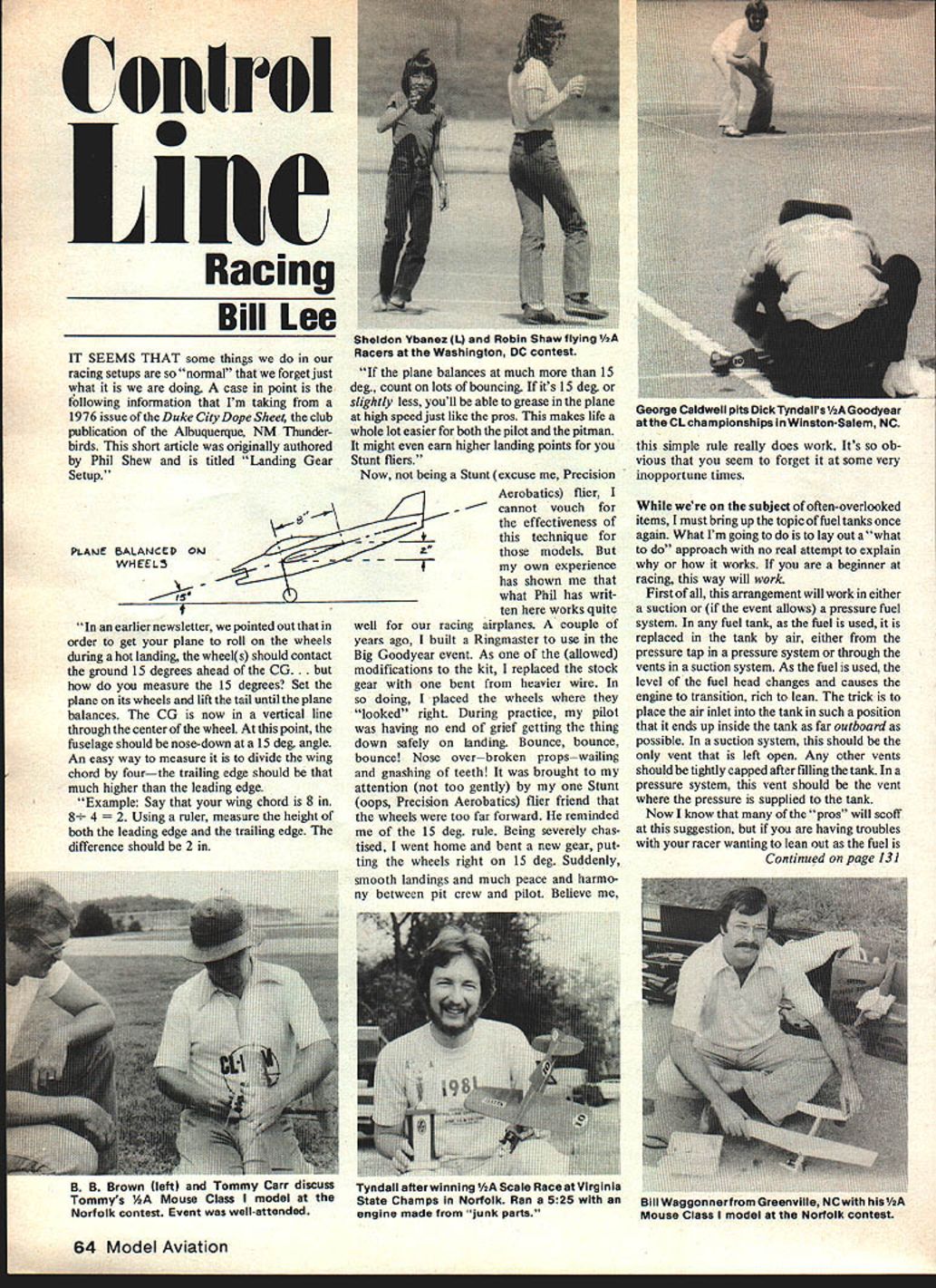 Control JIM Racing Bill Lee IT SEEMS THAT some things racing setups normal forget just what doing case point fillowing information Im taking 1976 issue Duke City Dope Shee4 club publication Albuquerque NM Thun&r birds short article originally authored Phil Shew titled Landing Gear Setup ~-PLAJE BALAI4CD OIJ WHEEL5 earlier newsletter pointed out order get plane roll wheels during hot landing wheels should contact ground 15 degrees ahead CG sure 15 degrees Set plane its wheels lift tail until plane balances CG now vertical line through center wheeL point fuselage should nose-down 15 deg angle An easy way measure divide wing chord fourthe trailing edge should much higher leading edge Example Say wing chord 8 8 4 ing ruler measure height both leading edge trailing edge difference should 2 plane balances much 15 deg count lots bouncing its 15 deg slightly less youll able grease plane high speed just like pros makes life whole lot easier both pilot pitman might earn higher landing points Stunt fliers Now being Stunt excuse Precision Aerobatics flier cannot vouch effectiveness technique models own experience has shown what Phil has writ ten works quite well racing airplanes couple years ago built Ringmaster use Big Goodyear event As allowed modifications kit replaced stock gear bent heavier wire doing placed wheels looked right During practice pilot having no end grief getting thing down safely landing Bounce bounce bounce Nose overbroken propswailing gnashing teeth brought attention too gently Stunt oops Precision Aerobatics flier friend wheels too far forward reminded 15 deg rule Being severely chas tised went home bent new gear put ting wheels right 15 deg Suddenly smooth landings much peace harmo ny between pit crew pilot Believe simple rule really does work Its ob vious seem forget some very inopportune times subject often-overlooked items must bring up topic fuel tanks once again What Im going to lay out what approach no real attempt explain works beginner racing way will work First arrangement will work either suction event allows pressure fuel system fuel tank fuel used replaced tank air either pressure tap pressure system through vents suction system As fuel used level fuel head changes causes engine transition rich lean trick place air inlet tank such position ends up inside tank far outboard possible suction system should vent left open Any other vents should tightly capped after filling tank pressure system vent should vent pressure supplied tank Now know pros will scoff suggestion having troubles racer wanting lean out fuel Continued page 131 64 Model Aviation Sheldon Ybanez 1 Robin Shaw flying /2A Racers Washington DC contest George Caidweil pits DickTyndallsA Goodyear CL championships Winston-Salem NC IL n tmenj ana mommy .arr discuss Tommys Y2A Mouse Class model Norfolk contest Event well-attended Tyndall after winning /2A Scale Race St Virginia State Champs Norfolk Ran 525 Bill Waggonnerirom Greenville NCwithhis1/2A engine made junk parts Mouse Class model Norfolk contest Detroit area good fortune having prototype available can duplicate its detail ing model took over seven years build obviously has quality would expect investment much time hope able observe person sometime Looking 3-views Mr Steve Ashby 1548 Sedlak Court Indianapolis IN 46229 look ing 3-views MU-2 stretched fuselage version anybody knows whereabouts availability 3-view please contact Steve directly Richard P Byron 2506 So 16 1st Circle Omahn Nebraska 68130 CL Racing/Lee Continued page 64 used give suggestion try might surprised difference some pros might want try TR info Heres interesting view engine cooling related items TR Im borrow ing Walt Perkins father Gator Tales driving force behind Shadow Racing want stuff firsthand instead late contact Walt get mailing list Engine cooling has popular topic year seems magic clearance di mension between cylinder cooling duct. no quite sure what have opinion Sure s criticall three years have using molded cooling ducts assembled right engine cylinder largest cylinder own couple layers cellophane tape wrapped around After model flown can always find evidence cylinder touching duct somewhere. dont care duct has standard geometry -in wide entry 7/16in wide exit can easily reproduced balsa Weve used same model record approximately same times 45 deg weather Poland 110 deg weatherTexas doesnt matter use aiuminum case magnesium case short dont won-y much about cylinder cooling opinion lot problems people blaming engine bad cooling actually caused something else illustrate two case histories modeler wrote couldnt get mag engine run well same day aluminum case engine Well cant either swap engines e adjust tank position counteract change center gravity caused lighter motor Some people will argue model flies same angle tangentially regardless CG position can tell have make tank adjust ment change engines Another modeler wrote mag engine went like gangbusters early English spring couldnt get Out its own way summer heat Instead looking improved cylinder cooling suggested consider better crankcase cooling Magnesium titanium have vastly different coefficients thermal expansion sounded cold air spring providing enough cooling keep bearings happy warmer weather havent heard back modeler yet what thought suggestion could wrong thats what experience has shown us dirty motor will also make think have other problems team West Coast FEATURES INCLUDE Space battery & meter panel Transmitter compartment Room gallon fuel PO Box 112 ATTENTION ERS FLIGHTBOX KIT Master Airscrew Flight Box has features larger boxes compact handy arrangement parts cut imported mahogany plywood will take stain varnish paint finishes overall size 19Y2x 9Y2x 12 high 495 dealer $3 postpaid California add 6% Sales Tax Propeller storage Gravity closed small parts storage 7/8 aluminum handle Complete instructions & fasteners Windsor CA 95492 WINDSOR PROPELLER CO 1/4 Scale World War WWI SE5.A KN#RCQS-7 Plan Set $2495 SOY Wing