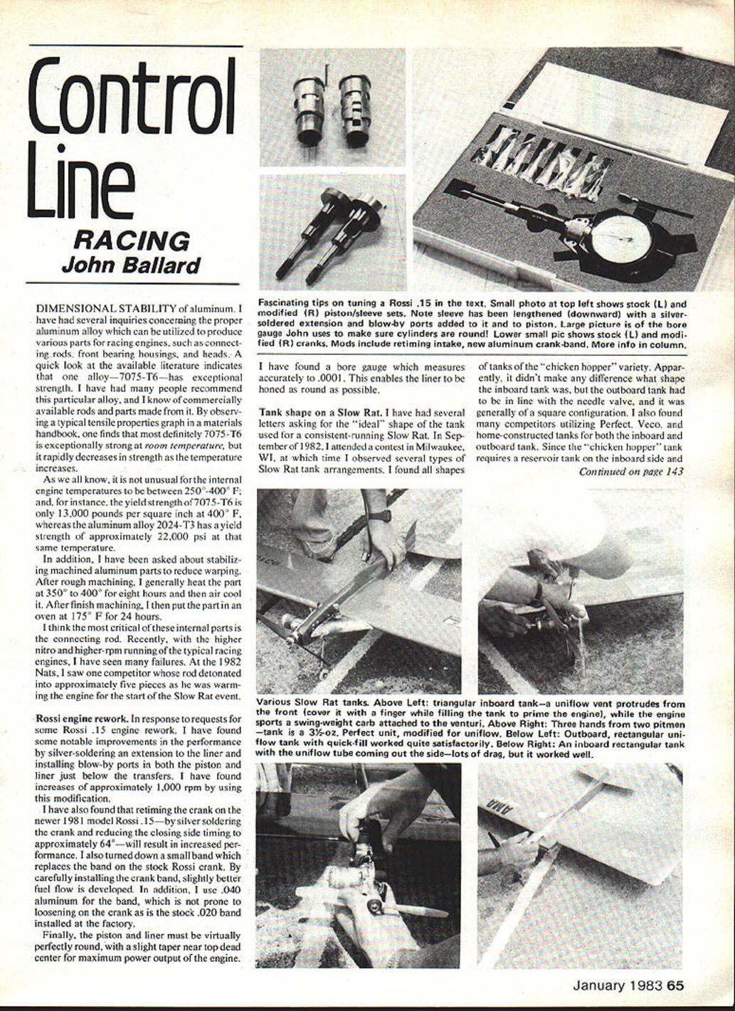 Control Line RA CING John Ballard DIMENSIONAL STABILITY aluminum have several inquiries concerning proper aluminum alloy can utilized produce various parts racing engines such connect ingrods front hearing housings heads quick look available literature indicates alloy7075-T6has exceptional strength have people recommend particular alloy know commercially available rods parts made observ ing typical tensile properties graph materials handbook finds definitely 7075-T6 exceptionally strong room temperature rapidly decreases strength temperature increases As know unusual intemal engine temperatures between 25004000 F instance yield strength of7075-T6 13000 pounds per square inch 4000 F whereas aluminum alloy 2024-T3 has yield strength approximately 22000 psi same temperature addition have asked about stabiliz ing machined aluminum parts reduce warping After rough machining generally heat part 3500 4000 eight hours air cool After finish machining put part oven 1750 F 24 hours think critical intemal parts connecting rod Recently higher nitro higher-rpm running typical racing engines have seen failures 1982 Nats saw competitor rod detonated approximately five pieces warm ing engine start Slow Rat event Rossi engine rework response requests some Rossi 15 engine rework have found some notable improvements performance silver-soldering extension liner installing blow-by ports both piston liner just below transfers have found increases approximately 1000 rpm using modification have also found retiming crank newer 1981 model Rossi 1 5by silver soldering crank reducing closing side timing approximately 640—will result increased per formance also turned down small band replaces band stock Rossi crank carefully installing crank band slightly better fuel flow developed addition use 040 aluminum band prone loosening crank stock 020 band installed factory Finally piston liner must virtually perfectly round slight taper near top dead center maximum power output engine have found bore gauge measures accurately 0001 enables liner honed round possible Tank shape Slow Rat have several letters asking ideaF shape tank used consistent-running Slow Rat Sep tember 19821 attended contest Milwaukee WI time observed several types Slow Rat tank arrangements found shapes tanks chicken hopper variety Appar ently didnt make difference what shape inboard tank outboard tank line needle valve generally square contiguration also found competitors utilizing Perfect Veco home-constructed tanks both inboard outboard tank Since chicken hopper tank requires reservoir tank inboard side Continued page 143 January 1983 65 Fascinating tips tuning Rossi 15 text Small photo top left shows stock LI modified RI piston/sleeve sets Note sleeve has lengthened downwardl silversoldered extension blow-by ports added to piston Large picture bore gauge John uses make sure cylinders roundl Lower small pic shows stock LI modi fied RI cranks Mods include retiming intake new aluminum crankband info column Various Slow Rat tanks Above Left triangular inboard tanka uniflow vent protrudes front cover finger filling tank prime enginel engine sports swing-weight carb attached venturi Above Right Three hands two pitmen tank 3%-az Perfect unit modified uniflow Below Left Outboard rectangular uni flow tank quick-fill worked quite satisfactorily Below Right An inboard rectangular tank uniflow tube coming out sidelots drag worked well MASIER AIRSC1IIW PRESENTS BALSA STRIPPER A95 9AT YOUR DEALER PRECISION STRIP WOOD TO x INS FROM BALSA SHEET ALSO FOR DRAFTING AND PHOTO MATS USES TYPE II BLADE SUPER TOOL GREAT PRICE WINDSOR PROPELLER CO 384 Tesconi Ct. Santa Rosa CA 95401 W4AGEMENT AR 39 USC 3655 TION Tsuda and course whole bunch incisive cartoons Will Nakashima put perspective come NFFS Hall Fame awards Ten Model Year awards followed compilation who-won-whatLEADER IN SMALL AIRFOIL TECHNOLOGY MASTER AIRSCREW M3SWV bLSb6V RAASTER AIR IMPROVED THROUGH FOUR YEARS OF PRODUCTION THE G/F SERIES IS UNEQUALED FOR PERFORMANCE & DURABILITY AVAILABLE WORLDWIDE THROUGH 131 DISTRIBUTORS 384 Tesconi Ct and-when going back year indexes previous Sympo reports Wrap-up list NFFS Plans Publications unfortun ately current Order report Fred Terzian 4858 Moorpark Ave San Jose CA 95129 Price $10 NFFS members purchasers outside USA $11 others Postage $2 Fourth Class $3 Air Mail Canada Mexico $5 Air Mail Europe $6 Air Mail Far East wonder means like Detroit Bob Meuser 4200 Gregory St Oakland CA 94619 CL Racing/Ballard Continued page 65 feed tank outboard side profile fuselage tank choice competitors utilizes Uniflo principle majority tanks rectangular shape installed inboard side fuselage flier utilizes swing weight needle valve minimize transition between takeoff terminal air speed 1982 Rules Proposals have recently received some mail competitors concerning some proposed rule changes certainly has some merit 0%-nitro rule Editors note proposal No CL-84-22 See De cembers Competition Newsletter rules pro posal summaries RMcM would limit available nitro content Slow Rat event 10% nitro would furnished Contest Director competitor would assessed small fee cover fuel cost think WINDSOR PROPELLER CO Santa Rosa CA 95401 competitors Slow Rat using about 50-60% nitro fuelwhich certainly causes fuel consumption particular event excessive good 20% fuel used spilled ground filling tank during numerous test starts initial start three pit stops required feature 140-lap race two pit stops required 70-lap qualifying heats would like hear views 10% nitro rule John C Ballard 10102 Kimblewick Dr Louisville KY 40223 AMA Building/Mankowski Continued page 53 kay RC Modelers Camarillo Flying Circus Fresno Radio Modelers Anthony Novak James Thornberry Evansville RC Model Airplane Club Renewal message another opportuni ty help Building Fund AMA renewal forms sent 1982 member has place add contribution drive hope everyone uses because everyone gave just $10 building could paid off completely Its important renew