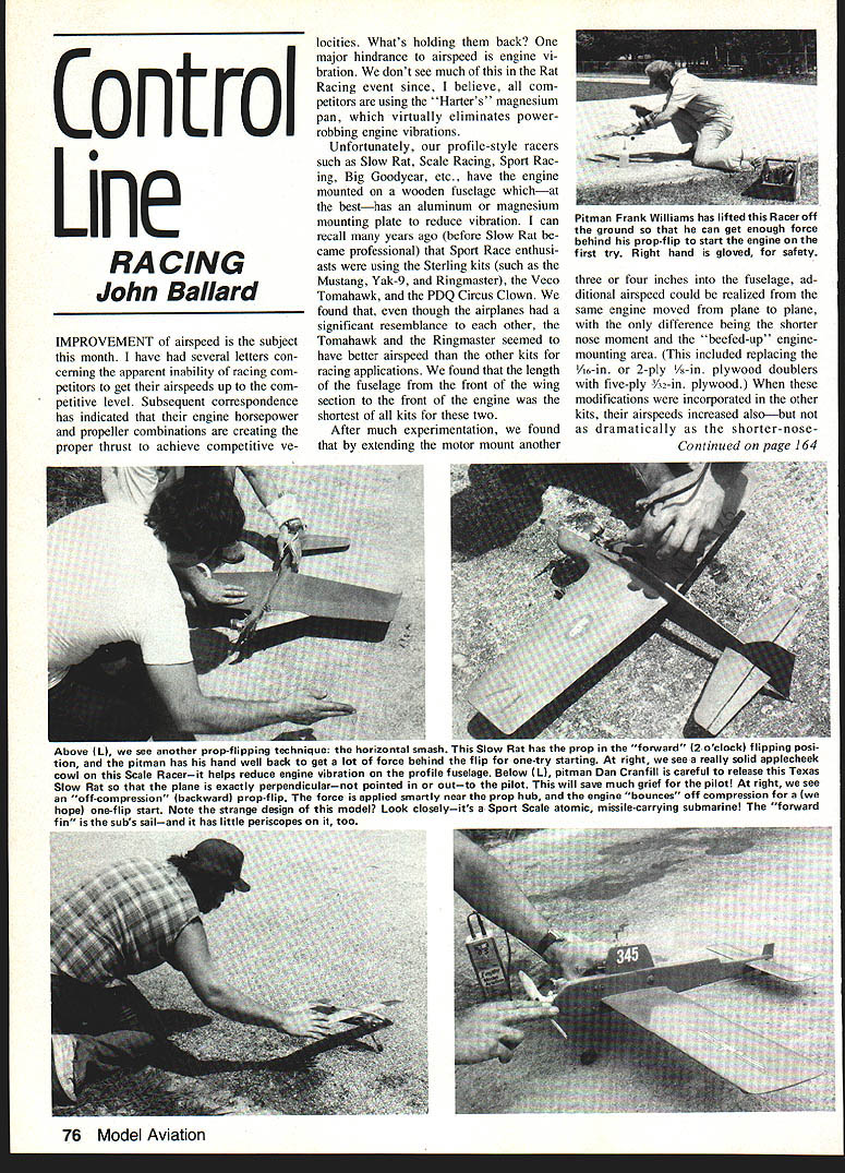 Control Line RA CING John Ballard IMPROVEMENT airspeed subject month have several letters con cerning apparent inability racing com petitors get airspeeds up corn petitive level Subsequent correspondence has indicated engine horsepower propeller combinations creating proper thrust achieve competitive yelocities Whats holding back major hindrance airspeed engine vi bration dont see much Rat Racing event since believe com petitors using Harters magnesium pan virtually eliminates powerrobbing engine vibrations Unfortunately profile-style racers such Slow Rat Scale Racing Sport Rac ing Big Goodyear etc have engine mounted wooden fuselage whichat besthas aluminum magnesium mounting plate reduce vibration can recall years ago before Slow Rat came professional Sport Race enthusi asts using Sterling kits such Mustang Yak-9 Ringmaster Veco Tomahawk PDQ Circus Clown found though airplanes significant resemblance other Tomahawk Ringmaster seemed have better airspeed other kits racing applications found length fuselage front wing section front engine shortest kits two After much experimentation found extending motor mount another three four inches fuselage ad ditional airspeed could realized same engine moved plane plane difference being shorter nose moment beefed-up enginemounting area included replacing A6-in 2-ply Vt-in plywood doublers five-ply 3¼2-in plywood modifications incorporated other kits airspeeds increased alsobut dramatically shorter-noseContinued page 164 Above LI see anotner prop-nipping technique horizontal smash Slow Rat has prop toiward 12 oclockl hipping posi tion pitman has hand well back get lot force behind flip one-try starting right see really solid applecheek cowl Scale Racerit helps reduce engine vibration profile fuselage Below L pitman Dan Cranfill careful release Texas Slow Rat plane exactly perpendicularnot pointed outto pilot will save much grief pilot right see off-compression backward prop-flip force applied smartly near prop hub engine bounces off compression hope one-flip start Note strange design model Look closelyits Sport Scale atomic missile-carrying submarine forward fin subs sailand ha little nericoDes too 76 Model Aviation Pitman Frank Williams has lifted Racer off ground can get enough force behind prop-flip start engine first try Right hand gloved safety Hi Im ART GROSS know some have wondering WHAT IN HELL IS WEDGE LOCK Well will tell hand sanding block made out HIGH IMPACT STYREMEIF IT EVER BREAKS WE WILL REPLACE IT FREE uses belts same size 3x18 Electric Hand Sanders might ask WHY use expensive belts instead using cheaper sandpaper block sanding WHY BECAUSE BELTS ARE MORE DEPENDABLE ECONOMICAL DURABLE AND EASIER TO USE glueing tacking clamping pieces sandpaper other block BELT WILL NOT SLIP WRINKLE OR TEAR CAUSING THE MARKING AND GOUGING OF YOUR FINISHED WORK 1-RESIN BONDED BELT WILL GIVE YOU AT LESS COST MORE TROUBLE FREE SANDING THAN 10 sheets regular sandpaper sandpaper sanding block can waste up 440/0 its sandpaper just fasten itself block BELTS ARE EASILY CHANGED THEY ARE PUT ON AND TAKEN OFF BLOCK WITHOUT DAMAGE SO THEY ARE REUSABLE FOR MANY JOBS SINCE THE BELT IS SO EASILY CHANGED IN SECONDS YOU PICK THE RIGHT BELT TYPE & GRIT SIZE TO MAKE YOUR SANDING JOB EASIER WE THINK THE WEDGE LOCK SANDING BLOCK IS THE BEST YOU CAN BUY BUT WE ALSO KNOW SINCE YOU HAVE NOT USED ONE YOU MIGHT NOT AGREE WE WILL PUT OUR MONEY WHERE OUR MOUTH IS GET ONE AND USE IT AND THEN IF YOU DO NOT AGREE WITH US AND WANT YOUR MONEY BACK WE WILL BE HAPPY TO GIVE IT BACK TO YOU MODELERS ASK YOUR HOBBY SHOP FOR WEDGE LOCK HOBBY SHOP DEALERS ASK YOUR DISTRIBUTORS FOR IT DISTR ART GROSS ENTERPRISES 206 743-9332 $1000 COUPON SPECIAL $1000 Please fill out coupon mailing label circle 3 extra RESIN BONDED BELTS want will send prepaid 1-WEDGE LOCK SANDING BLOCK comes 80 grit cloth belt & 3 RESIN BONDED REPLACEMENT BELTS THIS IS $1400 value $1000 BLOCK -$600 s @ 0200 -- postageS haedlirsg $1400 $1000 COUPON SPECIAL $1000 BELTS ALUMINUM OXIDE 80-100-1 20-1 50-1 80-220 SILCON CARBIDE 220-280-360-400 FROM ART GROSS ENTERPRISES206 743-9332 12516 MAPLEWOOD AVE EDMONDS WA 98020 touch-and-go taxi engine shutoff bomb tank drop flaps Flight QualificationsModel must come airborne within three minutes start prop flipping Three attempts will given make two official flights An ad ditional minute starting time will allowed additional engine bonus 10 points will given getting air borne minute single-engine mod els within two minutes twin-engine models additional minute allowed additional engine multi-engine models will receive extra 10 points engines remain running through 10 qual ifying laps Maximum score can achieved static flight would 250 Flying Line Safety Requirements same listed AMA rule book scale models weighing up 8 lb George Bill go say reason came up own set rules profile event twofold GSCBs multi-interest CL club heavy terest Stunt sport flying Scale Carrier run close second Scale mod elers club thought type event would make good starting point modelers interested Scale and/or Stunt hesitant construct full-bodied model time As can see GSCB rules thing quite simple point Items such I-in-thick-maximum fuselage up 10 flying options would satisfy sport competitive fliers regardless primary CL interest bonus multi-engine fanatic will also note static judging distance 10 ft felt greater viewing distance would less effective judg ing standpoint because general size available profile models speaking availability pro file models small list readily available several manufac turers MidwestP -40 erschmitt Aira cobra SterlingYAK-9 P-38 P-5l GoldbergP-40 Buster Cosmic Wind Shoestring cant find model build among available might time try efforts designing building own Profile George Bill conclude thoughts Profile Scale hope GSCB event will interest other clubs will some small way help promote Scale activity 1984 event held first time GSCBs annual Teterboro NJ Scale Model Flying Show last September 198