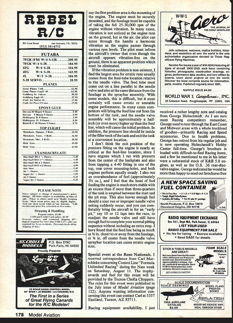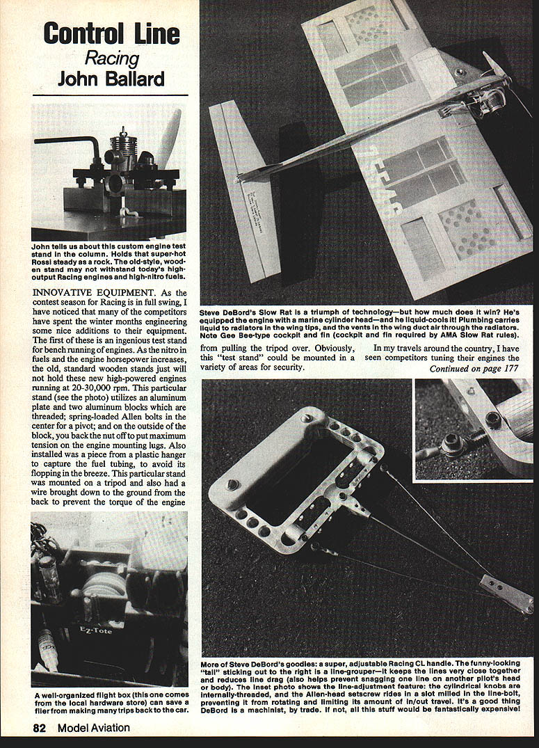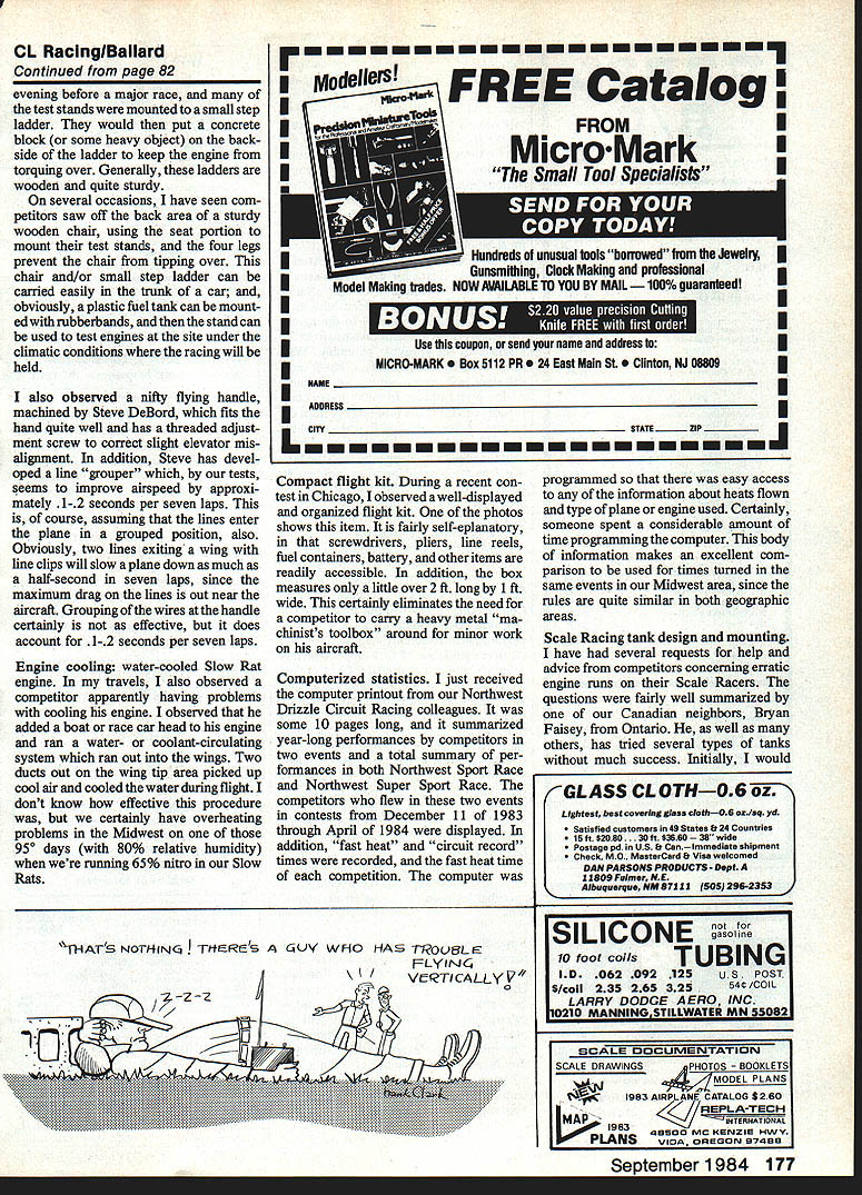 Contml Line Racing John Ballard John tells us about custom engine test stand column Holds superhot Rossi steady rock old-style wood en stand may withstand todays highoutput Racing engines high-nitro fuels INNOVATiVE EQUIPMENT As contest season Racing full swing have noticed competitors have spent winter months engineering some nice additions equipment first ingenious test stand bench running engines As nitro fuels engine horsepower increases old standard wooden stands just will hold new high-powered engines running 20-30000 rpm particular stand see photo utilizes aluminum plate two aluminum blocks threaded spring-loaded Allen bolts center pivot outside block back nut off put maximum tension engine mounting lugs Also installed piece plastic hanger capture fuel tubing avoid its flopping breeze particular stand mounted tripod also wire brought down ground back prevent torque engine well-organized flight box comes local hardware store can save fllerfrom making manytrips backtothe car pulling tripod over ObviouslyIn travels around country have test stand could mounted aseen competitors tuning engines variety areas securityContinued page 177 82 Model Aviation Steve DeBords Slow Rat triumph technologybut much does win Hes equipped engine marine cylinder headand liquid-cools Plumbing carries ilquid radiators wing tips vents wing duct air through radiators Note Gee Bee-type cockpit fin cockpit fin required AMA Slow Rat rules Steve DeBords goodies super adjustable Racing CL handle Tunny-lOOKIng tail sticking out right line-grouperit keeps lines very close together reduces line drag also helps prevent snagging line another pilots head body inset photo shows line-adjustment feature cylindrical knobs internally-threaded Allen-head setscrew rides slot milled line-bolt preventing rotating limiting its amount in/out travel its good thing Deflord machinist trade stuff would fantastically expensive CL RacinglBaflar Continued page 82 evening before major race test stands mounted small step ladder would put concrete block some heavy object back side ladder keep engine torquing over Generally ladders wooden quite sturdy several occasions have seen com petitors saw off back area sturdy wooden chair using seat portion mount test stands four legs prevent chair tipping over chair and/or small step ladder can carried easily trunk car obviously plastic fuel tank can mount edwithrubberbands andthen stand can used test engines site under climatic conditions racing will held also observed nifty flying handle machined Steve DeBord fits hand quite well has threaded adjust ment screw oorruct slight elevator mis alignment addition Steve has devel oped line grouper~ tests seems improve airspeed approxi mately seconds per seven laps course assuming lines enter plane grouped position also Obviously two lines exiting wing line clips will slow plane down much half-second seven laps since maximum drag lines out near aircraft Grouping wires handle certainly effective does account seoonds per seven laps Engine cooling water-cooled Slow Rat engine travels also observed oompetitor apparently having problems cooling engine observed added boat race car head engine ran water- coolant-circulating system ran out wings Two ducts out wing tip area picked up cool air cooled water during flight dont know effective procedure certainly have overheating problems Midwest 950 days 80% relative humidity running 65% nitro Slow Rats ~i1}4AT1S NOTI-fINcE TIfR& rmrnrnrnrnrnI Mode~s1 FRCatalog U IEE II II II Hundreds unusual tools borrowed Jewelry UGunsmithing Clock Making professional model Making trades NOW AVAILABLE TO YOU BY MAIL guaranteed l LL Use coupon send name address MICRO-MARK Box 5112 PR 24 East Main St. Clinton NJ 06809 FlAME EADDRESS CflY_________________________ STATEZIPJ Compact flight kit During recent con test Chicago observed well-displayed organized flight kit photos shows item fairly self-eplanatory screwdrivers pliers line reels fuel containers battery other items readily accessible addition box measures little over 2 ft long 1 ft wide certainly eliminates need competitor carry heavy metal ma chinists toolbox around minor work aircraft Computerized statistics just received computer printout Northwest Drizzle Circuit Racing oolleagues some 10 pages long summarized year-long performances competitors two events total summary per formances both Northwest Sport Race Northwest Super Sport Race competitors flew two events contests December 11 1983 through April 1984 displayed addition fast heat circuit record times recorded fast heat time competition computer iUY WHO HAS T1OVffL FLYINc VATICALLY V 0 \ / atEAA. 1k . programmed easy access information about heats flown type plane engine used Certainly someone spent considerable amount time programming oomputer body information makes excellent com parison used times turned same events Midwest area since rules quite similar both geographic areas Scale Racing tank design mounting have several requests help advice competitors concerning erratic engine runs Scale Racers questions fairly well summarized Canadian neighbors Bryan Faisey Ontario well others has tried several types tanks much success Initially would GLASS CLOTHO6 oz Lightest best covering gLass clothOS os/sq yd Satisfied customers 49 States ft 24 Countries KDAN PARSONS PRODUCTS- Dept lSft$20S0. lOft$366035wlde Postage pd US ft CanImmediate shipment Check MO MeeterCard ft Visa welcomed 11809 Fuimer NE Albuquerque NM 87111 SOS 296-2353 September 1984 177 MROM icro Mark Small Tool Specialists SILICONE gasoline 10 foot coils TUBING V ID 062092125u s POST S/coil 235265325545/COIL LARRY DODGE AERO INC 0210 MANNINGSTILLWATER MN 55082 5CALE DOCUMENTATION SCALE DRAWINGSPHOTOS SOOKLETS EL PLANS 1983 AIRPLANE CATALOG $260 UTIANAtIONAL 198349900 MC KENZIE I-IWV SVIDA OREGON 97499 861 Isom RoadSan Antonio iX 78216 512 3416712 FUTABA 7FGK FM W/4 5-12820995 7FGK W/4 S-2818495 6FGW/4 S-2815495 4FGW/4 5-2814395 4LW/3 S-2810495 S-28 SERVO1895 PLAN