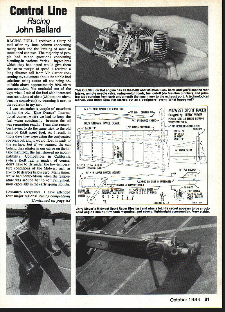 Contml Line Racing John Ballard RACING FUEL received flurry mail after June column concerning racing fuels limiting same sanctioned contests majority peo ple minor questions concerning blending-in various trick ingredients wllich heard would give extra margin speed received long distance call Vic Garner con cerning statement about stable fuel solutions using castor oil being ob tainable above approximately 30% nitro concentration Vic reminded days mixed fuel increased concentrations nitro nitro beuzine consolvent warming next radiator car can remember couple occasions during old King Orange Interna tional contest keep fuel warm continuallybecause oil separating readily can also remem ber having same trick old cans K&B speed fuel As recall days using conjugated soybean oil would float wads surface warmed can behind radiator car take manifold fuel showed no incom patibility Competitors California K&B fuel made course dont have fly under low-tempera ture conditions Midwest such five 10 degrees below zero times weve competitions temper ature around 400 450 Fahrenheit especially early spring months Low-ultro acceptance have attended four major regional Racing competitions Continued page 82 X BASS SPARS B LEADING EDGE TIP RIB CENTER RIB WOOD CHEEK RIBS SHOWN TWICE SCALE 1/16 BALSA SHEEIiNG BALSA liP Ti I I T ---I ---2% CD 4 116 X 1 BALSA OW TRAIUNG EDGE MIDWEST SPORT RACER Designed ti JERRY MEYER POWER KBB 35 SLEEVE-BEARING WiNGSPAN 34 IN PLY DOUBLER BOTh SIDES USE SHROD p TIP WEIGHT IN RIGHT WING TIP11 DSA /8 PLY RUDDER APLE MOTOR MOUNTS GLENN LEEGLENN LEE TITANIUMA HARD BALSA SHEETLA1/16 BALSA 1A RACINGLANDING GEAR STRUTFROM X 3 X 24 PIECE KCOVER GLUE IN Jerry Meyers Midwest Sport Racer f lies fast wins lot secret appears rocksolid engine mount firm tank mounting strong lightweight construction Very stable October 1984 81 0536 Slow Rat engine has aii beiis whistlesi Look hard youii see rear intake remote needie vaive ewing-weight carb fuei cutoff via fuel-line pincher prim ing tube running oarb underneath machInery exhaust port technological marvel Just think Slow Rat started out beginners event What happened Bolt-On Ball Link 3-piece ball link set readily adaptable linkage hook-ups Ball joint action eliminates binding Ball threaded 4-40 rod bolt Threaded coupler 3/4 long ~ 2-56 thread up 072 wire Self-threading nylon socket No 1801/pkg ivet Ball Link Ideal throttle hook-ups 4-piece ball link set permanent installation Includes 1 steel ball pin washer peening 1 self-threading nylon socket 1 threaded coupler 3/4 long 8 2-56 thread up 072 wire No 1821/pkg Ball Link Sockets Self-threading nylon ball link sockets switching radio another plane can keep same trim setting future flights leaving nylon links pushrods up 072 wire No 1884/pkg 1/16 Threaded Ball Link 4-piece set fits perfectly servo arm hole bellcranks nylon horns throttle arms Set includes 1 balI threaded 0-80 1/16 dia thrd 1 self-threading nylon socket 1 threaded coupler 3/4 long 1/16 ID 3/s 2-56 thread Ion 2-56 Threaded Ball Link 5-piece ball link set excellent off-set steering throttle servo hook-ups Ball threaded for2-S6nut Threaded coupler 3/4 8 2-56 thread up 072 wire Self-threading nylon socket washer 2-56 nut No 1811/pkg Aileron Connector Ball Link 5piece set includes 1 2-way selfthreading nylon socket 2 thr6aded couplers 3/4 long 6 2-56 thread up 072 wire 1 ball threaded 0-80 /16 dia thrd 1 0-80 nut No 1831/pkg Aileron Horn Wire Ball Links Change old strip aileron connectors ball link control Fitting also useful asdual take off connectors 8-piece set includes 2 horn wire ball links /32 dia wire 2 self-threading nylon sockets 2 threaded couplers 3/4 long /16 ID thread 2 4-40 screws No 1891/pkg Heavy Duty 4-40 Ball Link far summer utilized 10% nitro fuel racing events grumbling vocal disagreement 10% nitro ruleas well brand composition fuel sup plieshas quieted considerably Since competitors must run same gal lon jug basically have same problems positive thing 10% nitro fuel has done bring back few old engines dis carded set aside nitro went 60-70% range old K&B 405 Rat Race has made amazing come back engine seems perform ex tremely well l0o nitromuch better present high-tech high-nitro Rat engines Several competitors have found have able run Fox 15 Scale Racing find much competitive long nitro controlled 10% received largest sophisti cated written response after including Bill Lee s summary basic feelings majority Control Line Racing competi tors interspersed Bills personal opinions June issue several letters geographical areas Con trol Line Racing activity well letters Australia Canada majority agreement questioned sizable monetary investment 21 cu Rat engine average Racing competitor five Control Line Racing competi lions have attended highestparticipant event Midwest Sport Race very similar Southwest Sport Race Northwest Sport Race rules interpretation five contests no less 30 competitors entered Sport Race used myriad aircraft types assorted engine/tank combinations Recently particular design Sport Racer has turning some fantastic heat times sleevebearing K&B 35 engine 10% nitro three separate contests Jerry Meyers racer performed 14-15-seconds-perseven-laps speed range phenom enally faster majority other Sport Racers built-up wings and/or solid wings sanded airfoil shape secret Jerrys racer total aircraft lightweight extremely sturdy fuselage engine mounting area wing cross section inch thick its midpoint wing rigidity improved use two spars down center section tank Jerry uses merely Fox stunt tank overflow tube removed installed top tank directed airflow make tank uniflow Jerrys positioning wing has given just right amount fuselage area engine shutoff mounting tank fits comfortably overcrowding weakening Continued page 167 82 Model Aviation K heavy duty ball link perfect /4 scale application 5-piece kit includes 1 ball 4-40 thread 1 self threading 4-40 nyhi socket 1 4-40 stud 1 /32 ID brass 1 4-40 lock nut 1/ ec 238 point