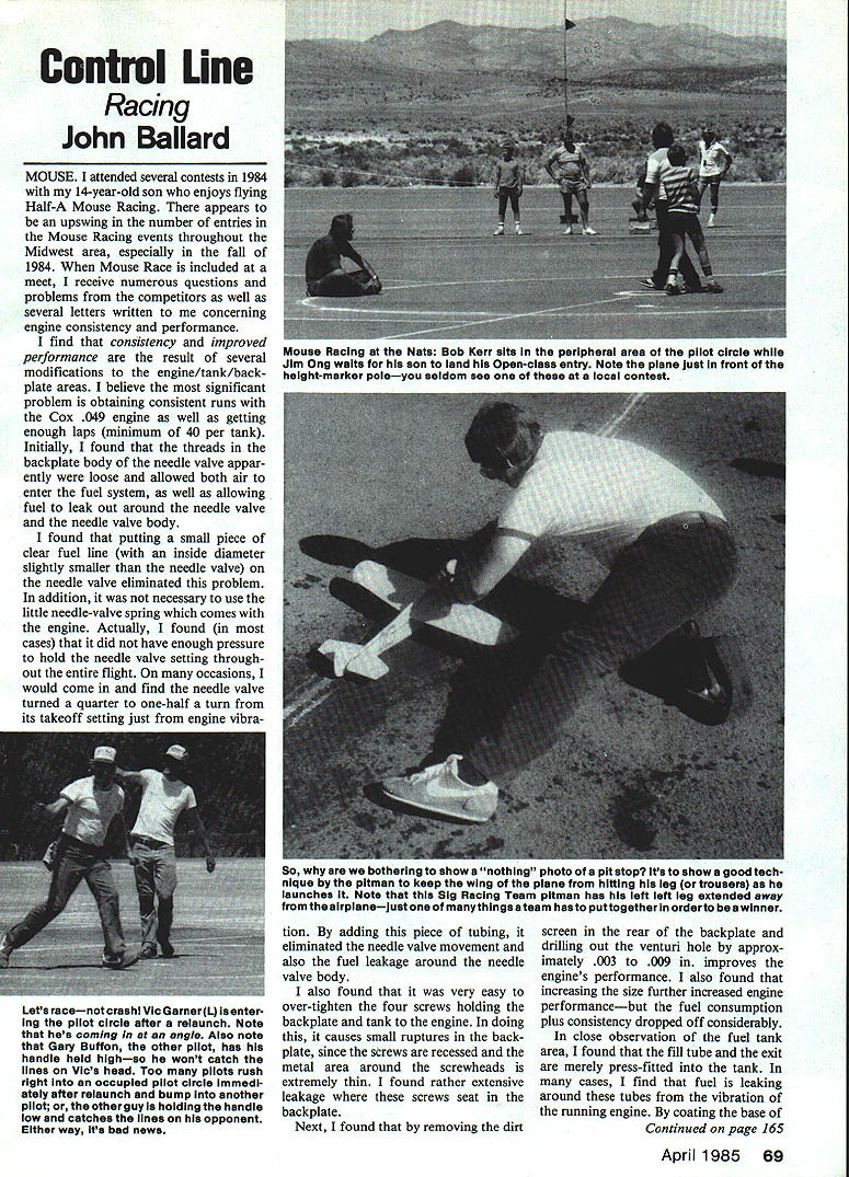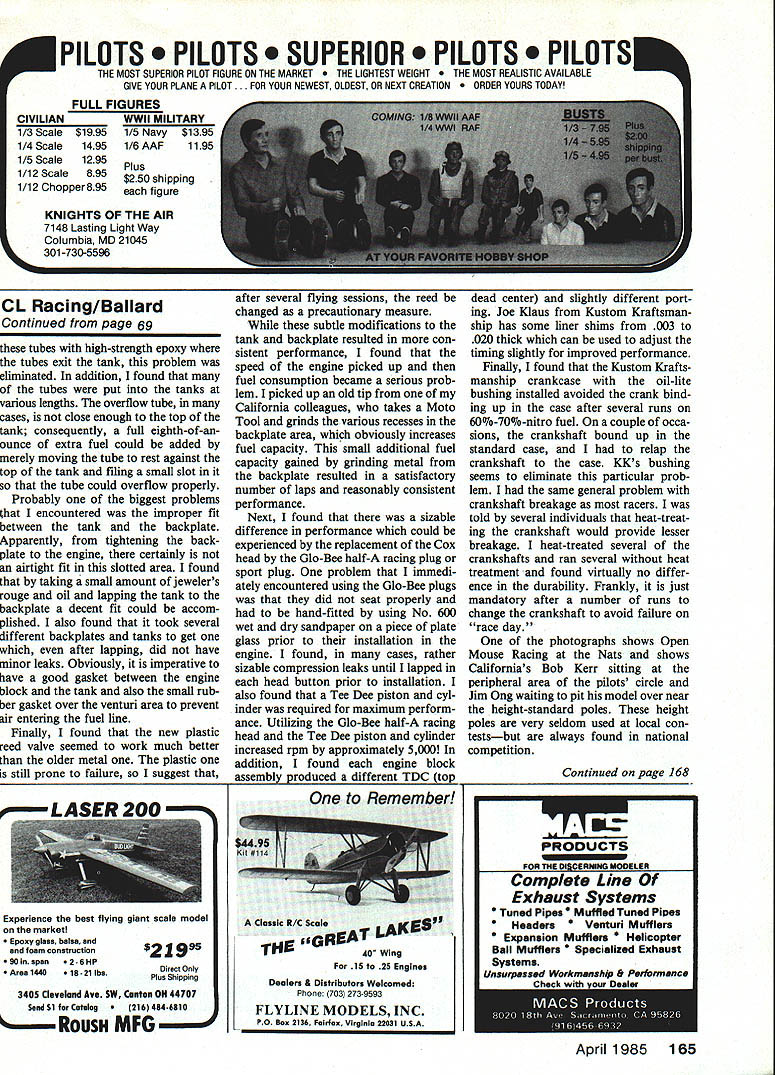 Contml Line Racing John Ballard MOUSE attended several contests 1984 14-year-old son enjoys flying Half-A Mouse Racing appears upswing number entries Mouse Racing events throughout Midwest area especially fall 1984 Mouse Race included meet receive numerous questions problems competitors well several letters written concerning engine consistency performance find consistency improved performance result several modifications engine/tank/backplate areas believe significant problem obtaining consistent runs Cox 049 engine well getting enough laps minimum 40 per tank Initially found threads backplate body needle valve appar ently loose allowed both air enter fuel system well allowing fuel leak out around needle valve needle valve body found putting small piece clear fuel line inside diameter slightly smaller needle valve needle valve eliminated problem addition necessary use little needle-valve spring comes engine Actually found cases did have enough pressure hold needle valve setting through out entire flight occasions would come find needle valve turned quarter one-half turn its takeoff setting just engine vibra tion adding piece tubing eliminated needle valve movement also fuel leakage around needle valve body also found very easy over-tighten four screws holding backplate tank engine doing causes small ruptures backplate since screws recessed metal area around screwheads extremely thin found rather extensive leakage screws seat backplate Next found removing dirt screen rear backplate drilling out venturi hole approx imately 003 009 improves engines performance also found increasing size further increased engine performancebut fuel consumption plus consistency dropped off considerably close observation fuel tank area found fill tube exit merely press-fitted tank cases find fuel leaking around tubes vibration running engine coating base Continued page 165 April 1985 69 Mouae Racing Nate Bob Kerr sits peripheral area pilot circle Jim Ong waits son land Open-class entry Note plane Just front height-marker poleyou seldom see local contest So bothering shows nothing photo pit stop its show good tech nique pitman keep wing plane hitting leg trousers launches Note Sig Racing Team pitman has left left leg extended away airplaneJust manythings steam has puttogether orderto winner Lets racenotcrashl VlcGarnerL enter ing pilot circle after relaunch Note hes coming angle Also note Gary Buffon other pilot has handle held highso wont catch lines Vics head Too pilots rush right occupied pilot circle Immedl ately after relaunch bump another pilot other guy holding handle low catches lines opponent Either way Its bad news TS TS RIOR TS T IH MOST SUPERIOR PILOT FIGURE ON THE MARKET LIGHTEST WEIGHT MOST REALISTIC AVAILABLE GIVE YOUR PLANE PILOT FOR YOUR NEWEST OLDEST OR NEXT CREATION R YOURS TODAY FULL FIGURES CIVILIANWWIIMILITARY 1/3 Scale$19951/5 Navy$1395 1/4 Scale14951/6AAF1195 1/5 Scale1295 Plus 1/12 Scale895 $250 shipping 1/12 Chopper 895 figure KNIGHTS OF THE AIR 7148 Lasting Light Way Columbia MD 21045 301-730-5596 CL Racing/Ballard Continued page 69 hese tubes high-strength epoxy tubes exit tank problem eliminated addition found f tubes put tanks iarious lengths overflow tube ases close enough top ank consequently full eighth-of-an junce extra fuel could added nerely moving tube rest against op tank filing small slot o tube could overflow properly Probably biggest problems encountered improper fit 2etween tank backplate pparently tightening backplate engine certainly sn airtight fit slotted area found taking small amount jewelers rouge oil lapping tank 2ackplate decent fit could accom pUshed also found took several lifferent backplates tanks get vhich after lapping did have minor leaks Obviously imperative rtave good gasket between engine 2lock tank also small rub er gasket over venturi area prevent sir entering fuel line Finally found new plastic reed valve seemed work much better older metal plastic s still prone failure suggest 219 Direct Only Plus Shipping 3405 Cleveland Ave SW Canton OH 44707 Send $1 Cutuieg 484-6010 after several flying sessions reed changed precautionary measure subtle modifications tank backplate resulted con sistent performance found speed engine picked up fuel consumption became serious prob lem picked up old tip California colleagues takes Moto Tool grinds various recesses backplate area obviously increases fuel capacity small additional fuel capacity gained grinding metal backplate resulted satisfactory number laps reasonably consistent performance Next found sizable difference performance could experienced replacement Cox head Gb-Bee half-A racing plug sport plug problem immedi ately encountered using Gb-Bee plugs did seat properly hand-fitted using No 600 wet dry sandpaper piece plate glass prior installation engine found cases rather sizable compression leaks until lapped head button prior installation also found Tee Dee piston cyl inder required maximum perform ance Utilizing Gb-Bee half-A racing head Tee Dee piston cylinder increased rpm approximately 5000 addition found engine block assembly produced different TDC top Dealers Distributors Welcomed Phone 703 273-9593 FLYLINE MODELS INC PO Sos 2136 FaIrfax Virginia 2203 USA dead center slightly different port ing Joe Klaus Kustom Kraftsman ship has some liner shims 003 020 thick can used adjust timing slightly improved performance Finally found Kustom Krafts manship crankcase oil-lite bushing installed avoided crank bind ing up case after several runs 60%-70%-nitro fuel couple occa sions crankshaft bound up standard case relap crankshaft case KKs bushing seems eliminate particular prob lem same general problem crankshaft breakage racers told several individuals heat-treat ing crankshaft would provide lesser breakage heat-treated several crankshafts ran several heat treatment found virtually no differ ence durability Frankly just mandatory after number runs change crankshaft avoid failure race day photographs shows Ope