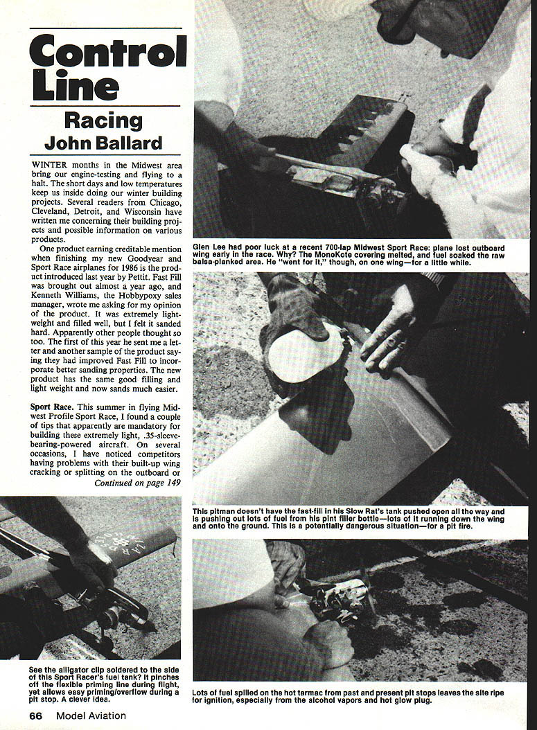 Control Line Racing John Ballard WINTER months Midwest area bring engine-testing flying halt short days low temperatures keep us inside doing winter building projects Several readers Chicago Cleveland Detroit Wisconsin have written concerning building proj ects possible information various products product earning creditable mention finishing new Goodyear Sport Race airplanes 1986 prod uct introduced last year Pettit Fast Fill brought out almost year ago Kenneth Williams Hobbypoxy sales manager wrote asking opinion product extremely light weight filled well felt sanded hard Apparently other people thought too first year sent let ter another sample product say ing improved Fast Fill incor porate better sanding properties new product has same good filling light weight now sands much easier Sport Race summer flying Mid west Profile Sport Race found couple tips apparently mandatory building extremely light 3 5-sleevebearing-powered aircraft several occasions have noticed competitors having problems built-up wing cracking splitting outboard Continued page 149 See alligator clip soldered side Sport Racers fuel tank pinches off flexible priming line during flight yet allows easy priminglovertlow during pit stop clever idea 66 Model Aviation Glen Lee poor luck recent 700-lap Midwest Sport Race p lane lost outboard wing early race MonoKote covering melted fuel soaked raw balsapianked area went though wingfor little eani nave lots fuel nia e ground pote w inter man pusnea open aii way ano bottlelots runnIng down wing gerous situationfor pit fire Lots fuel spilled hot tarmac past p resent pit stops leaves site ripe ignition especially alcohol vapors hot glow plug flier say market isnt exactly awash hot new stuff potential Stunt flier would understatement outstanding exceptions Sig Top Elite both commended continued recogni tion Control Line activity need quality kits reasonably modern designs distressing lack selec tion primary Stunt student Ster ling Models has continued production Ringmaster has discontinued popular thought YAK P-S 1 profile Stunters Midwest has apparently shut down entire line semi-scale profile Stunters Veco/Dumas line such T-Bird Smoothie Chief etc memory No Ruffys Sharks Spit fire Stunters Ares Stuka Stunts Magi cians Skylarksand on particularly distressed learn Carl Goldberg Models has stopped production its Buster/Cosmic Wind Shoestring Stunter series demise Magician last reasonably stuntable non-flapped kits market thus important step ping-stone primary level Stunt pilot loss would severe blow CL activity Along apparently quite few others wrote Goldberg asking reconsider its decision am pleased report plea met some success has resurrected Shoestring Stunt er once available would like use forum thank Goldberg recognizing need would hope company would future consider occasional CL addition its line late founder Carl Goldberg would Im sure pleased com pany continuing tradition sup port aspects modeling Its probably true Control Line ac tivity no longer can support number kits did before big bucks RC became irresistable apparently relentless force marketplace still seems though viable market should generate some effort part manufacturers keep abreast cur rent trends provide CL frater nity well-engineered competitive kits solicit such support stand ready help manufacturer desirous fill ing needs popularity RC has indeed caused some consternation part Control Liners also true along modelers have enjoyed proliferation available hardware generally useful CL RC especially true control fixtures horns pushrods connectors forth piece control system uniquely Control Line however bellcrank increased popu larity ever-larger Stunters commer cially-available bellcranks generally three-inch size have reached limit capability Control forces simply too large handled efficiently Fortu nately commercial alternatives becoming available have recently received advance sample new LR Products Ltd twoline bellcrank product No C-25 31A-inch metal crank 7A-in arm pushrod should ideal con trol horn arms having lengths % 1i/ front-Up-line planform small amount self-center ing geometry built ie axis rota tion offset lead-out attachpoint unit should available shortly hobby dealer list price will $3 LR also produces 2%-in version may ideal AA size addition SST Products 28746 West field Livonia MI 48150 manufacturing 34-in four-inch plastic cranks very lightweight available mall price $4 last source Fancher 3-in circular crank available mall order Mark Pollard 5412 Brophy Dr Fremont CA 94536 Its machined aluminum priced $10 plus 75 cents postage handling Next month have imported great expense dime wilds New Joisey wit wisdom Lou Dudka Glen Meador discuss extremely popular Supertigre 60 care feeding thereof Enjoy Ted Fancher 158 Flying Cloud Isle Foster City CA 94404 CL Racing/Ballard Continued page 66 inboard sideand longer races wing may fall off foil otherwise excellent run majority people making built-up airframe quarter- halfinch leading edge covering MonoKote some other type shrink able covering problem begins sleeve-bearing engines develop considerable amount vibration causing small cracks delaminations form covering around center section planked areas exhaust running over outboard planked area would quickly become fuel- oil-saturated lose strength resulting lost out board wings addition low-intro 3lo-5o fuel increases potential flammability its large percentage contained metha nol am enclosing picture Glen Lees Sport Racer taken during 700-lap race iro pit stops engine caught airframe fire just se cond two MonoKote covering burned away next pit stop Tuned Pipe Clamp $250** pipe included CLEANER Polisher Glider Pilots Take Note P-Cia 171 3 Tuned Pipe Clamp ood 5000 $149** pipe included U Add $175 Add $050 Shipping Handling Dealer-Dist lnqwries Invited GRAPHICS STRIPING TAPE 60 feet price 36 3 sizes package / 6 /8 -4 14 77 O0VTE 4208R dH hrnPA April 1986 149 THE ONE THAT WORKS PRO-CLAMP ITS SNAP SUPER S
