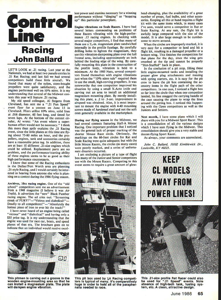 Control Line Racing John Ballard LETS LOOK 21 racing Last year Nationals least two pseudo entries 21 Rat Racing last fall several competitors build little aircraft found nylon store-bought propellers quite satisfactory engines performed well l0o nitro understanding several Midwest con tests year will feature 21 racing old speed colleague Al Stegens Cleveland has sent 21 Fun Speed event flyer contest June 15 Cleveland Fliers utilize 10% nitro solid lines 016 diameter 60 feet long timed seven laps bottom contest cir cular Al wrote An event super human effort would necessary think aptly explains 21 Racing event since little planes time fly ing about 75-80 miles hour pro pellers engines tank accessories certainly have reasonable price tag addition least 10 different 21-size engines could utilized Replacement parts no problem performance/starting ability engines seems good high-performance counterparts know some Racing enthusiasts Dallas/Fort Worth area planning 21-style Racing would certainly inter ested hearing anyone else plan ning contest during 1986 flying season Archives 10cc racing engine old school competitors sent advertisement 1948 magazine believe Air Trails advertises new Black Panther racing engine ad cries out Screaming streak FURY"Vicious diabolical Deadly competitors"Absolutely hottest piece iron ever hit track have never heard engine being called vicious diabolical having $35 price tag understanding engine used race car boats speed planes era brochure goes indicate individual would receive excellent power stamina necessary winning performance dinging hopping up particular powerplant Engine vibrations Scale Racers have several letters commenting problems Racers vibrating high-perfor mance 15 racing engines checking several major competitors find use 3/6-in magnesium plate sandwiched internally profile fuselage carefully drilling holes lighten magnesium use vibration-dampening plate over full frontal area including approximately inch behind leading edge wing care fully mounting plate construction profile body vibration held minimum 1985 Nats several competi tors found themselves engine vibrations just 10% nitro rule required use small high-revving propellers noteworthy competitor improved situation using small X-Acto knife carving out area install additional magnesium mounting plate merely install ing plate 2 3-sec improvement airspeed obtained Also impor tant mount engine 4-40 mounting screws made hardened steel soft ones generally available marketplace During flying season Midwest several contests featuring Half-A Mouse Racing important problem noticed general lack proper marking shorter Mouse Race circle Obviously markings 60-foot circles Rat Scale Racing quite adequate little Mouse Racers circles cases poorly marked series unfortu nate disasters occurred am enclosing picture type flight box Junior Senior competitors use Mouse Racers Competing event seems require great amount glowhead-changing plus availability great number props fuel bulbs other acces sories Keeping hand requires flight kit same items cases Ive seen would serve competitor Rat Scale Racing rate flight kit awfully large compared size model also large enough cumber some move around circles improperly marked very easy competitor land hit flight kit resulting damaged propeller broken wing finishes competition plane day since wing gets smashed tip cannot properly Hot-Stuffed back place confusion pit stop filling little engine-mounted tanks installing proper glow plug attachments messing spring starters etc easy pit crew leave pit box containing ac cessory items flight path other competitors case noticed flight box far circle competitor landed line snagged carrying handle case causing plane wrap lines around pitting box noticed happen ing Open competitors well Juniors Seniors Next month have some plans will share Midwest Sport Racer consolidation various designs have seen flying Midwest consolidation should give very stable decent-flying Sport Racer As always comments appreciated June1986 65 John C Ballard 10102 Kimllewick Dr Louisville KY 40223 pitman carving out groove wooden engine-mounting area can install magnesium plate plate will dampen engine vibration pit box used 1AA Racing competi tors typical Its comparatively huge order hold parapher nalia needed race 21-size profile Rat Racer could also used 21 Speed events Note absence high-tech tank fueling sys tem etc clean attractive design