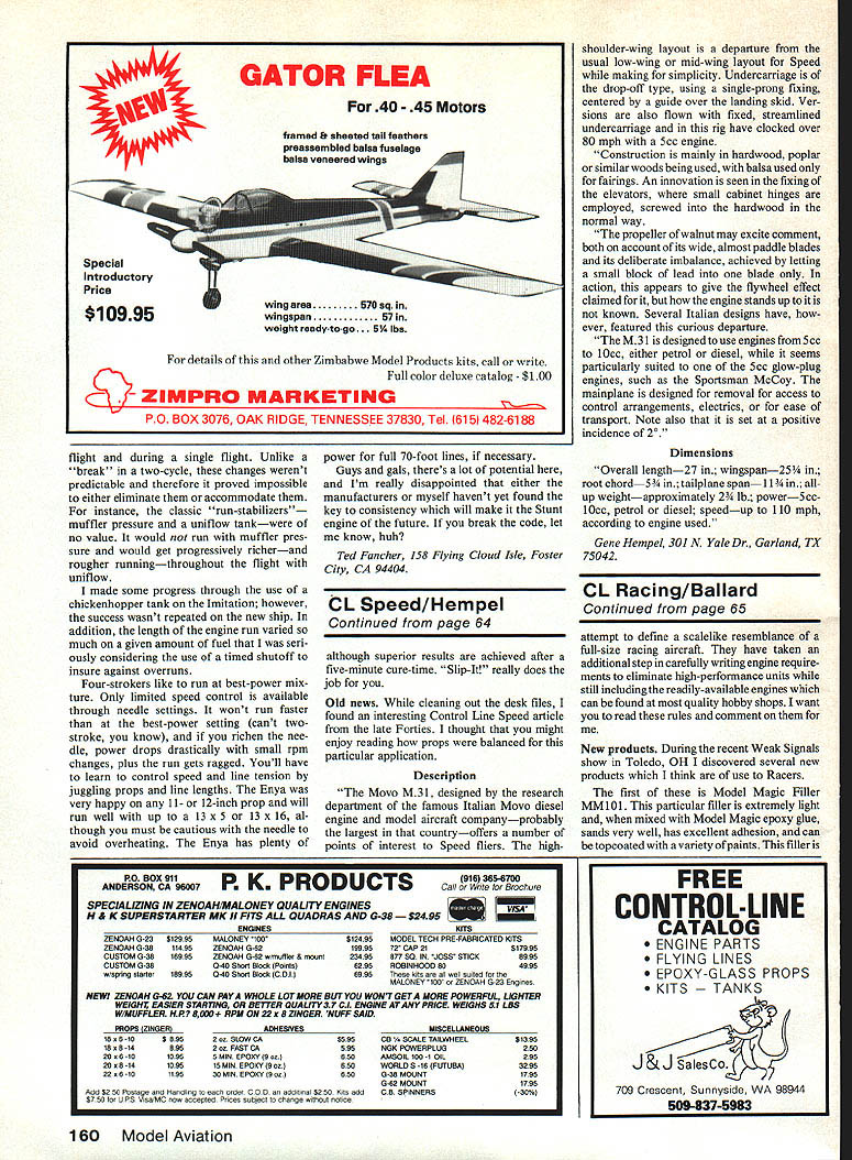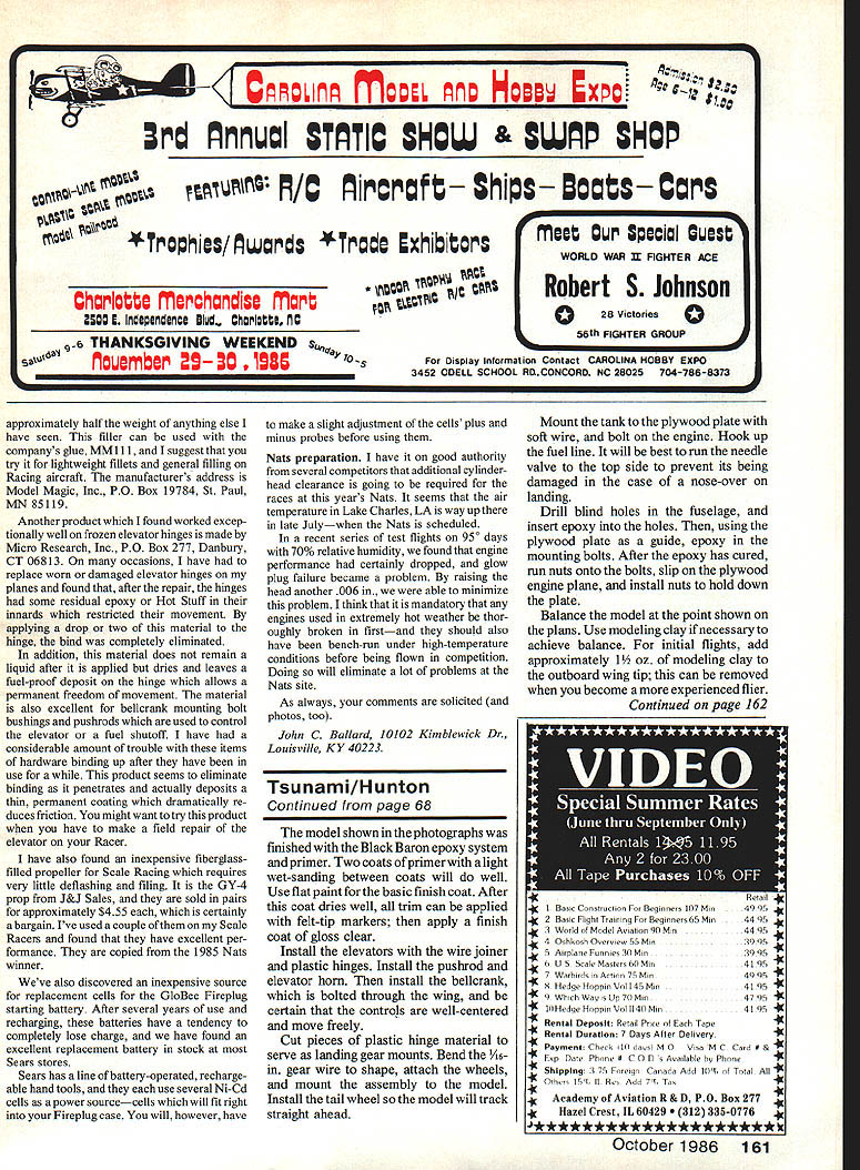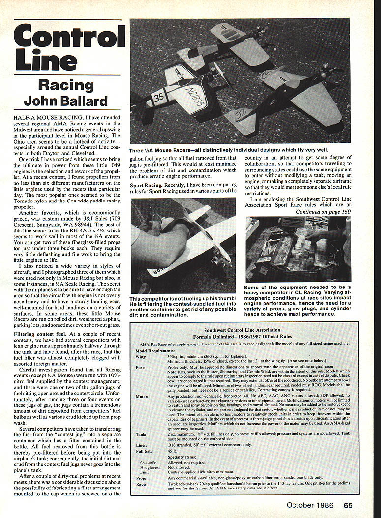 Control Line Racing John Ballard HALF-A MOUSE RACING have attended several regional AMA Racing events Midwest area have noticed general upswing participant level Mouse Racing Ohio area seems hotbed activity especially around annual Control Line con tests both Dayton Cleveland trick have noticed seems bring ultimate power little 049 engines selection rework propel ler recent contest found propellers no less six different manufacturers little engines used racers particular day popular ones seemed Tornado nylon Cox wide-paddle racing propeller Another favorite economically priced custom made J&J Sales 709 Crescent Sunnyside WA 98944 best line seems RH-4A 5 x 4 seems work well events can get two fiberglass-filled props just under three bucks require very little deflashing file work bring little engines life also noticed wide variety styles aircraft photographed three used Mouse Racing also some instances Scale Racing secret airplanes sure have enough tail area aircraft engine overly nose-heavy have sturdy landing gear well-mounted hard landings variety surfaces some areas little Mouse Racers run rolled dirt weathered asphalt parking lots sometimes short-cut grass Filtering contest fuel couple recent contests have several competitors lean engine runs approximately halfway through tank have found after race fuel filter almost completely clogged assorted foreign matter Careful investigation found Racing events except Mouse run 10%nitro fuel supplied contest management two gallon jugs fuel sitting open around contest circle Unfor tunately after running three four events jugs gas jugs contain tremendous amount dirt deposited competitors fuel bulbs well various crud kicked up prop wash Several competitors have taken transferring fuel contest jug separate container has filter contained bottle fuel removed bottle thereby pre-filtered before being put airplanes tank consequently initial dirt crud contest fuel jugs never goes planes tank After couple dirty-fuel problems recent meets considerable discussion about possibility fabricating filter arrangement mounted cap screwed onto Three 1/aA Mouse Racersall distinctively individual designs fly very well gallon fuel jug fuel removed thatcountry attempt get some degree jug pre-filtered would least minimizecollaboration competitors traveling problem dirt contamination whichsurrounding states could use same equipment produce erratic engine performanceto enter modifying tank moving engine making completely separate airframe would meet someone elses local rule restrictions am enclosing Southwest Control Line Association Sport Race rules Continued natee 160 Sport Racing Recently have comparing rules Sport Racing used various parts October 1986 65 competitor tueling up nis mumbl filtering contest-supplied fuel another container get rid possible dirt contamination Some equipment needed heavy competitor CL Racing Varying mospheric conditions race sites impact engine performance hence need variety props glow plugs cylinder heads achieve maxi performance Southwest Control Line Aasociation Formula Unlimlted1986/i987 Official Rules AMA Rat Race rules apply except intent race race easily scalelike models full-sized racing machine Model Reqoleemeats Wins390sq minimum 360 sq biplanes Minimum thickness 15% chord except last 2 wing tip Also see note below PoseProfile Muat appropriate dimensions approximate appearance original racer Note Kits such Buster Shoestring Cosmic Wind within intent role Models whieh appear comply role upon radimentary inspection need checked except iss case dispute Cheelt cowls encouraged bist required may extend 50% root chord No outboard sttcmptto cowl engine will allowed Minimum two-wheel landing gear required model ROG Models shall gaily painted hut oced replica scalelike Contrasting canopy required MotorAny production sr variable-area cas Ise venturi spi chrome used inte capabilities adequate spinner may used Tank2 maximum od fill lines no pressure fills allowed pressure fuel systems allowed Tank must mounted outboard side Lines018 stranded 60 6 external connectors Pull test45 lb Specially Items Shut-offsAllowed required Hot glovesNot allowed FuelContest-supplied 10% nitro maximum PropAny commercially-availshle non-glass/epoxy carbon fiber prop sanded blade RacesTwo back-to-hack 70-lap qualifications should ran prior 140-lap feature pit stop prelims two feature AMA race safety rules effect GATOR FLEA 40 45 Motors framed & sheeted tail feathers preassembled balsa fuselage balsa veneered wings details other Zimbaliwe Model Products kits call write Full color deluxe catalog -$100 J ZIM PRO MARKETING PO BOX 3076 OAK RIDGE TENNESSEE 37830 Tel 615 482-6188 flight during iingle flight Unlike break two-cycle changei werent predictable therefore proved impossible either eliminate accommodate instance classic run-stabilizers muffler pressure uniflow tankwere no value would run muffler pres sure would get progressively richerand rougher runningthroughout flight uniflow made some progress through use chickenhopper tank Imitation however success wasnt repeated new ship addition length engine run varied much given amount fuel seri ously considering use timed shutoff insure against overruns Four-strokers like run best-power mix ture Only limited speed control available through needle settings wont run faster best-power setting cant twostroke know richen nee dle power drops drastically small rpm changes plus run gets ragged Youll have learn control speed line tension juggling props line lengths Enya very happy 11- 12-inch prop will run well up 13 x 5 13 x 16 al though must cautious needle avoid overheating Enys has plenty power full 70-foot lines necessary Guys gals theres lot potential Im really disappointed either manufacturers myself havent yet found key consistency will make Stunt engine future break code let know huh Ted Fancher 158 Flying Cloud Isle Foster City CA 94404 CL Speed/Hempel Continued page 64 although superior results achieved after five-min