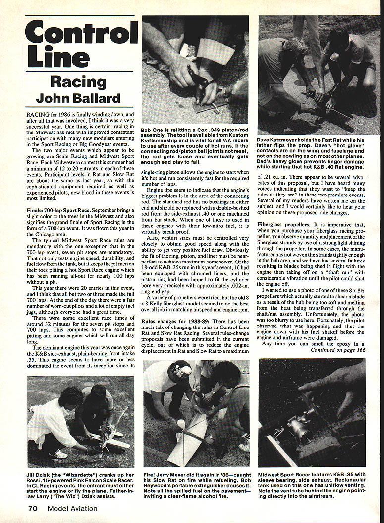 Control Line Racing John Ballard RACING 1986 finally winding down after involved think very successful year thing certain racing Midwest has met improved contestant participation new modelers entering Sport Racing Big Goodyear events two major events appear growing Scale Racing Midwest Sport Race Midwestern contest summer minimum 12 20 entrants events Participant levels Rat Slow Rat about same last year sophisticated equipment required well experienced pilots new blood events limited Finale 700-lap Sport Race September brings slight color trees Midwest also signifies grand finale Sport Racing form 700-lap event flown year Chicago area typical Midwest Sport Race rules mandatory exception 700-lap event seven pit stops mandatory tests engine speed durability fuel flow tank keeps pit men toes pitting hot Sport Race engine has running all-out nearly 100 laps pit year 20 entries event think two three made full 700 laps end day fair number worn-out pilots lot empty fuel jugs although everyone great time some excellent race times around 32 minutes seven pit stops 700 laps computes some excellent pitting some engines will run day long dominant engine year once again K&B side-exhaust plain-bearing front-intake 35 engine seems have less dominated event its inception since its singie-ring piston allows engine start its hot run consistently fast required number laps Engine tips seem indicate engines biggest problem area connecting rod standard rod has no bushings either end should replaced double-bushed rod side-exhaust 40 machined bar stock used engines low-nitro fuel virtually break proof Also venturi sizes must controlled very closely obtain good speed along ability get very positive fuel draw Obviously fit ring piston liner must nearperfect achieve maximum horsepower 18-odd K&B 35s run years event 16 equipped chromed liners piston ring lapped fit cylinder bore very precisely approximately 002-in ring end-gap variety propellers tried old 8 x 8 Kelly fiberglass model seemed best overall job matching airspeed engine rpm Rules changes 1988-89 has much talk changing rules Control Line Rat Slow Rat Racing Several rules-change proposals have submitted current cycle reduce engine displacement Rat Slow Rat maximum 21 cu appear several advo cates proposal have heard voices indicating want keep rules two premiere events Several readers have written subject would certainly like hear opinion proposed rule changes Fiberglass propellers imperative purchase fiberglass racing pro peller observe quantity placement fiberglass strands use strong light shining through propeller some cases manu facturer has woven strands tightly enough hub area have several failures resulting blades being shed flight engine taking off shaft run considerable vibration until pilot could shut engine off wanted use photo 8 x 8 propellers actually started shear blade result hub being too soft melting heat being transferred through shaft/nut assembly Unfortunately photo too blurry use Fortunately pilot observed what happening shut engine down fuel shutoff before engine airframe damaged Any time can smell epoxy Continued page 166 70 Model Aviation Bob Oge refitting Cox 049 piston/rod assembly Thetool isavailabiefrom Kustom Kraftsmanship vital 1/2A racers use after couple hot runs connecting rod/piston ball joint reset rod gets loose eventually gets enough end play fail Dave Katzmeyer holds Fast Rat father flips prop Daves hot glove contacts wing fuselage cowling other planes Dads heavy glove prevents finger damage starting hot K&B 40 Rat engine Jill Dziak Wizardette cranks up Rossi 15-powered Pink Falcon Scale Racer CL Racing events entrant must either start engine fly plane Father-in law Larry Wiz Dziak assists Firel Jerry Meyer did again 86caught Midwest Sport Racer features K&8 35 Slow Rat fire refueling Bob sleeve bearing side exhaust Rectangular Heywoods portable extinguisher douses tank used has uniflow venting Note spilled fuel pavement Notetheventtube behindtheenglne point inviting clear-flame alcohol fIre ing directly airstream Bought Colored Fuel Line YOU DEFINITELY PAID TOO MUCH Pay Fancy Colors ON ENGINE DETERMINES REQUIRED TUBING DIAMETER EXTRA LARGE 125 iD 250 001 SH-616 2FTPKG $135 SII-661 2$ FT ROLL $1325 LARGE 093 10- 215 GD SH-2901 FT PEG$ 89 SH-646 2 FT PKG 111$ SN-291 2$ FT ROLL $1295 MEDIUM 062 ID- 156 ODl 54-2851 FT PKG$ 90 SH-545 2 FT PKG $110 SN 28925FT ROLL. $1195 FUEL FITTING SIZE * Heat-Proof will melt resting dIrectly hotteSt part running model engine Wont Harden Fuelil'~ 9111 Resistant Cuts TearsNOT FOR GASOLINE Sig first introduce silicone fuel line tubing model aviation market way back 1964 premium tubing still comes its original natural white color Some competitors would have believe ad ding blue red yellow dye tubing charging higher price makes product better dont believe Sigs original silicone fuel tubing has important characteristics need quality fuel line None Better Any Price OR COLOR See dealer first available order direct Call 800-247-5003 toll free orders Latest Catalog $300 SIG MANUFACTURING CO INCMontezuma IA 50171 Say8 th8t old TinierjtGI st 550115 Gte1W$OflFrom this. peEt VtUQ. 1-eES TaOtS Mole 4 Ignition Engine Parts Only Over 600 items Send $200 current catalog performances Championships showed aeromodeling sport can unite competitors countries no matter good individual may perform love talking about model airplanes should also remembered dont go wont learn learning essential part improv ing performance contestants finished following order best speed kilometers per hour listed 1 Kalmikov USSR29363 2 Piskalev USSR28800 3 Mult Hungary 287534 Dodge USA28639 5 Choj nacki Poland28639 6 Szegadi Hungary 285267 KohaniukUSSR28191 8 Molnar Hungary28059 9 Rachwal Po land27993 10 Schuette USA27734 11 Novakowski Poland27522 12 Ding PRC27231 13 Zhu PRC27231 14 HalmanUK27 149 15 LiPRC 27027 16 Assen Bulgaria26905 17 Kabakov Bulgaria26745 18 Kales Yugo slavia26548 19 Bianchi Brazil26 181 20 Matilainin Finland257